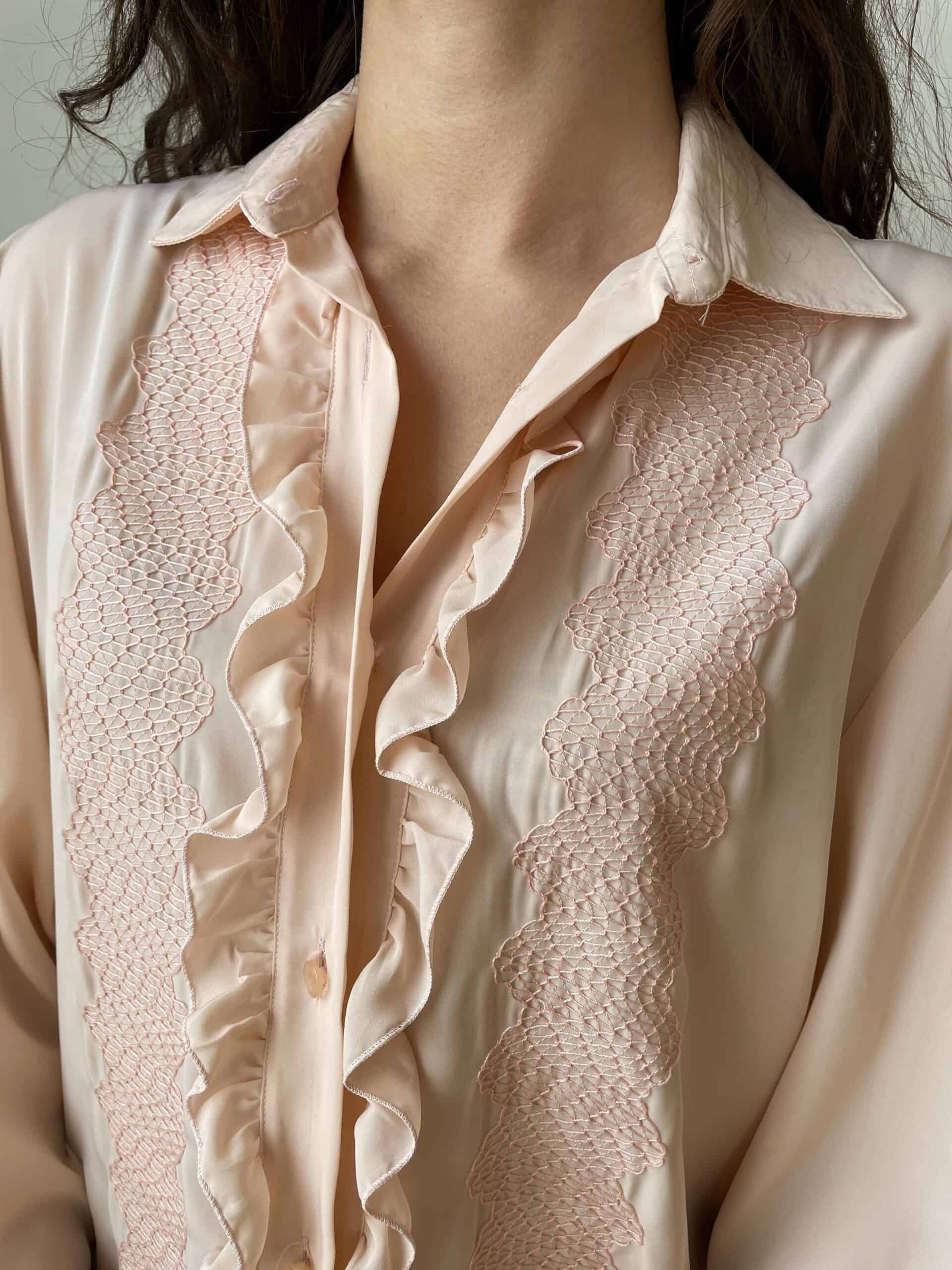 Camicia vintage rosa con ricami e rouches