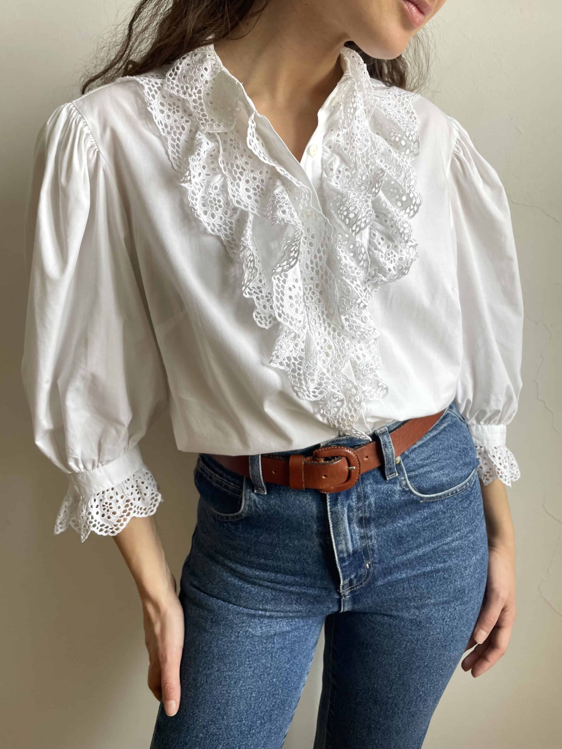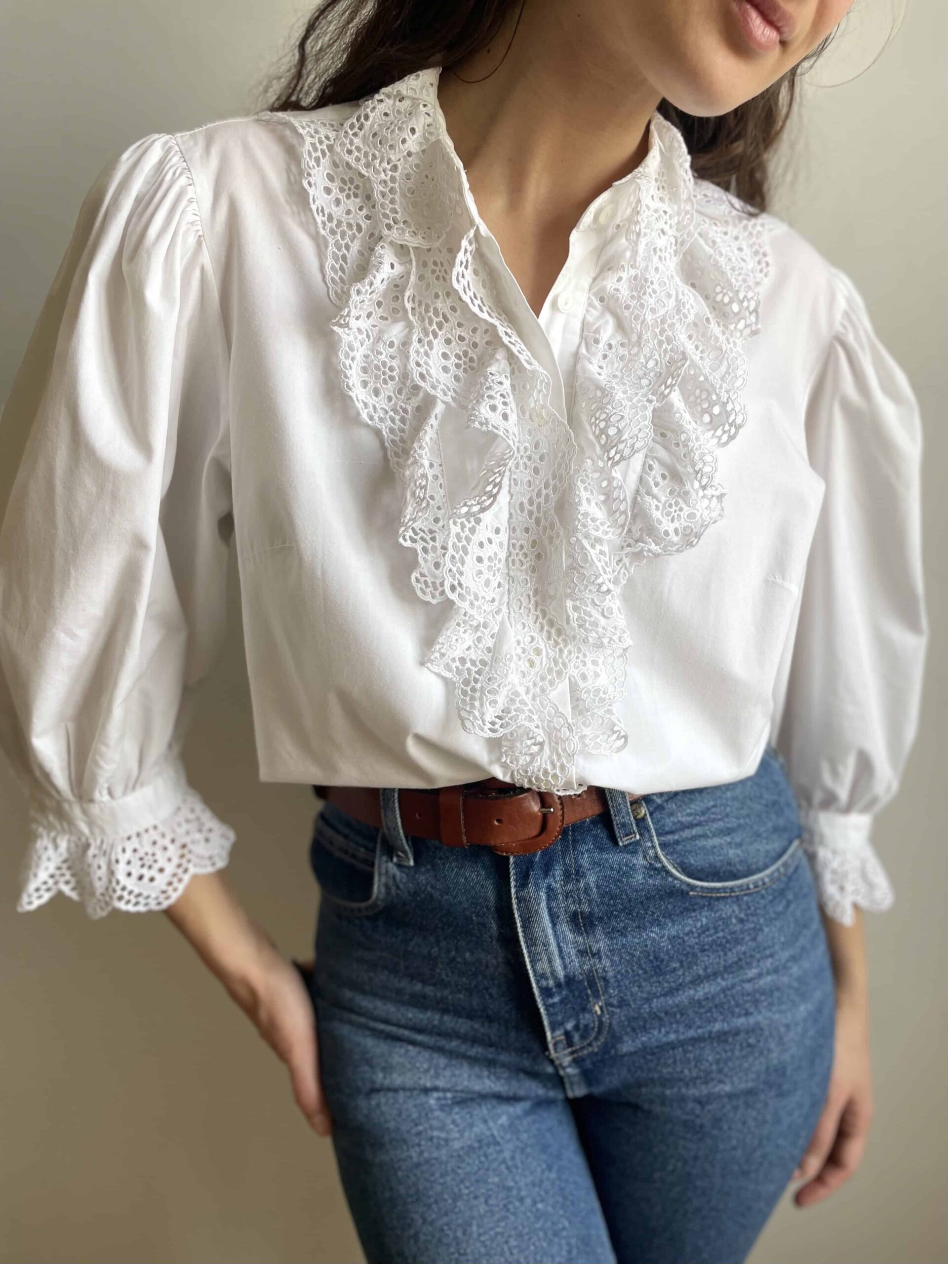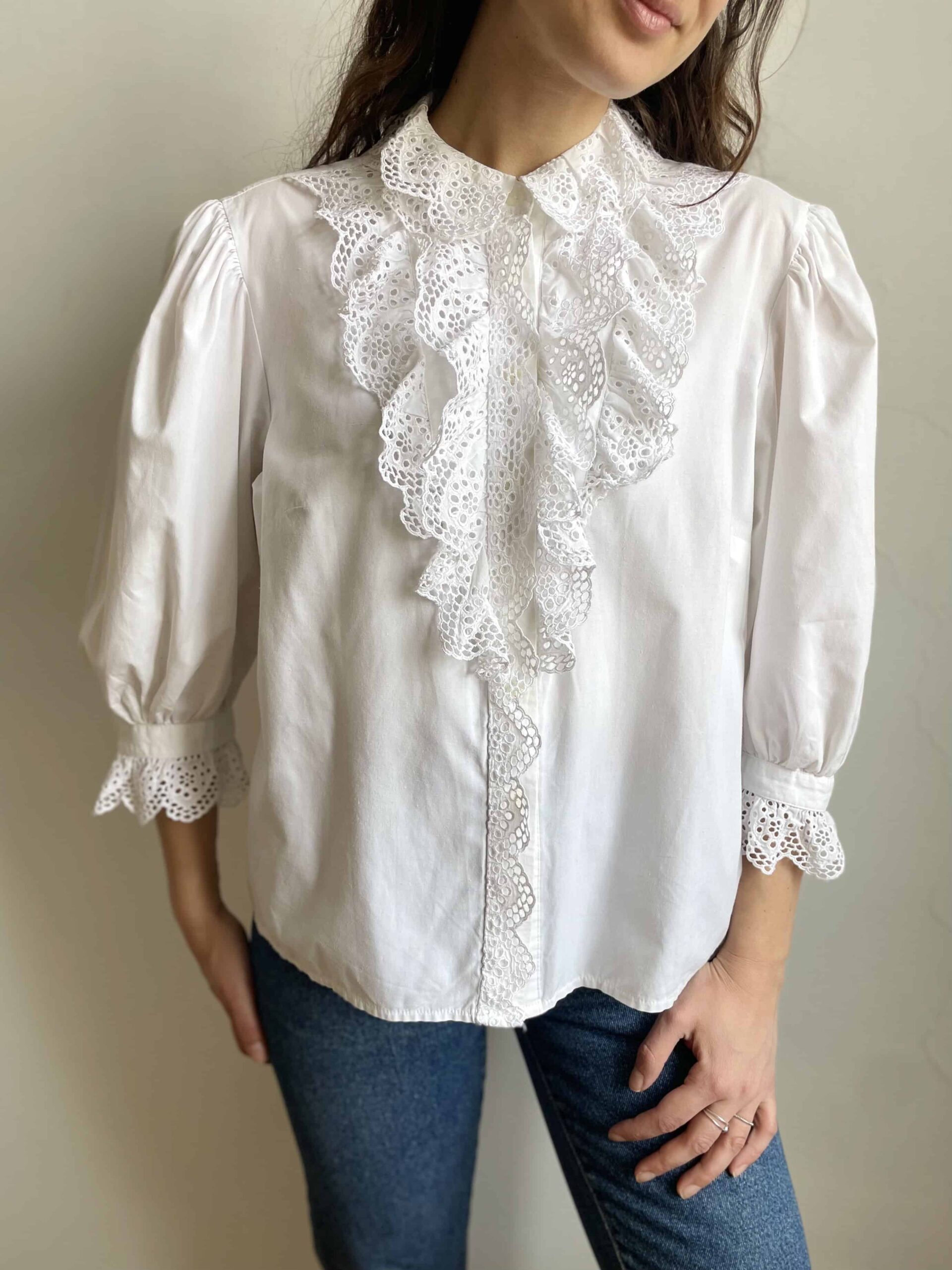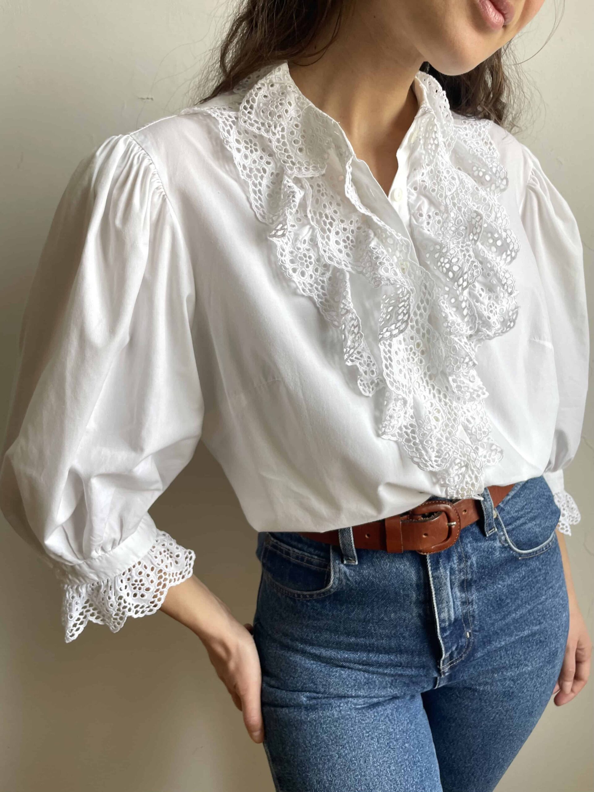 Camicia vintage tirolese misto cotone bianco con pizzo e ruches