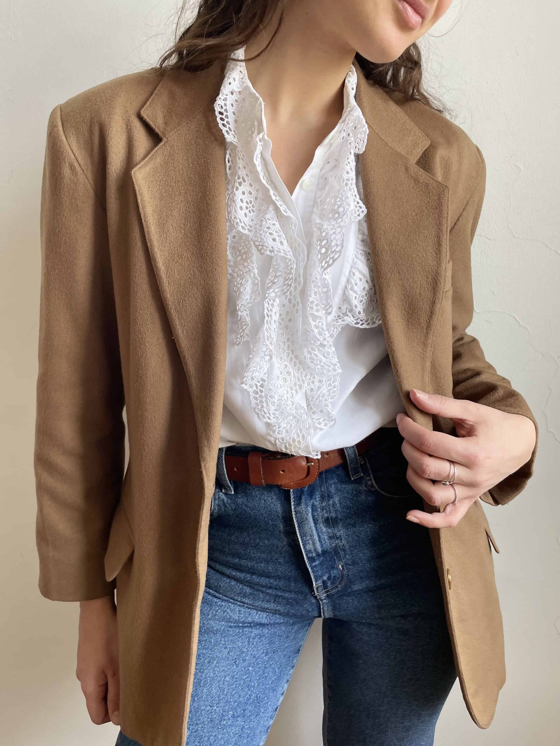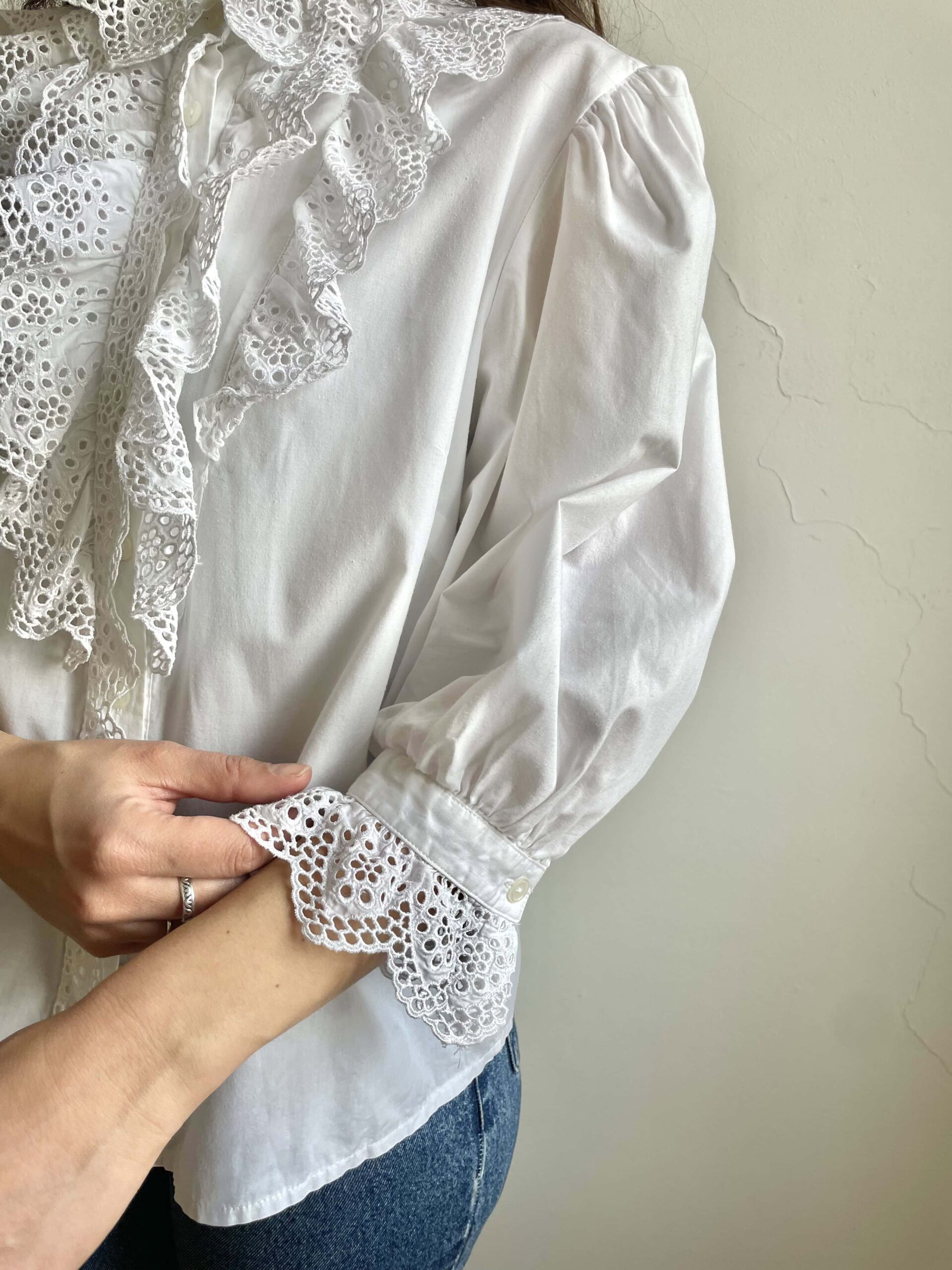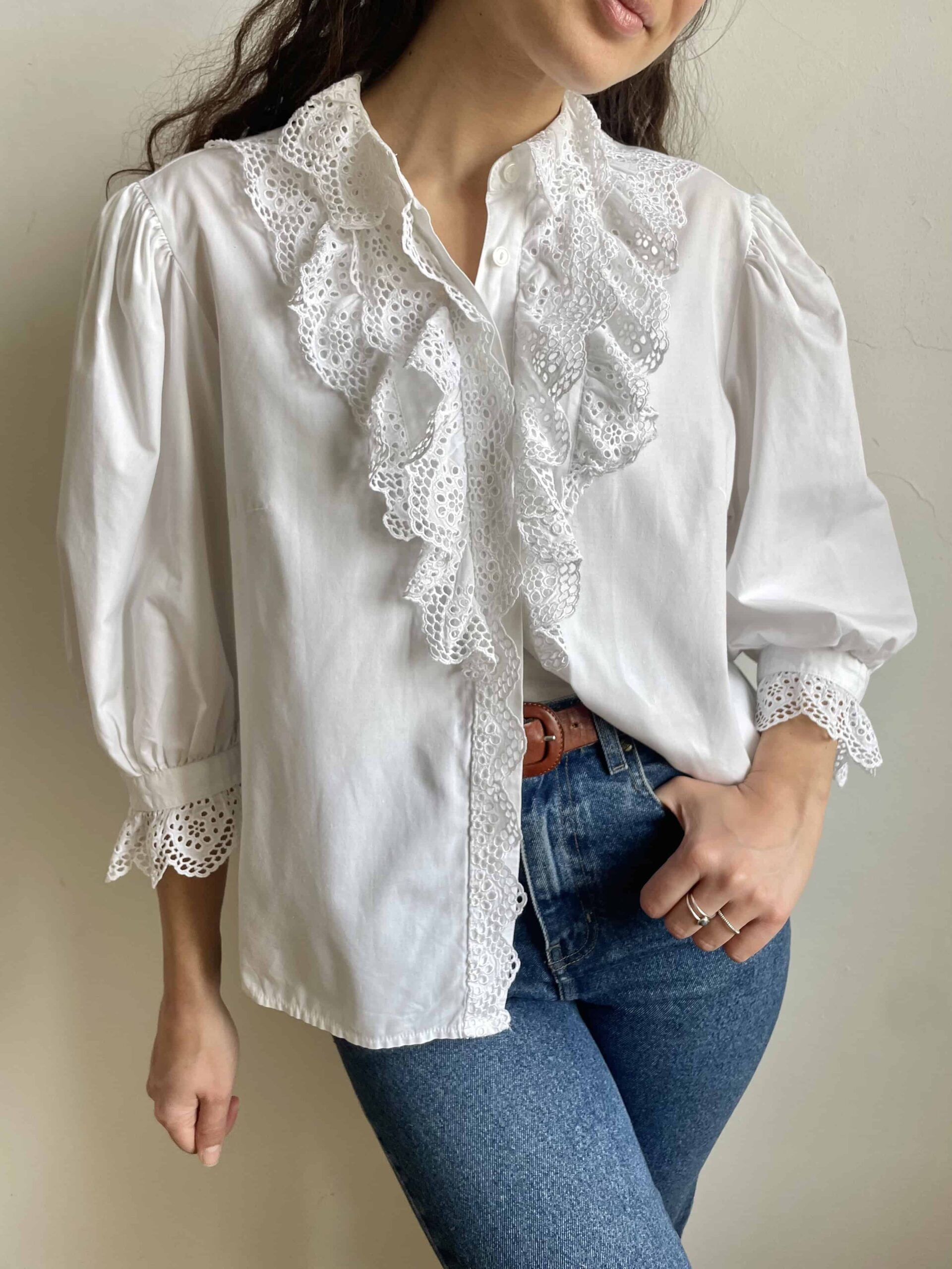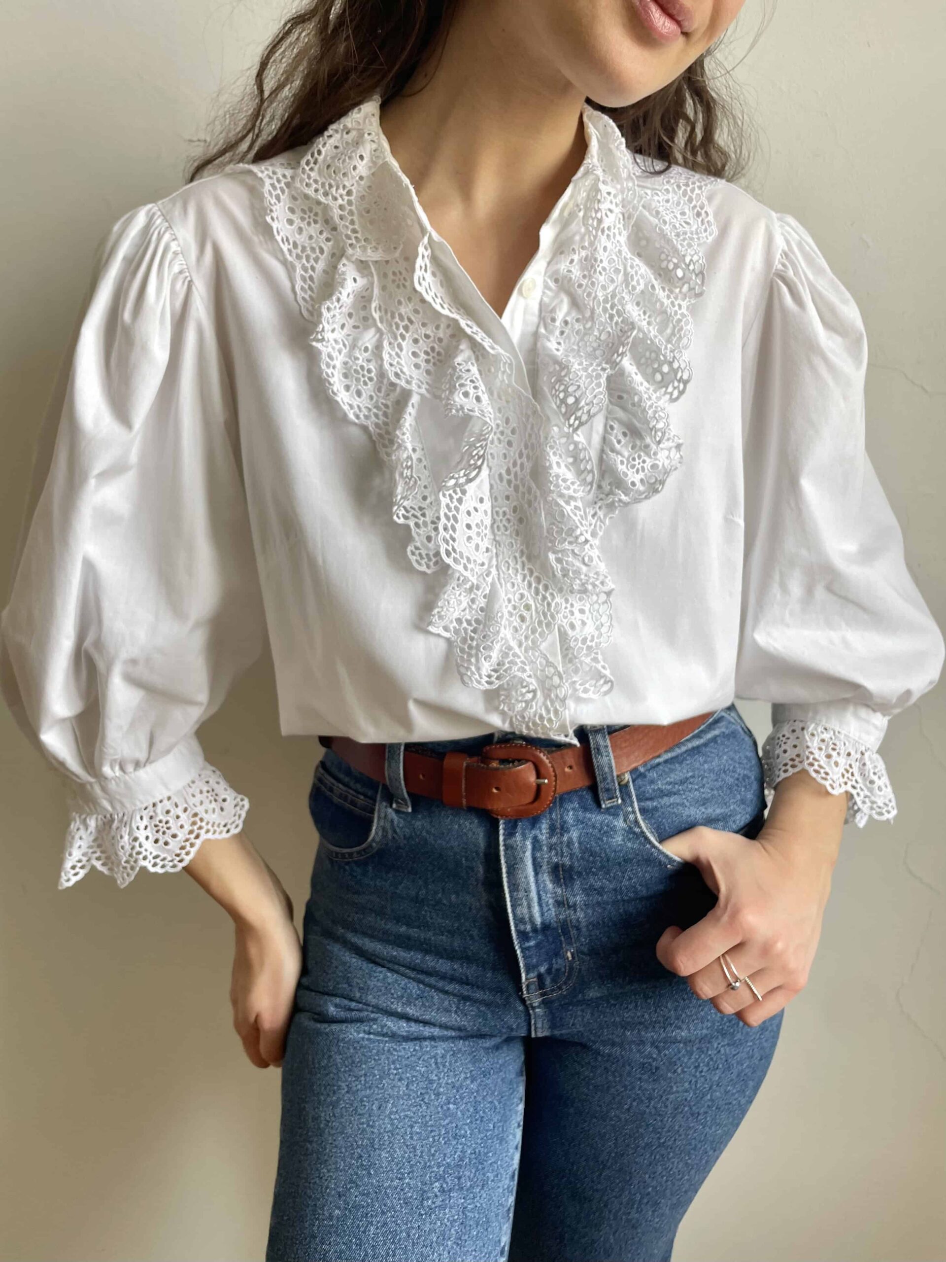 Camicia vintage tirolese misto cotone bianco con pizzo e ruches