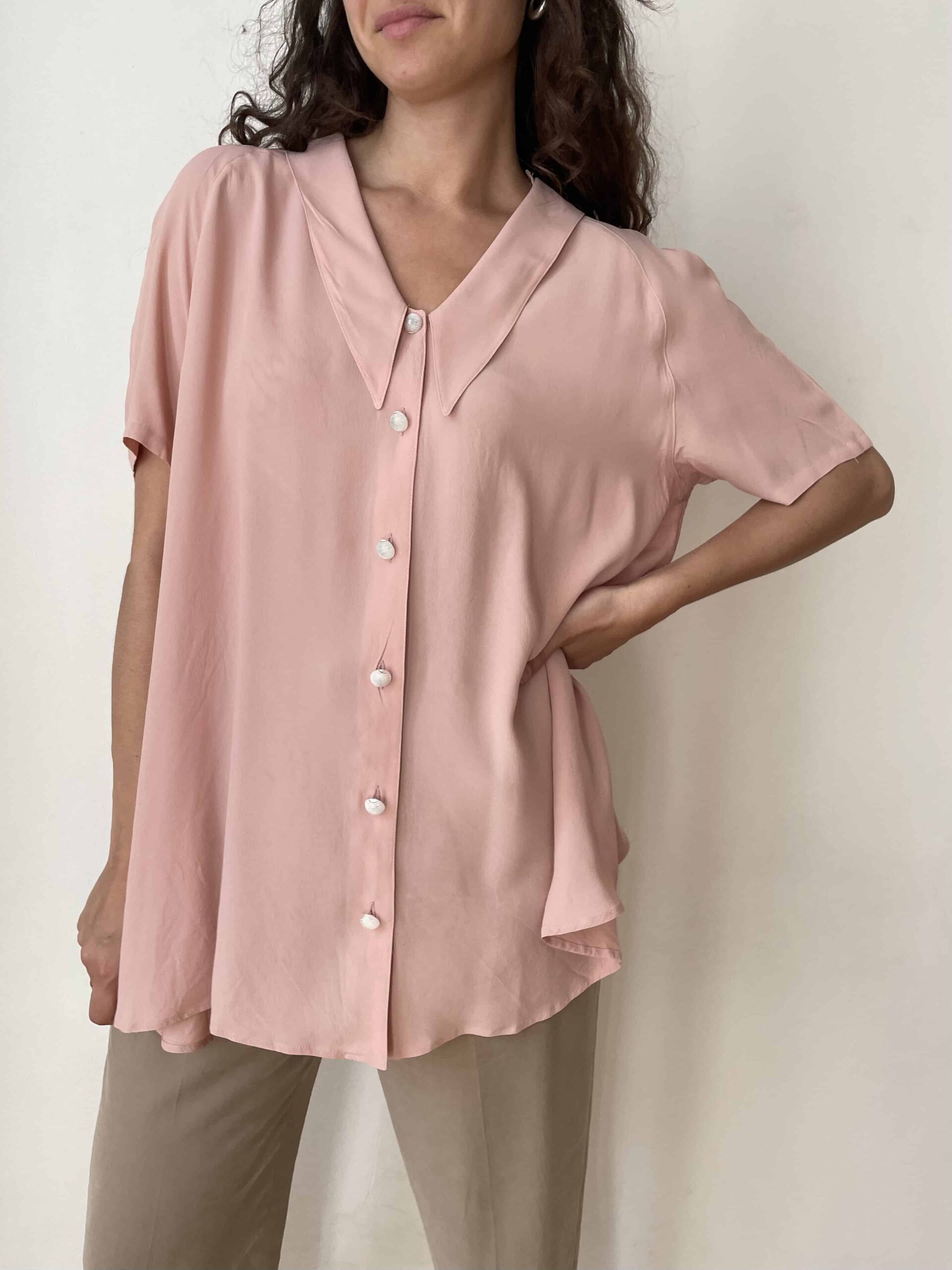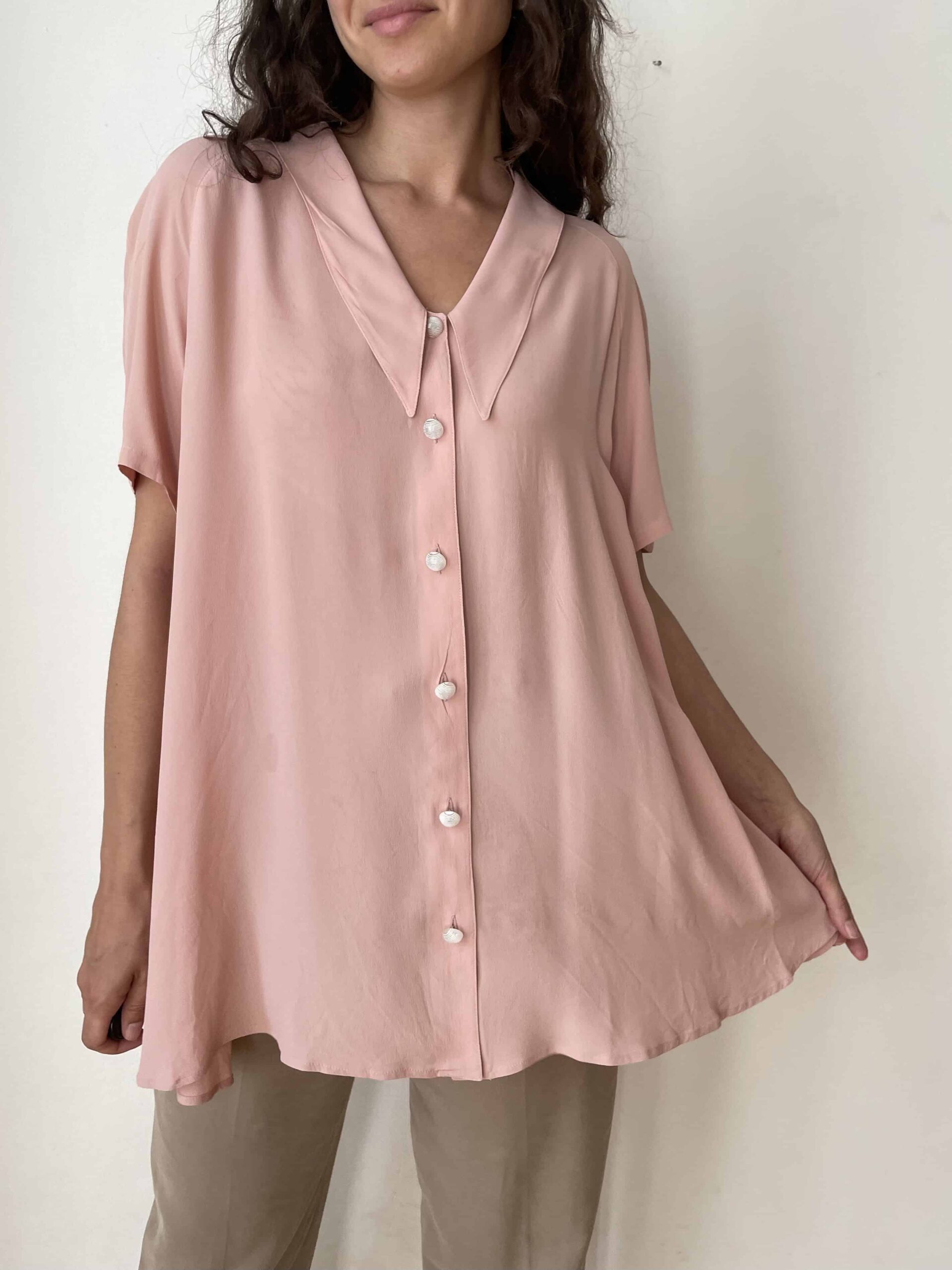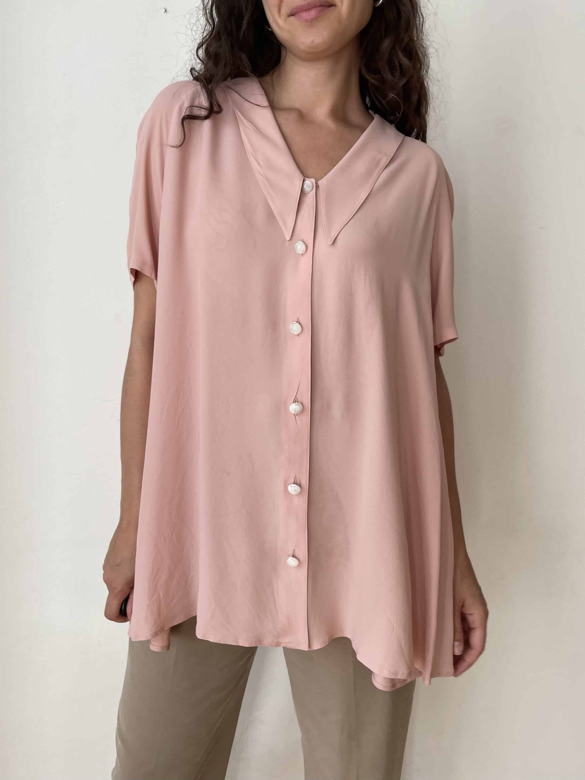 Maxi camicia vintage misto seta rosa e maxi colletto