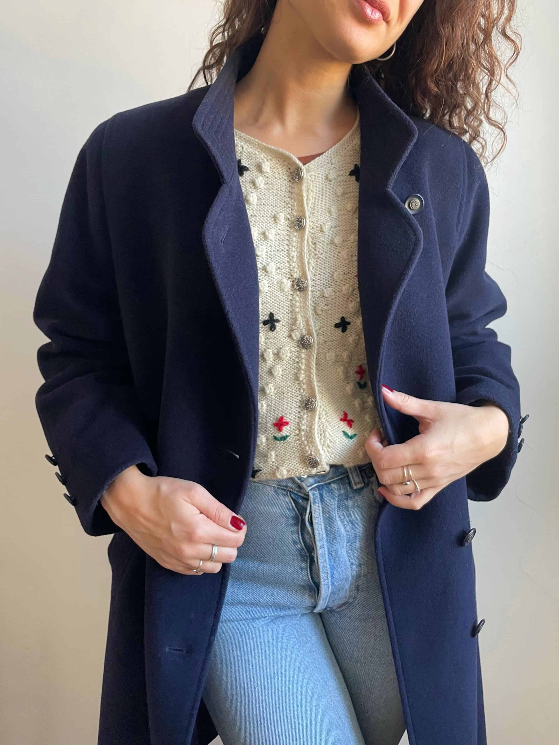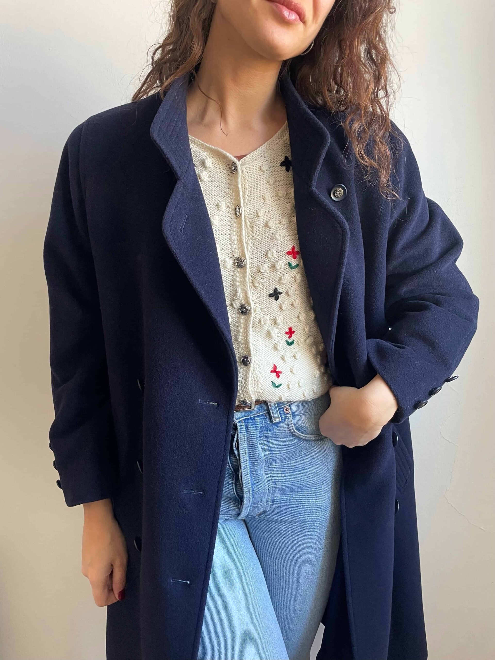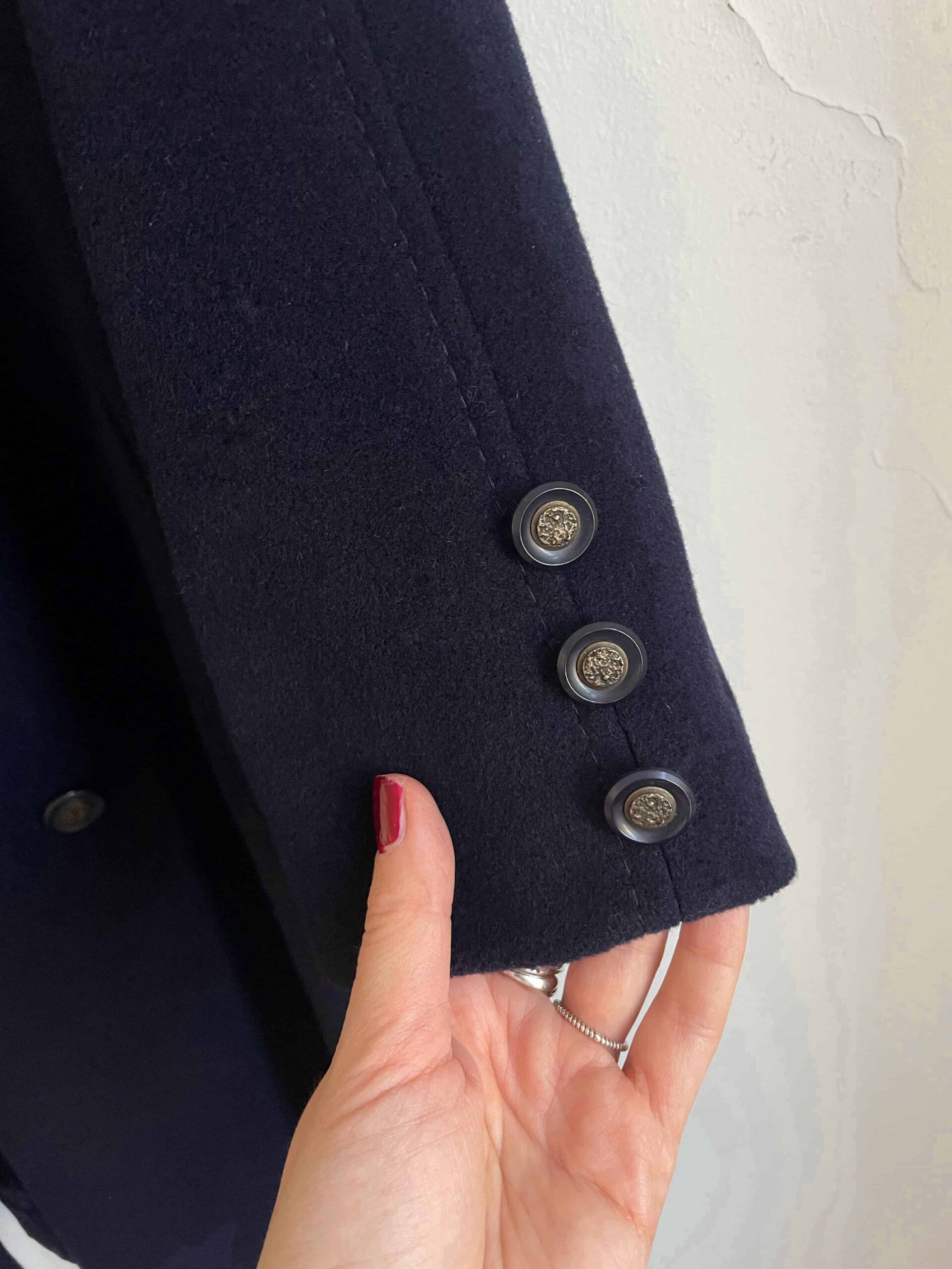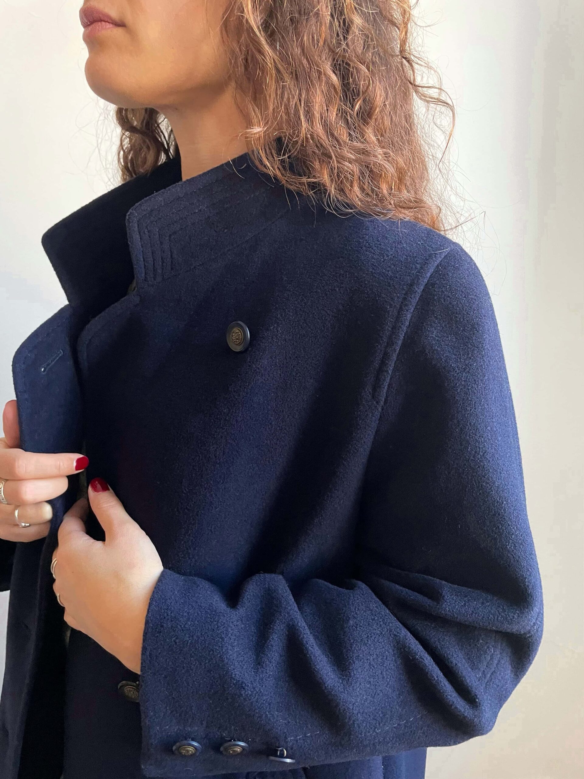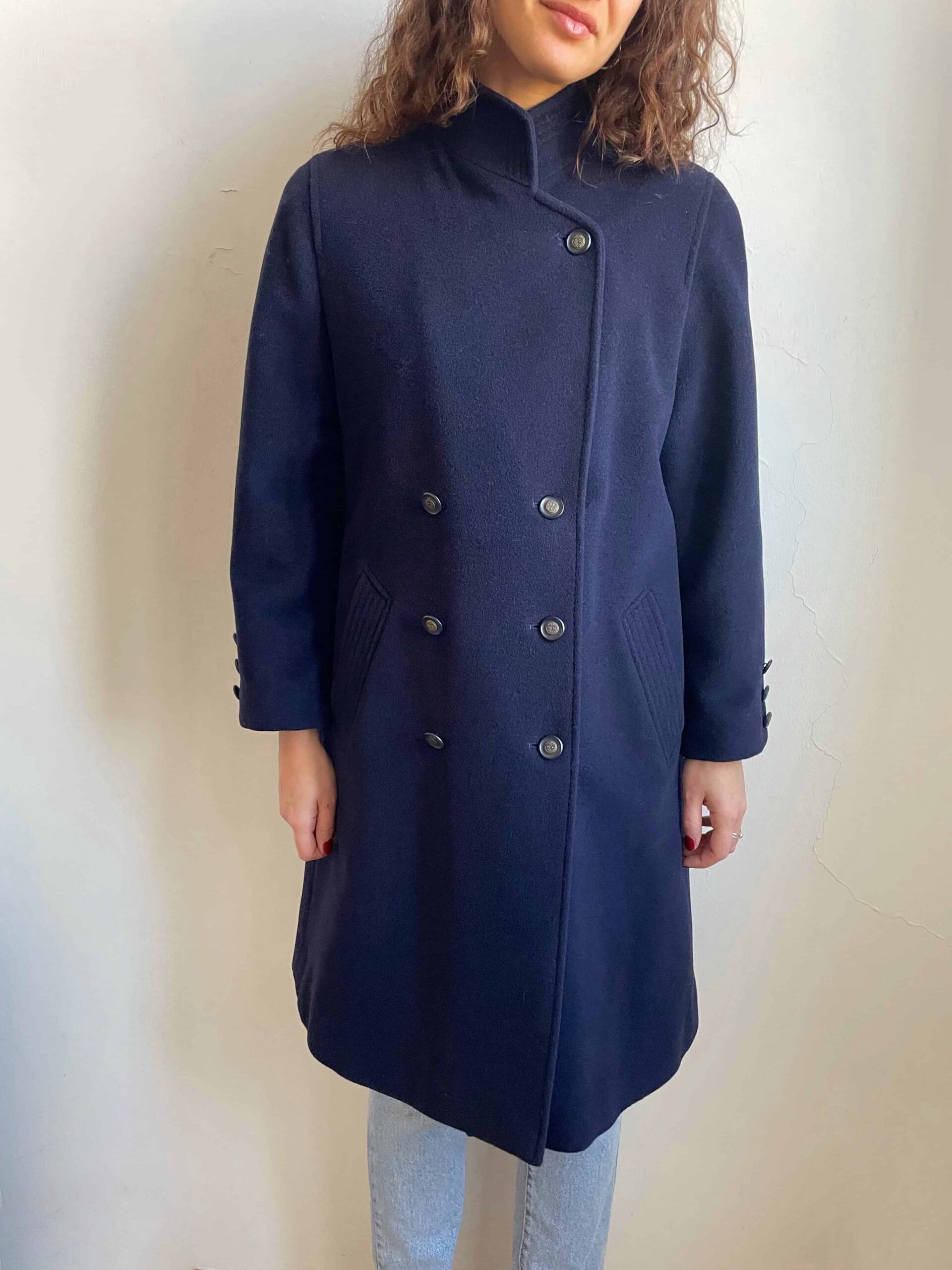 Splendido cappotto da donna vintage blu scuro in pregiata composizione tutta naturale in 95% lana e 5% cashmere. Il tessuto è spesso e molto caldo, di ottima qualità. Il cappotto ha una bellissima fattura, con collo alto, chiusura doppiopetto. Tre bottoni su ogni polsino. Spacco sul retro. Con fodera interna. Bella vestibilità per niente abbondante, che sta molto bene anche sulle spalle non essendo imbottite. Taglia indicativa 42, massimo 42 abbondante. Fate riferimento alle misure confrontandole con quelle di un vostro capotto: