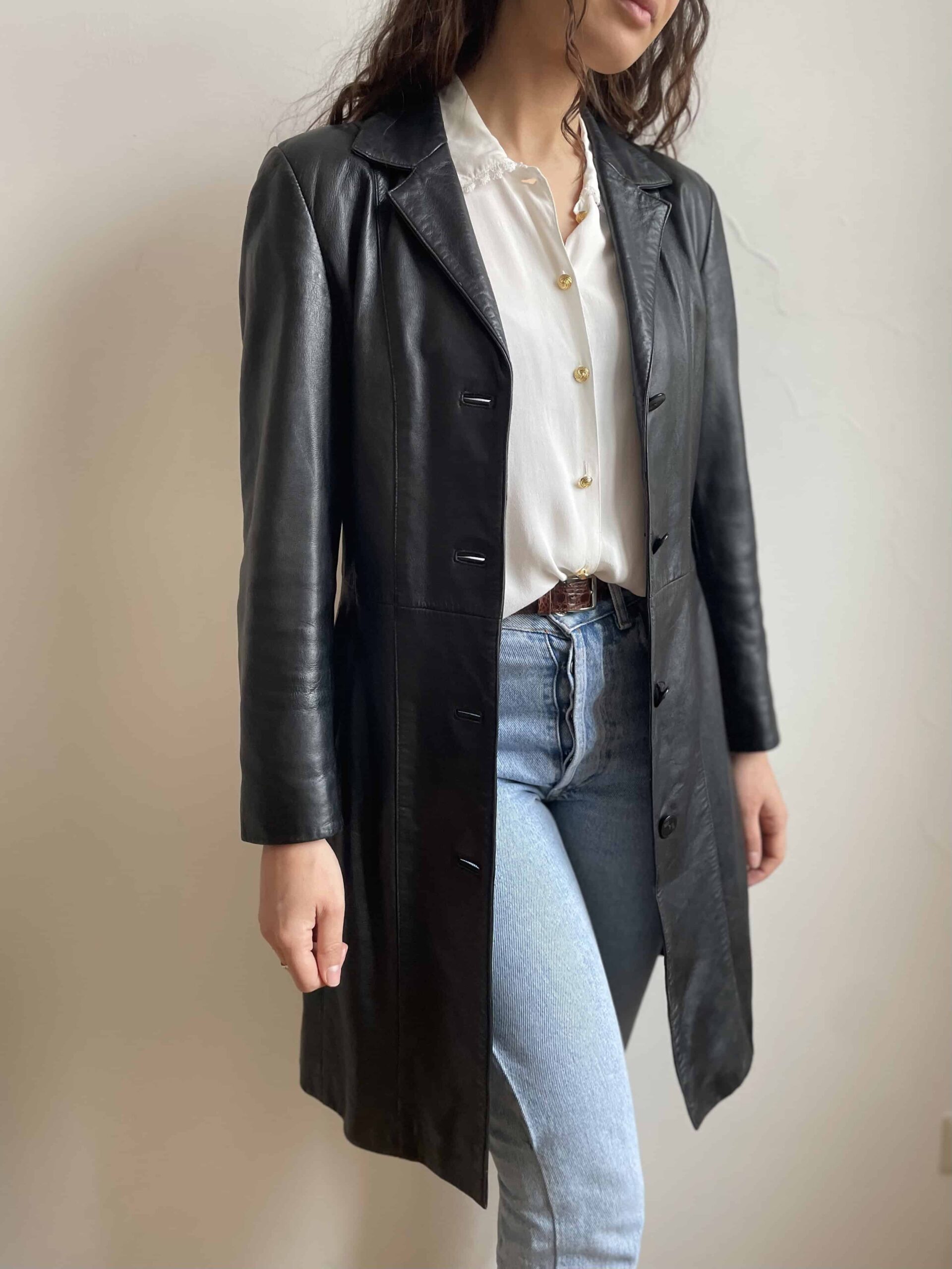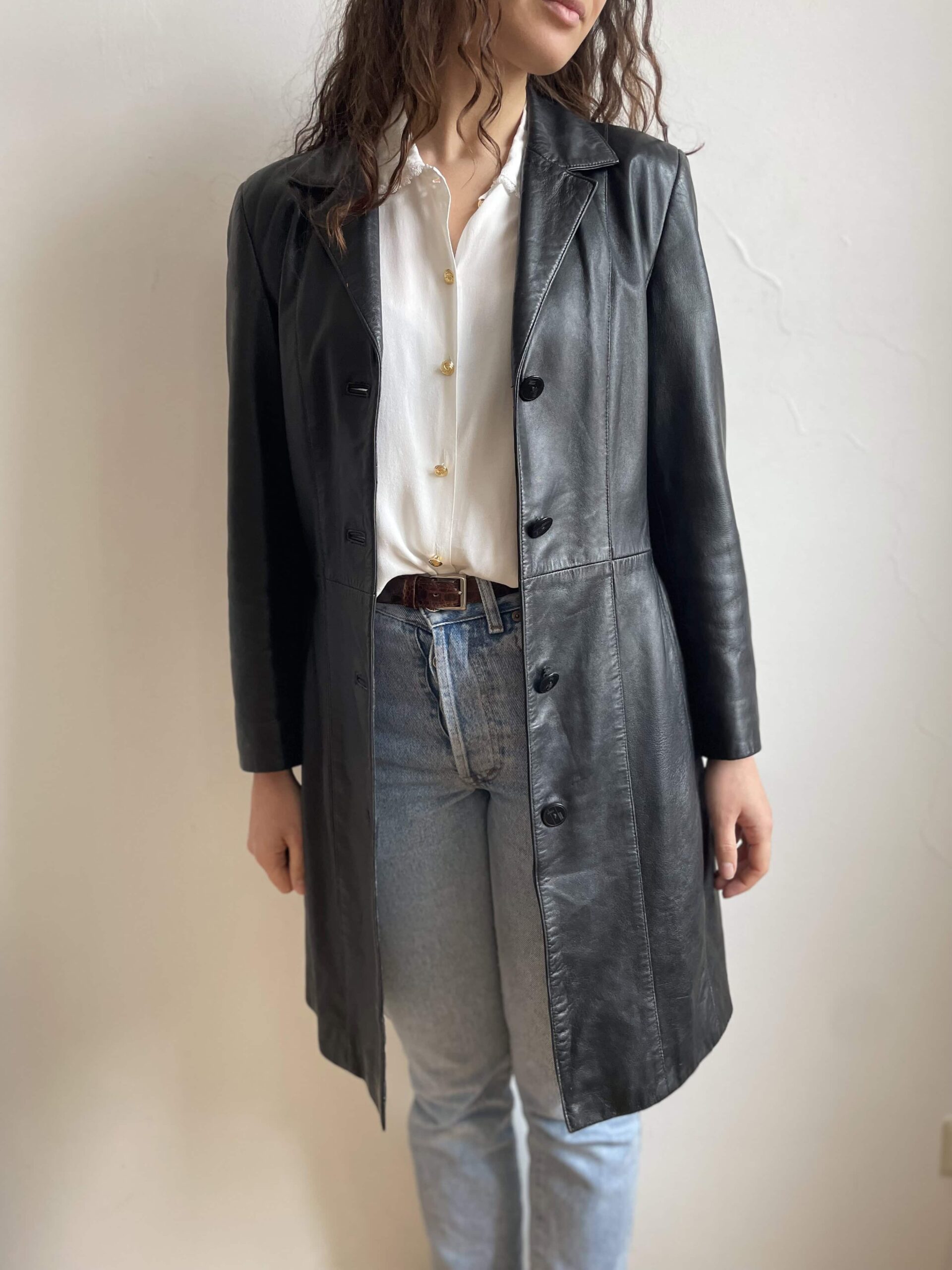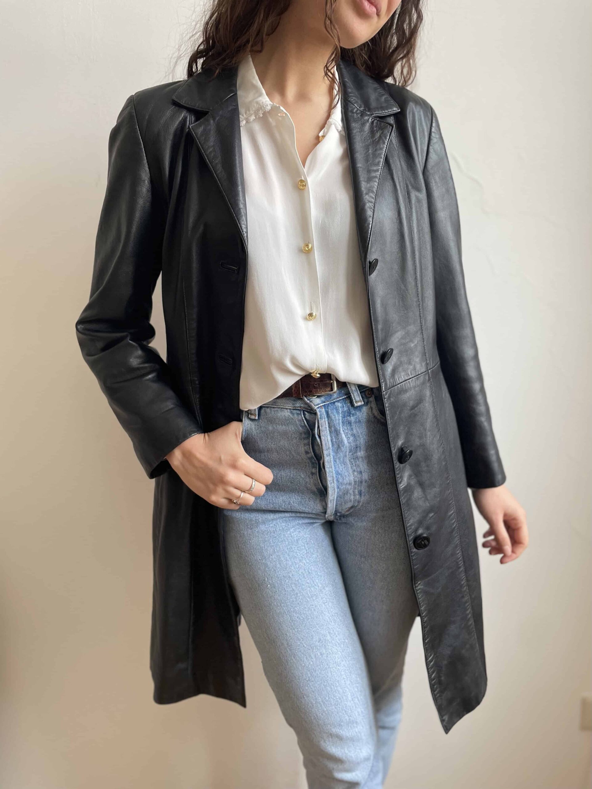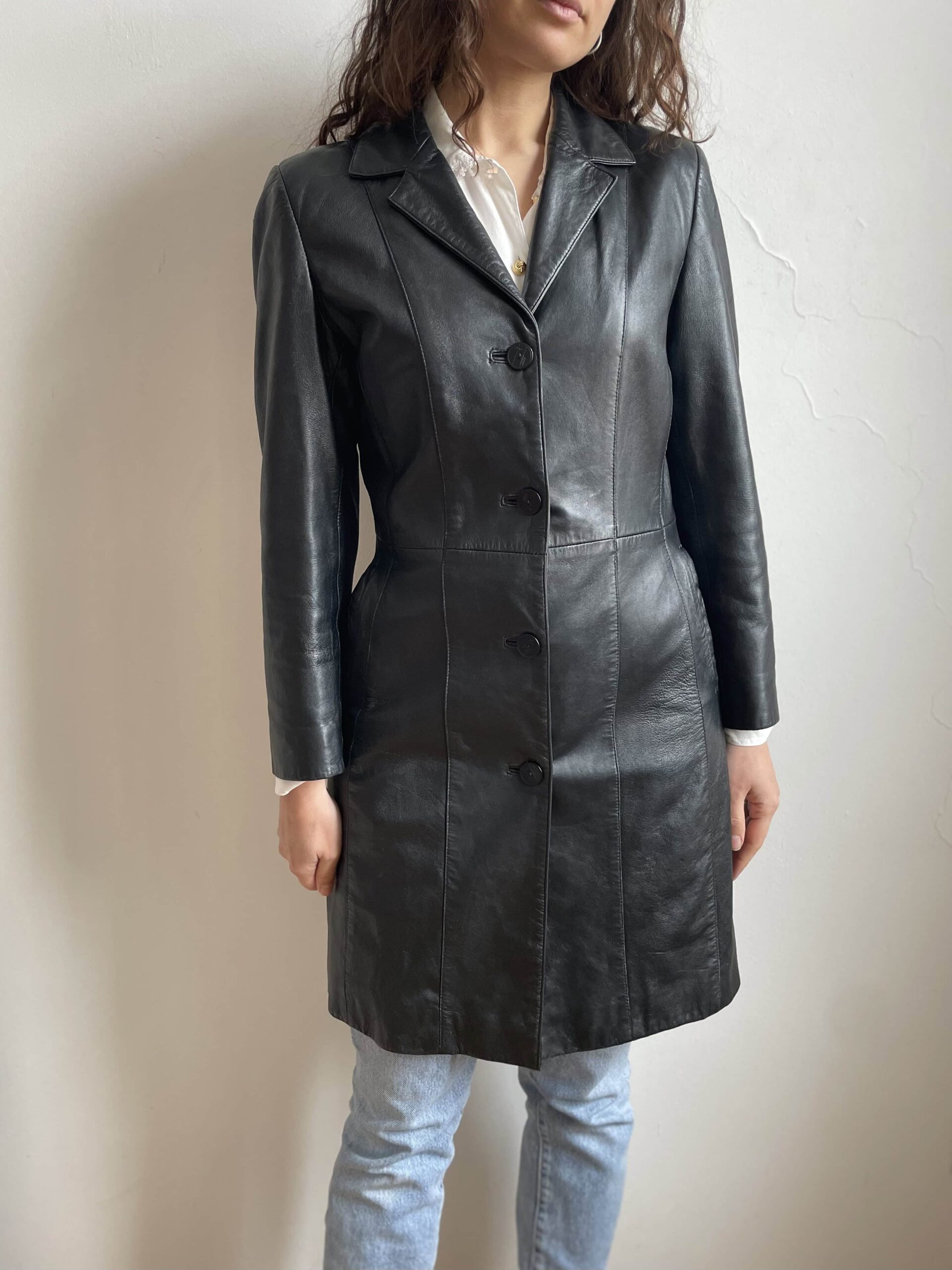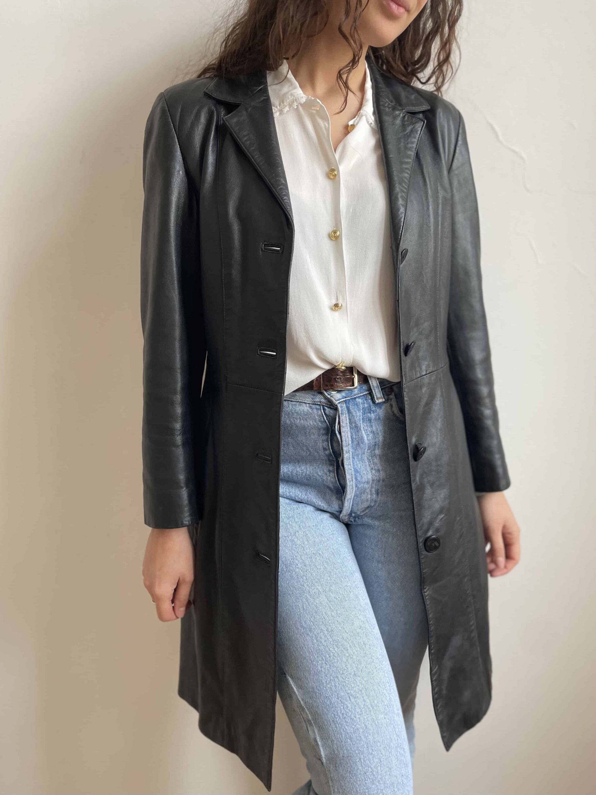 Trench vintage da donna in vera pelle nera di alta qualità, molto morbida. Bella fattura e splendida vestibilità, leggermente sfiancato, spalline leggermente imbottite ma non sporgenti. Dotato di fodera interna. Grazie alla morbidezza della pelle il trench risulta anche molto comodo da indossare (non rigido) ed è impermeabile. Taglia indicativa 42. Fate riferimento alle misure confrontandole con quelle di una vostra camicia: