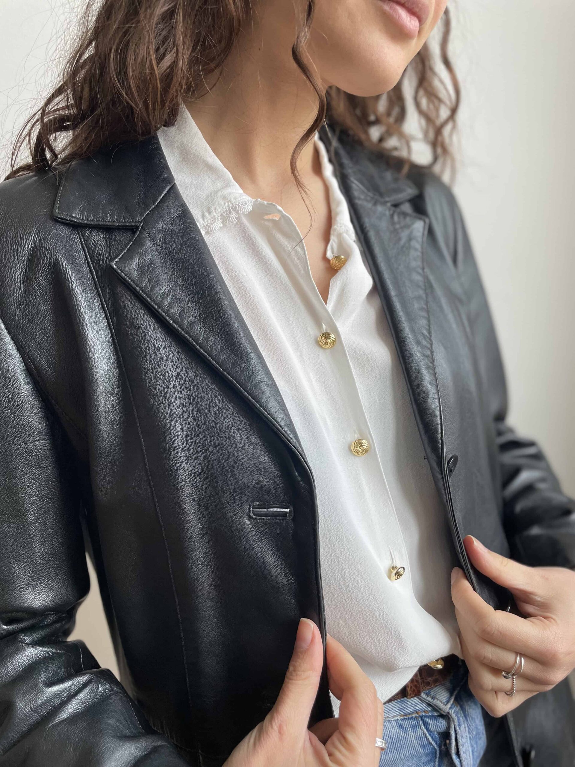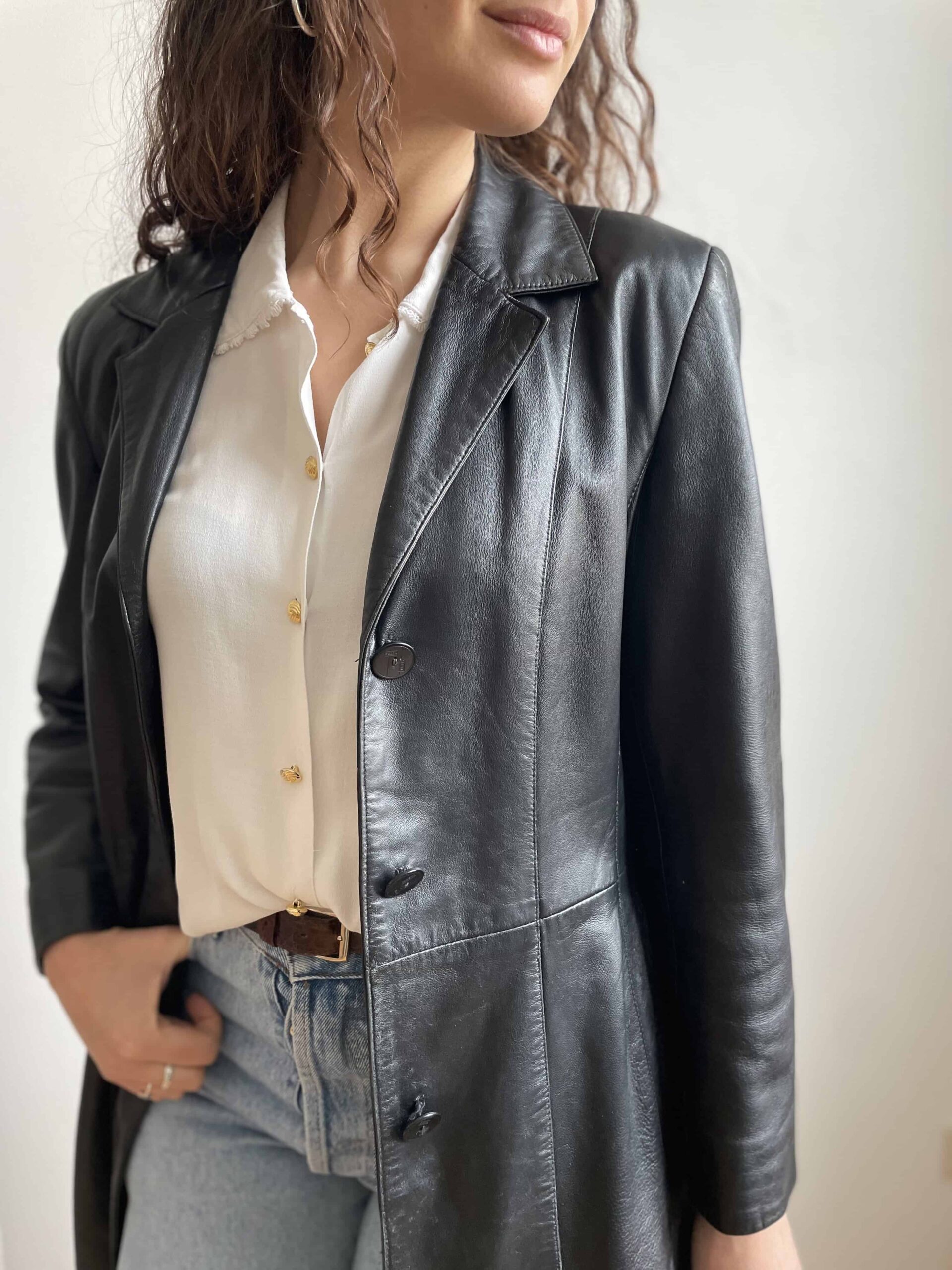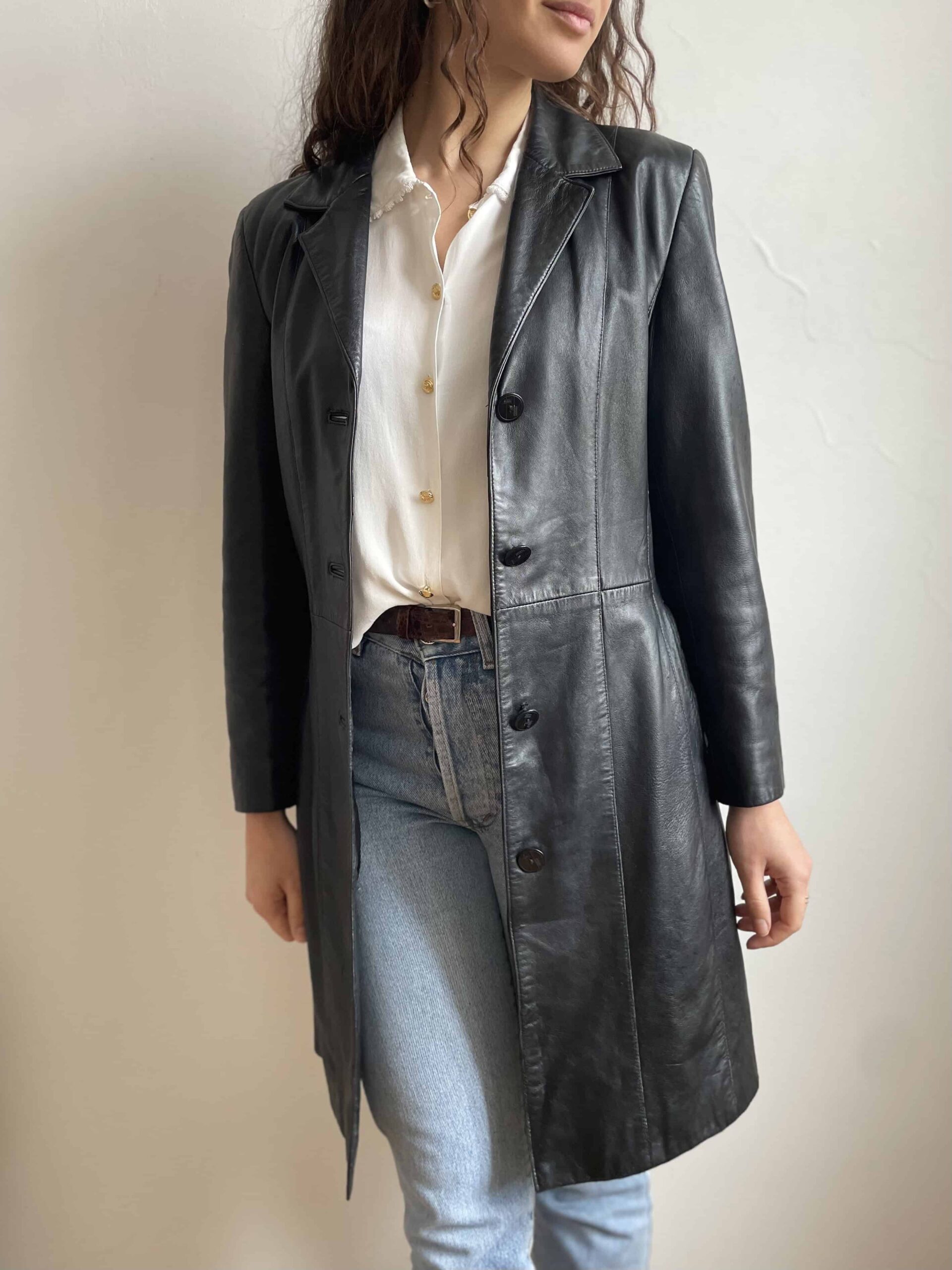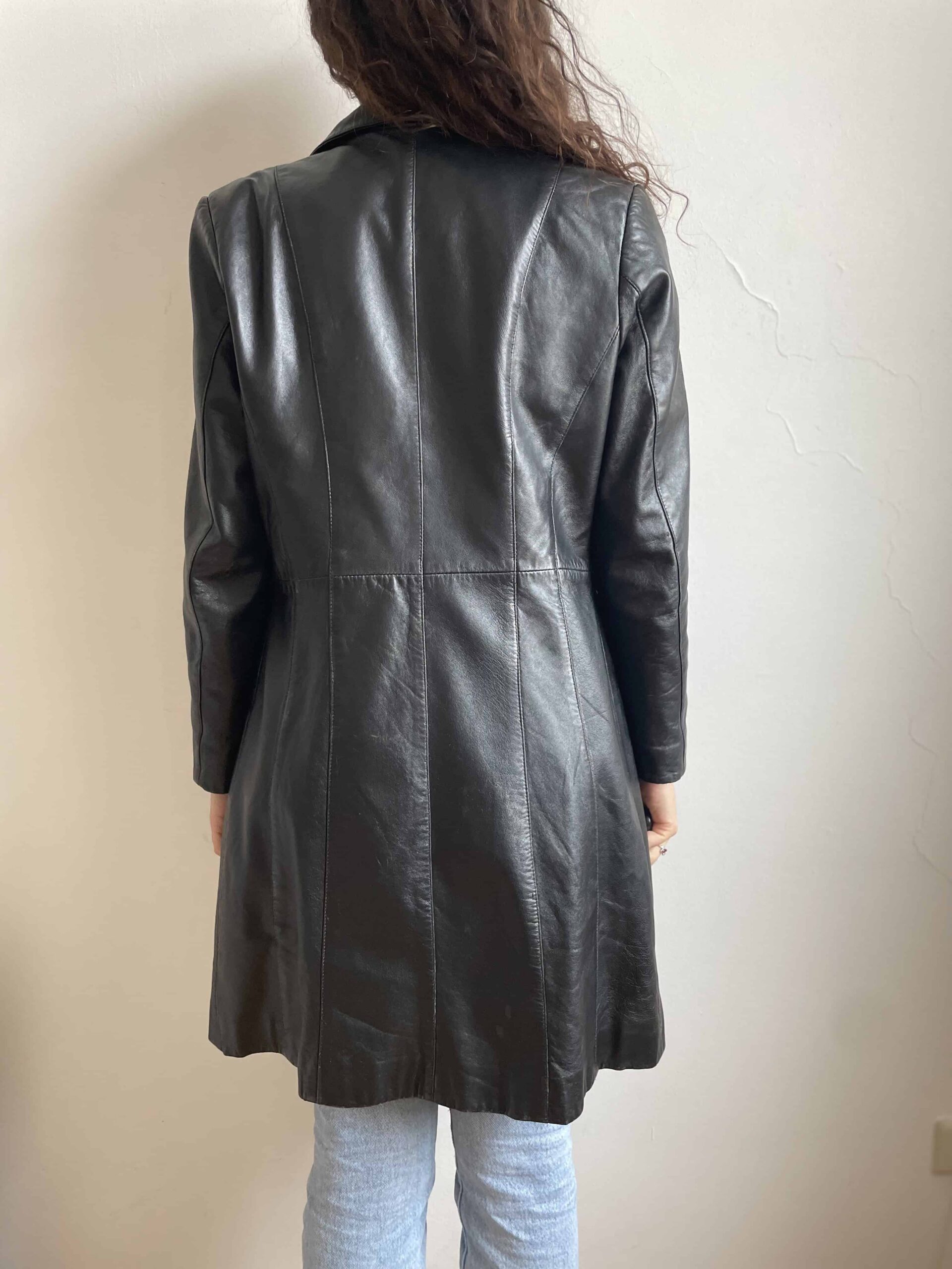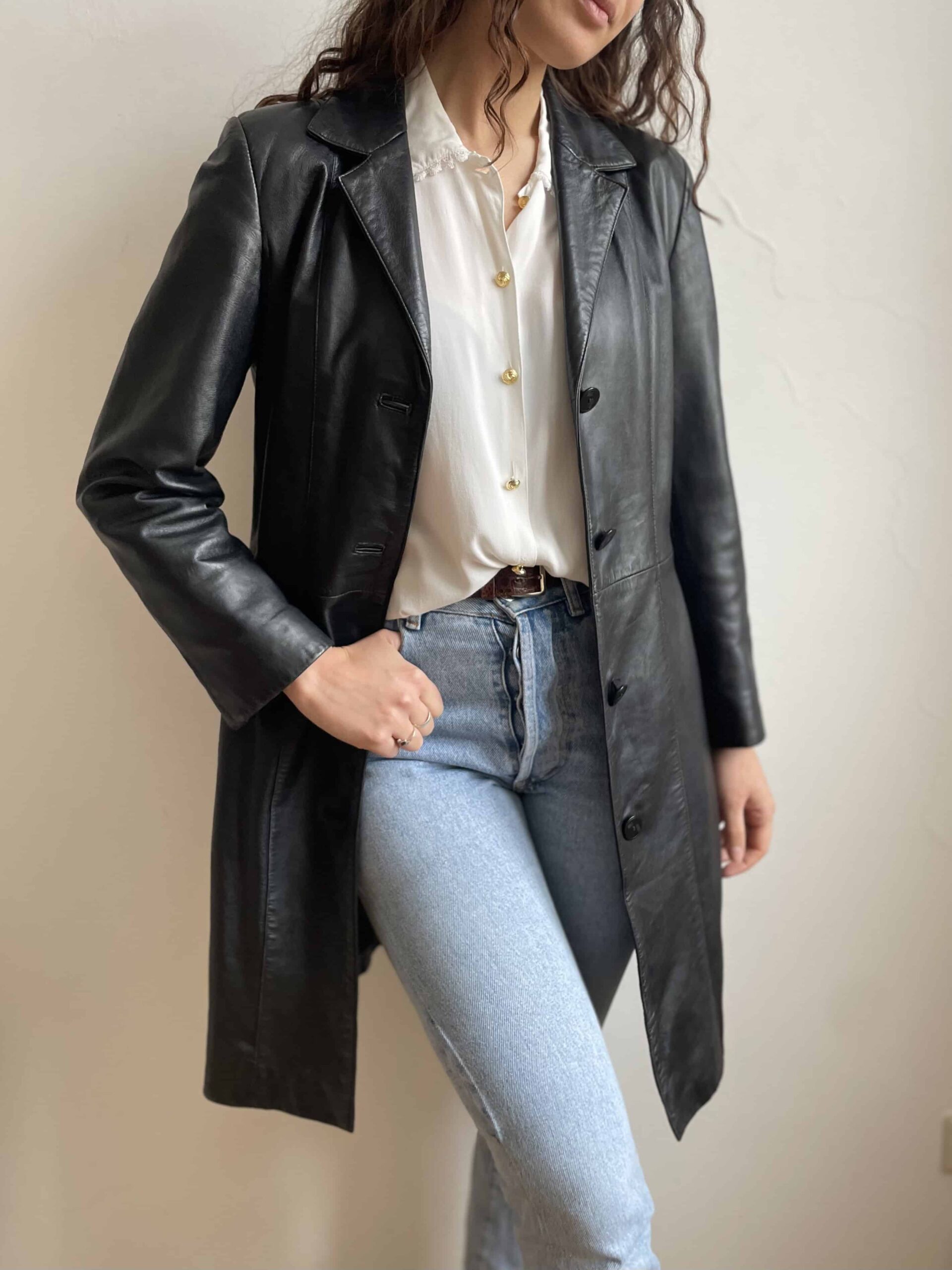 Trench vintage da donna in vera pelle nera di alta qualità, molto morbida. Bella fattura e splendida vestibilità, leggermente sfiancato, spalline leggermente imbottite ma non sporgenti. Dotato di fodera interna. Grazie alla morbidezza della pelle il trench risulta anche molto comodo da indossare (non rigido) ed è impermeabile. Taglia indicativa 42. Fate riferimento alle misure confrontandole con quelle di una vostra camicia: