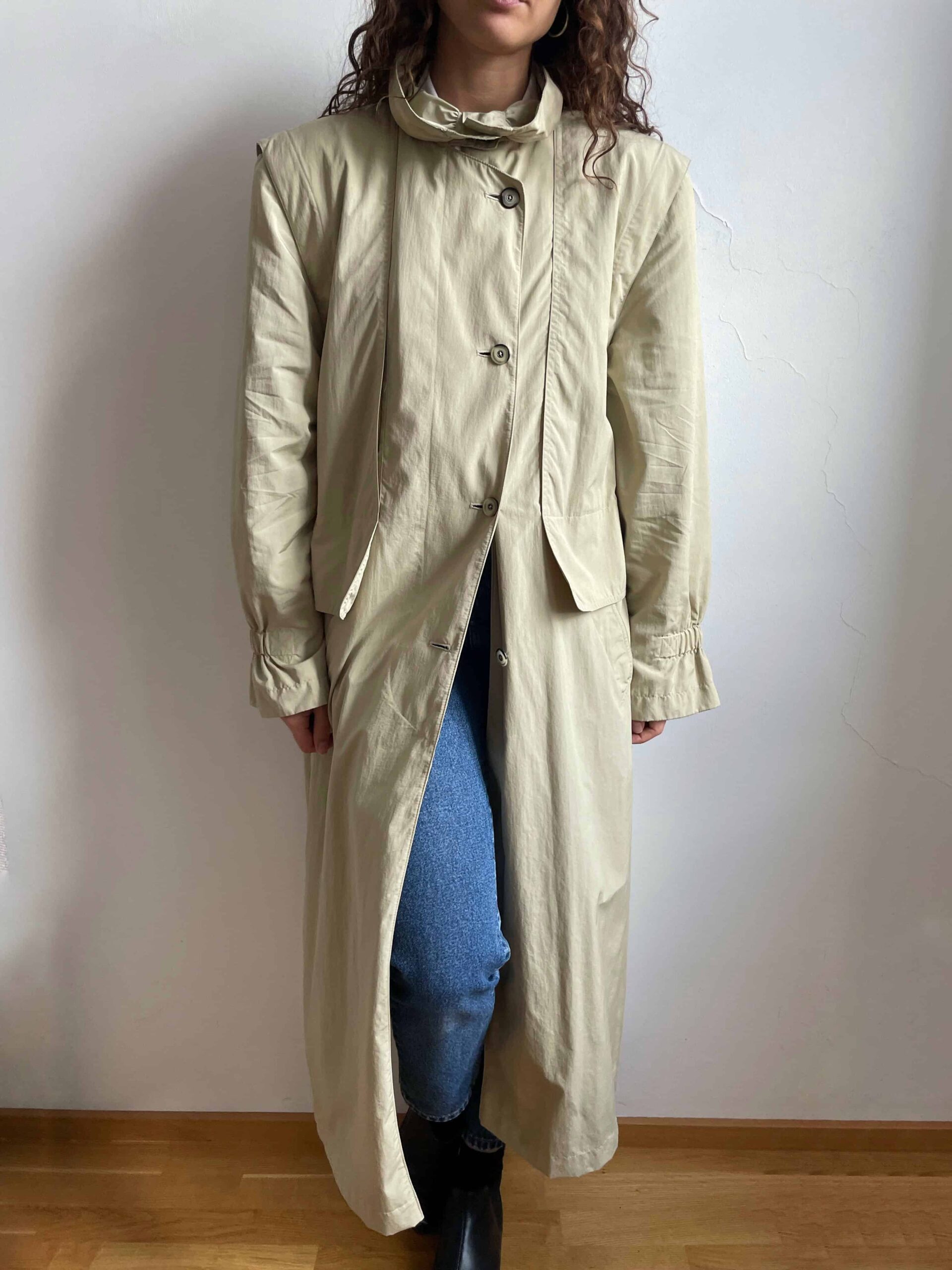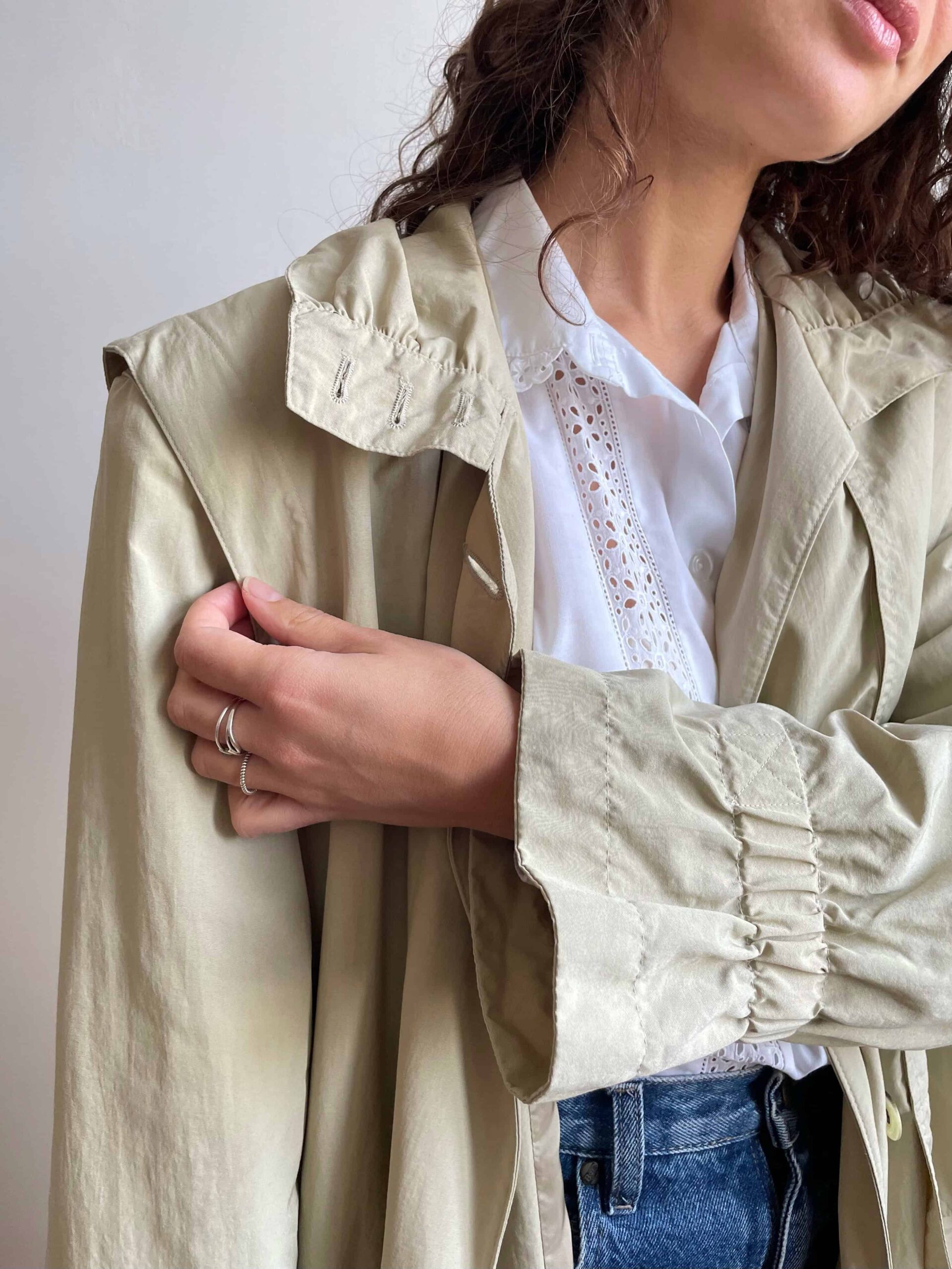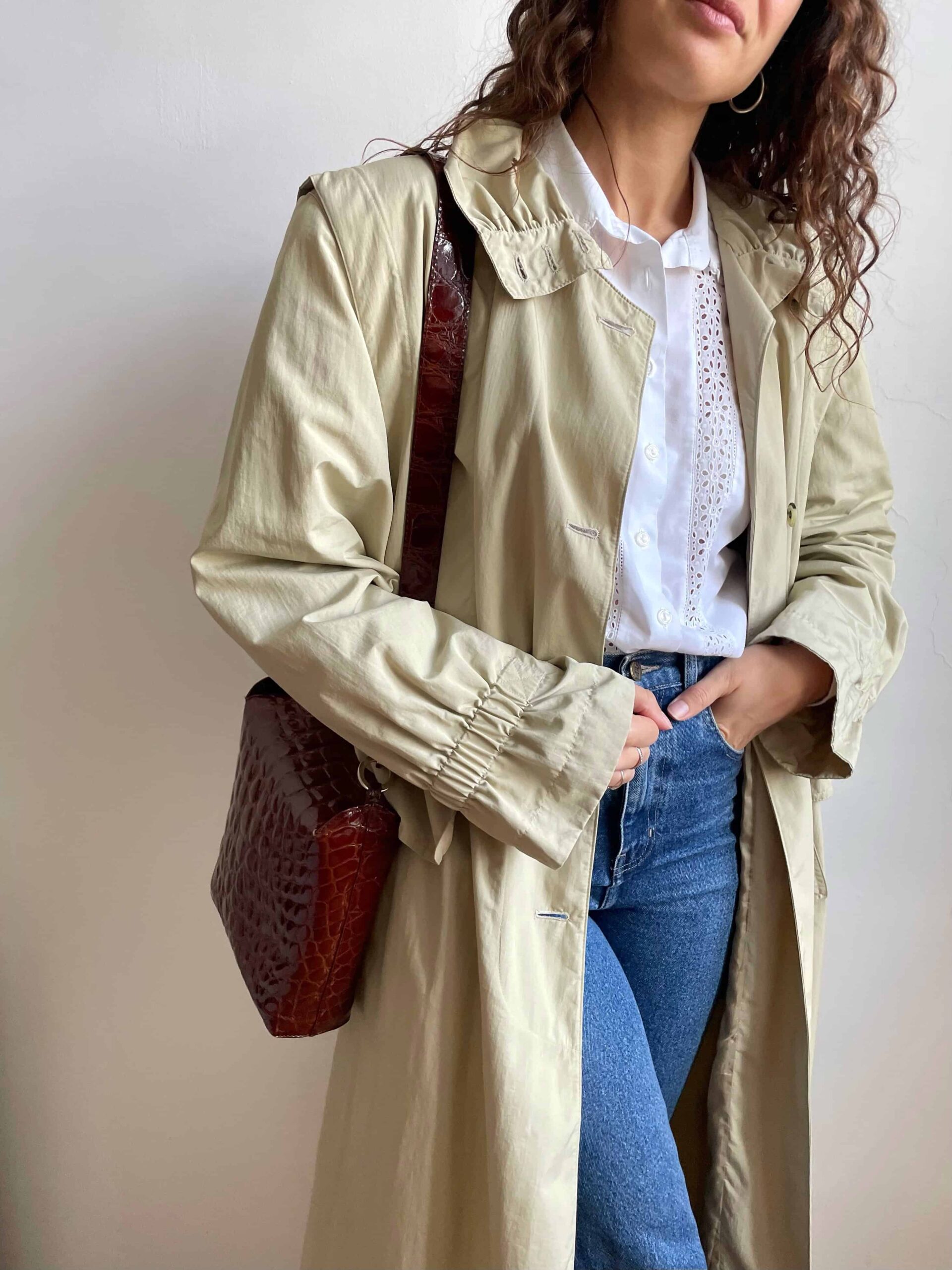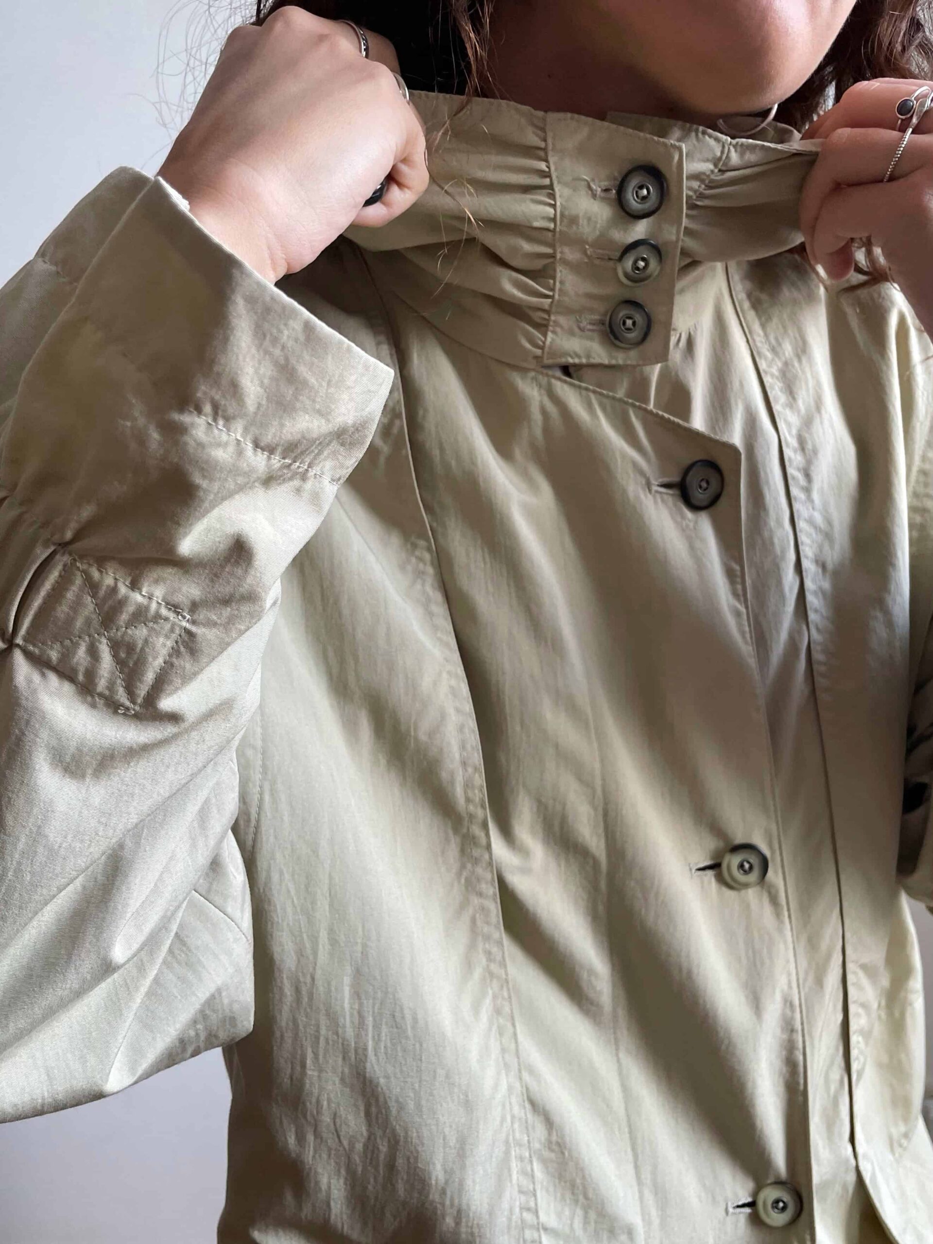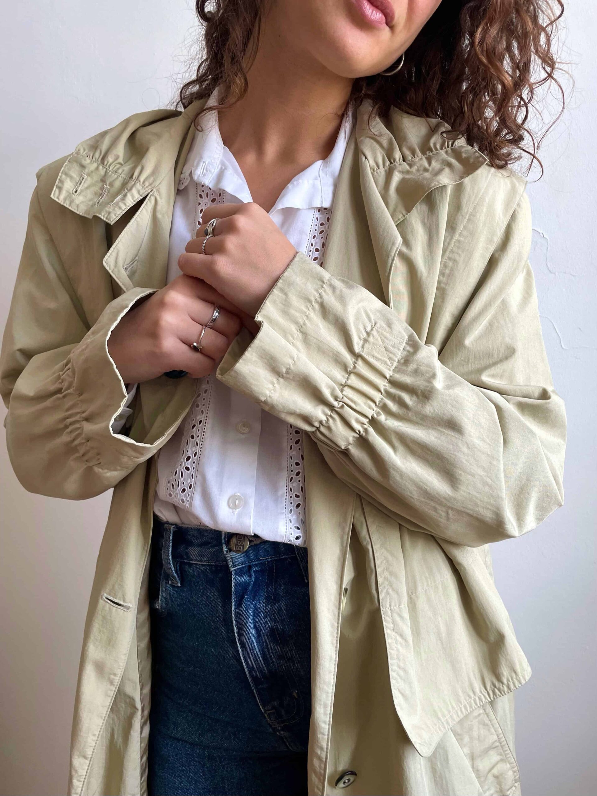 Trench vintage da donna in un bellissimo color verde pistacchio pastello. Bellissima fattura del trench con tantissimi dettagli: arricciatura sui polsini, spalle con effetto staccato, bel colletto che si può abbottonare o tenere aperto. Bellissimo anche il retro, nella piega si nascondono tre bottoni. Dotato di fodera interna. Il tessuto è morbido e di ottima qualità, sia al tatto che alla vista ricorda tantissimo la seta, è invece un poliammide di qualità che è anche impermeabile. Veste più taglie perché sta bene anche con effetto oversize, lo consiglio a partire da una 44 fino ad una 48. Fate riferimento alle misure confrontandole con quelle di una vostra giacca: