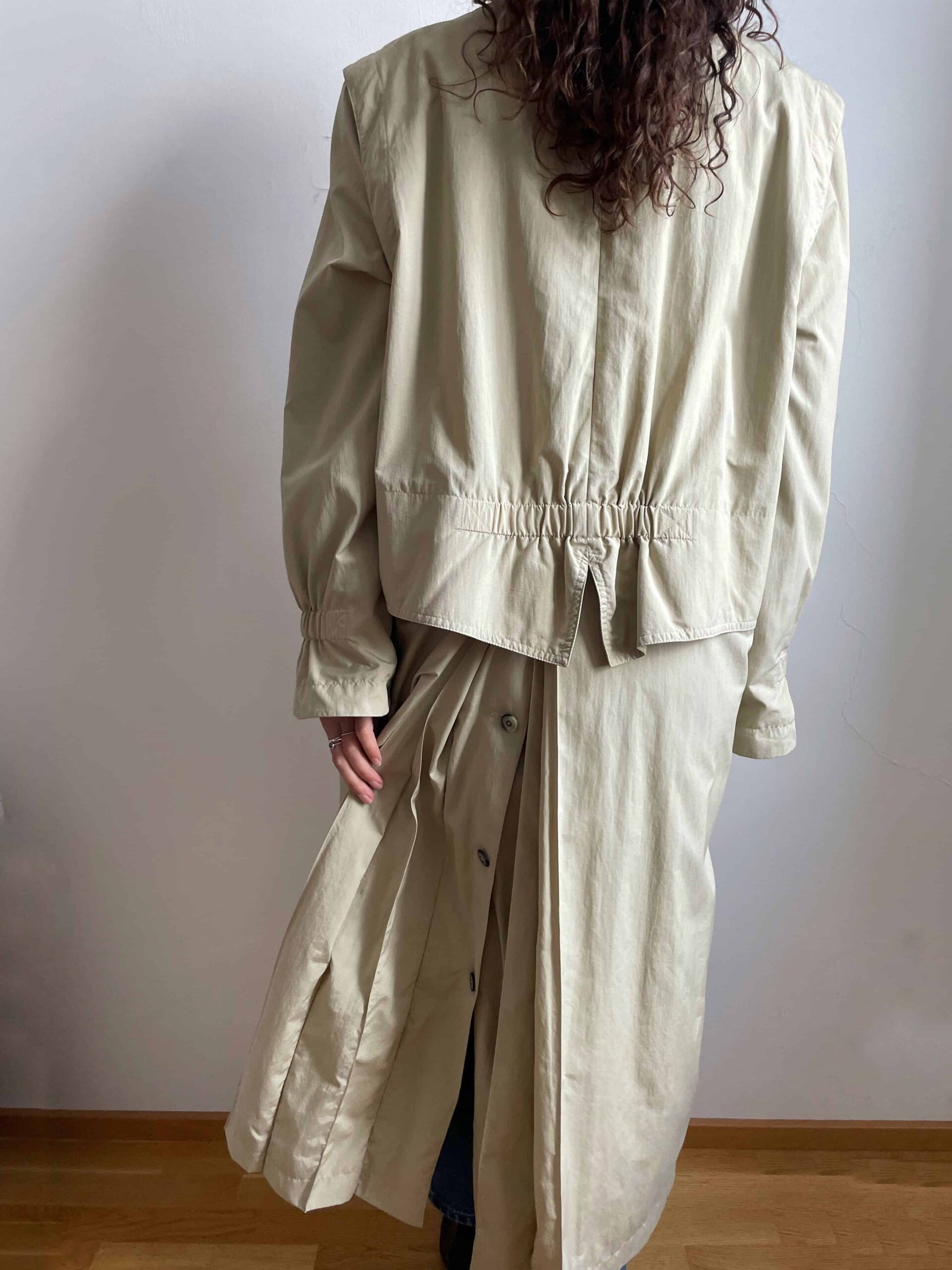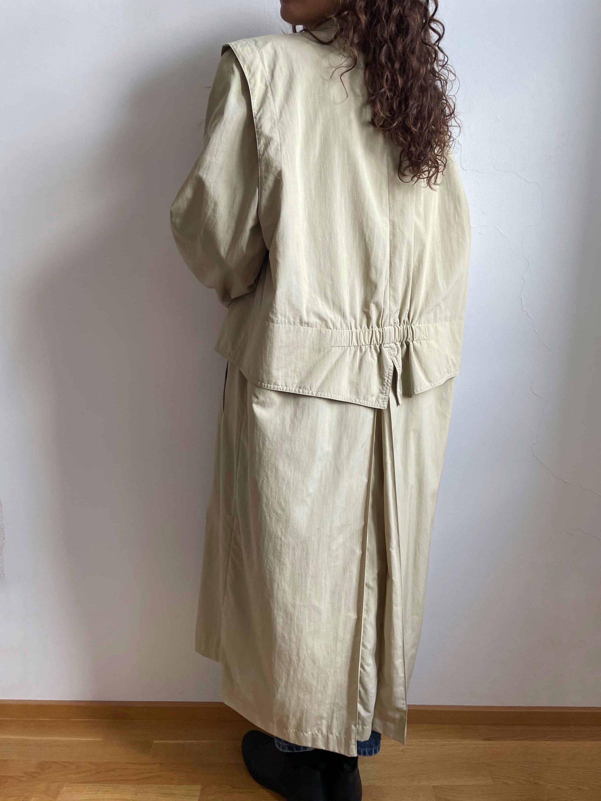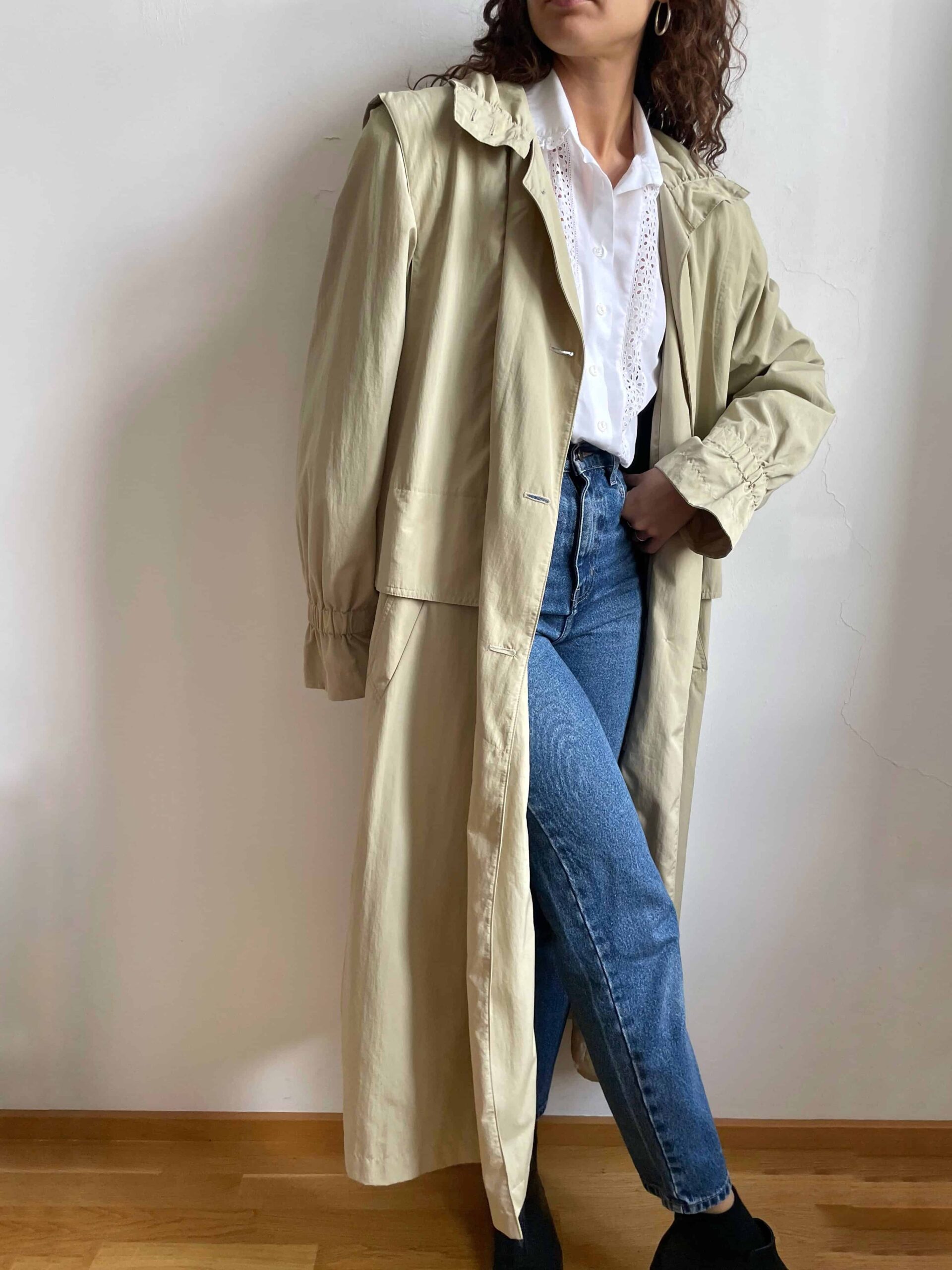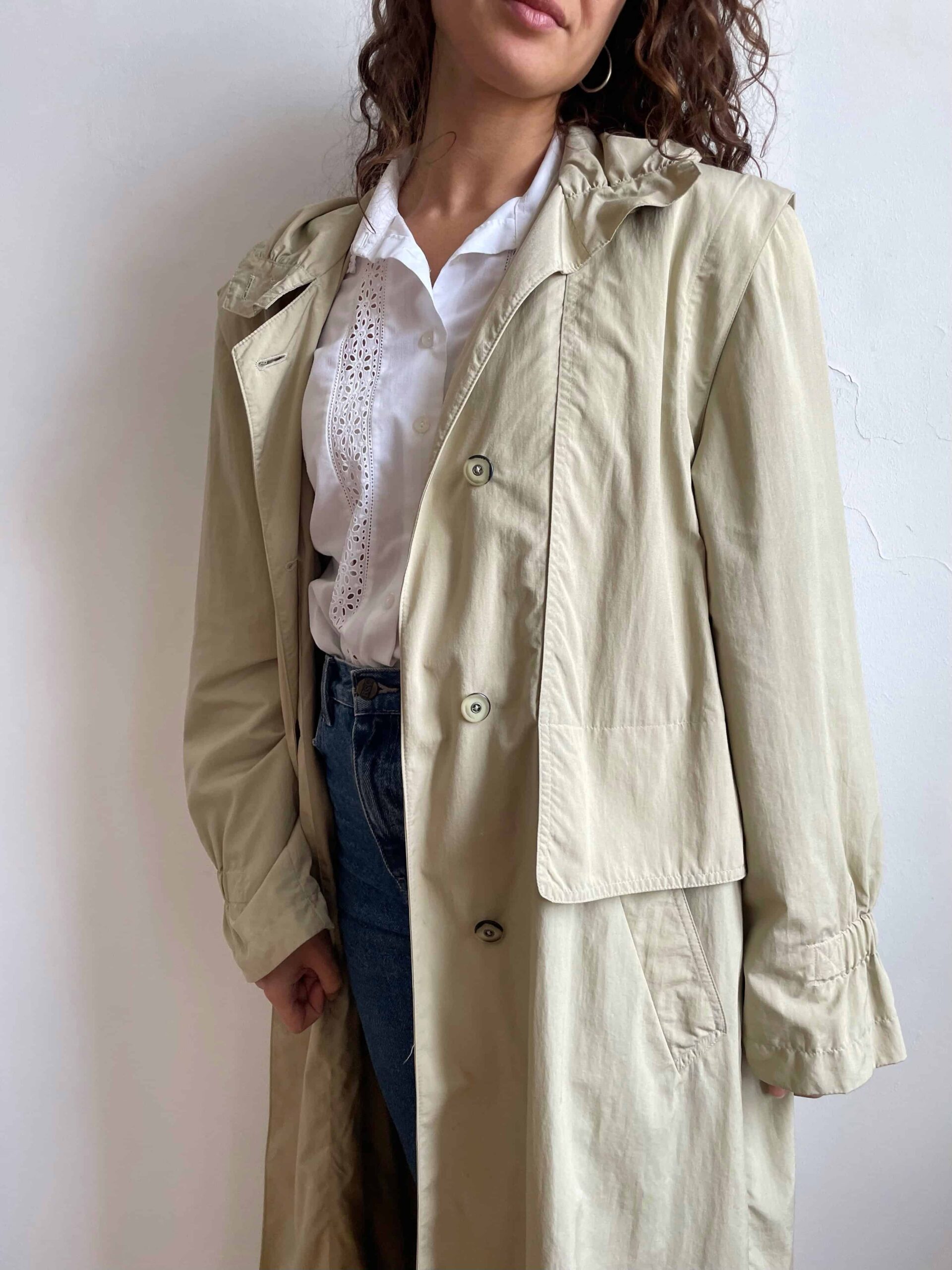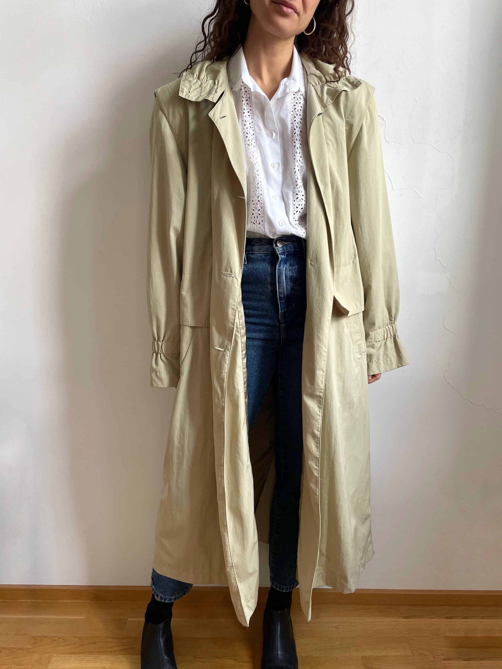 Trench vintage da donna in un bellissimo color verde pistacchio pastello. Bellissima fattura del trench con tantissimi dettagli: arricciatura sui polsini, spalle con effetto staccato, bel colletto che si può abbottonare o tenere aperto. Bellissimo anche il retro, nella piega si nascondono tre bottoni. Dotato di fodera interna. Il tessuto è morbido e di ottima qualità, sia al tatto che alla vista ricorda tantissimo la seta, è invece un poliammide di qualità che è anche impermeabile. Veste più taglie perché sta bene anche con effetto oversize, lo consiglio a partire da una 44 fino ad una 48. Fate riferimento alle misure confrontandole con quelle di una vostra giacca: