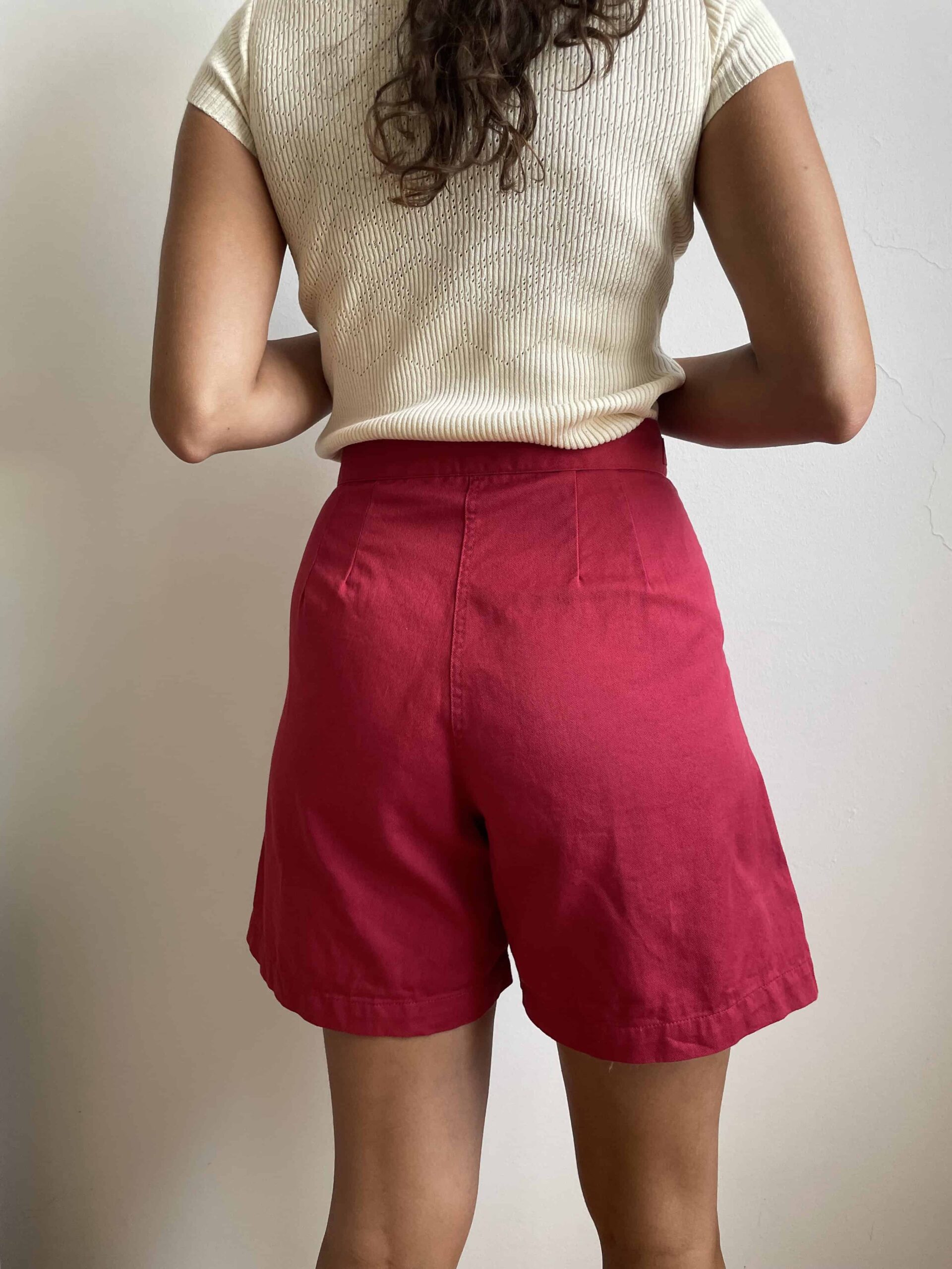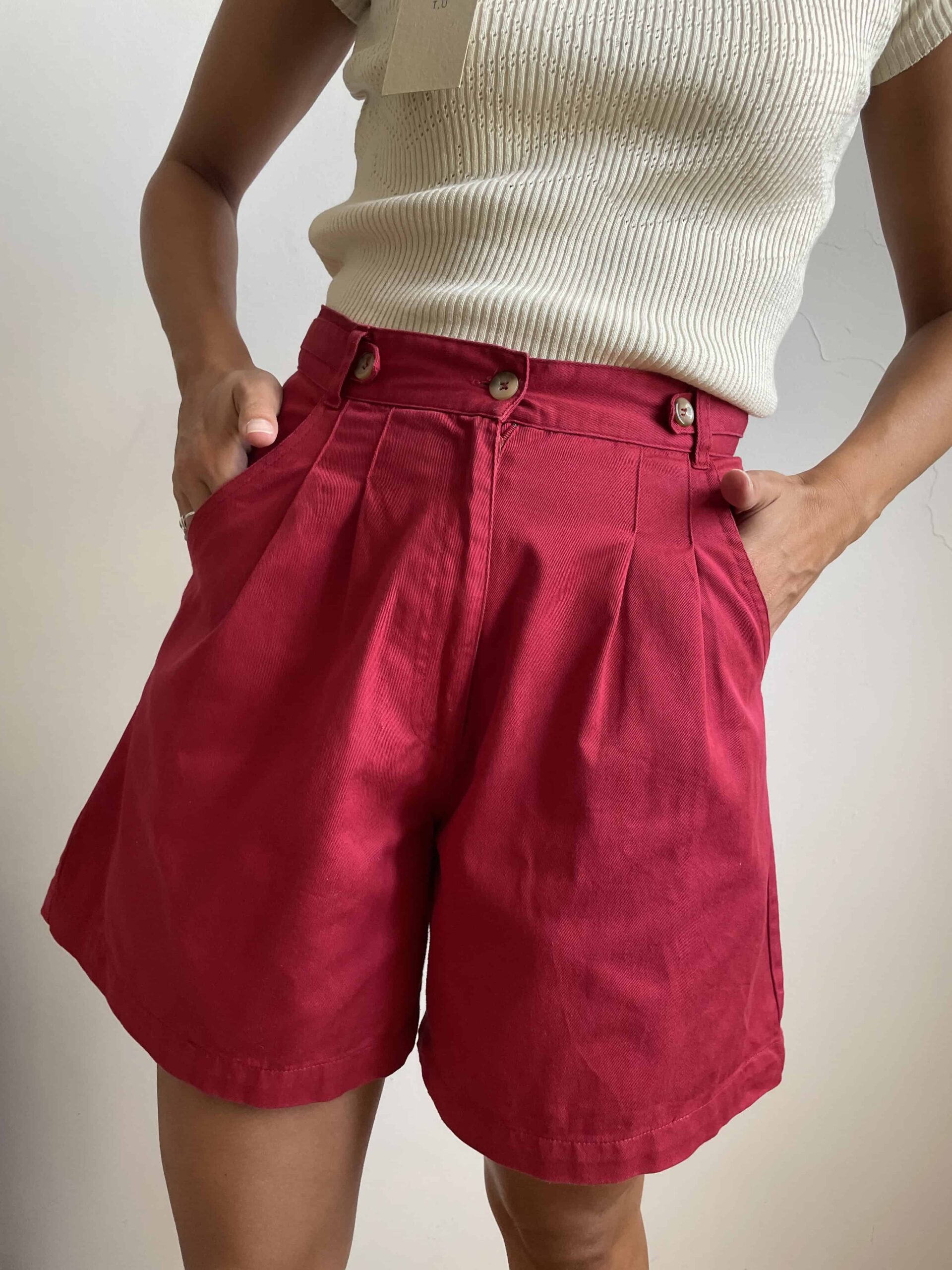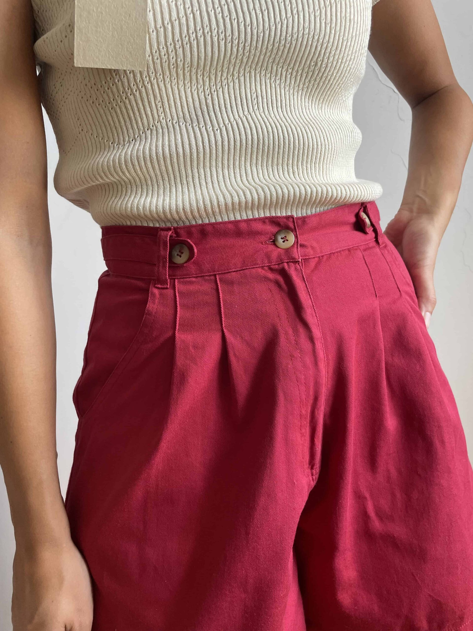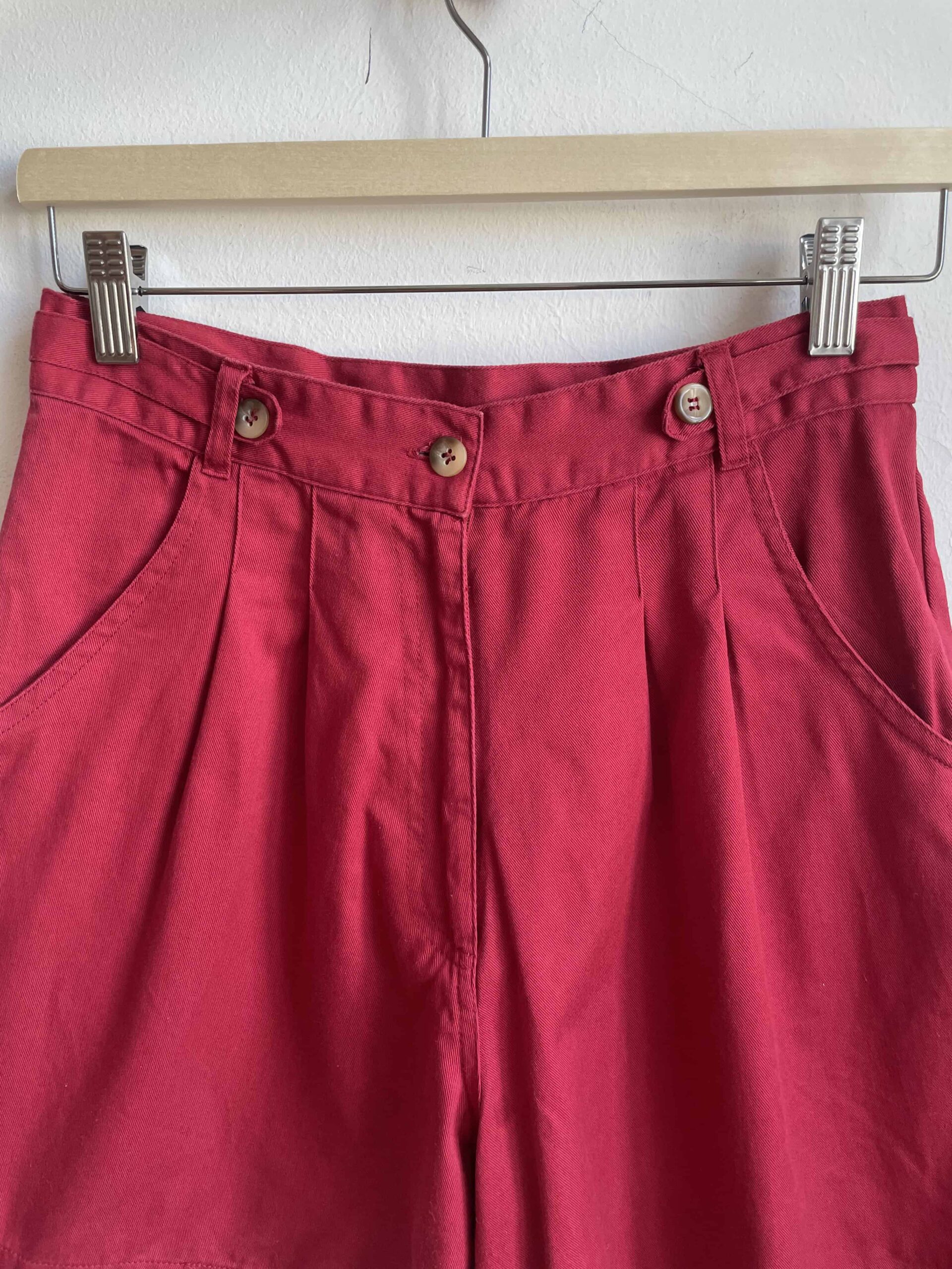 Bermuda vintage di un bellissimo colore rosso lampone. Tessuto di ottima qualità in 100% cotone. Bellissima fattura, i bermuda sono a vita alta con bel dettaglio con bottoni sulla vita, scendono svasati e sembrano quasi una gonna, bellissima vestibilità. Taglia indicativa 40/42. Fate riferimento alle misure confortandole con quelle di un vostro paio di pantaloni: