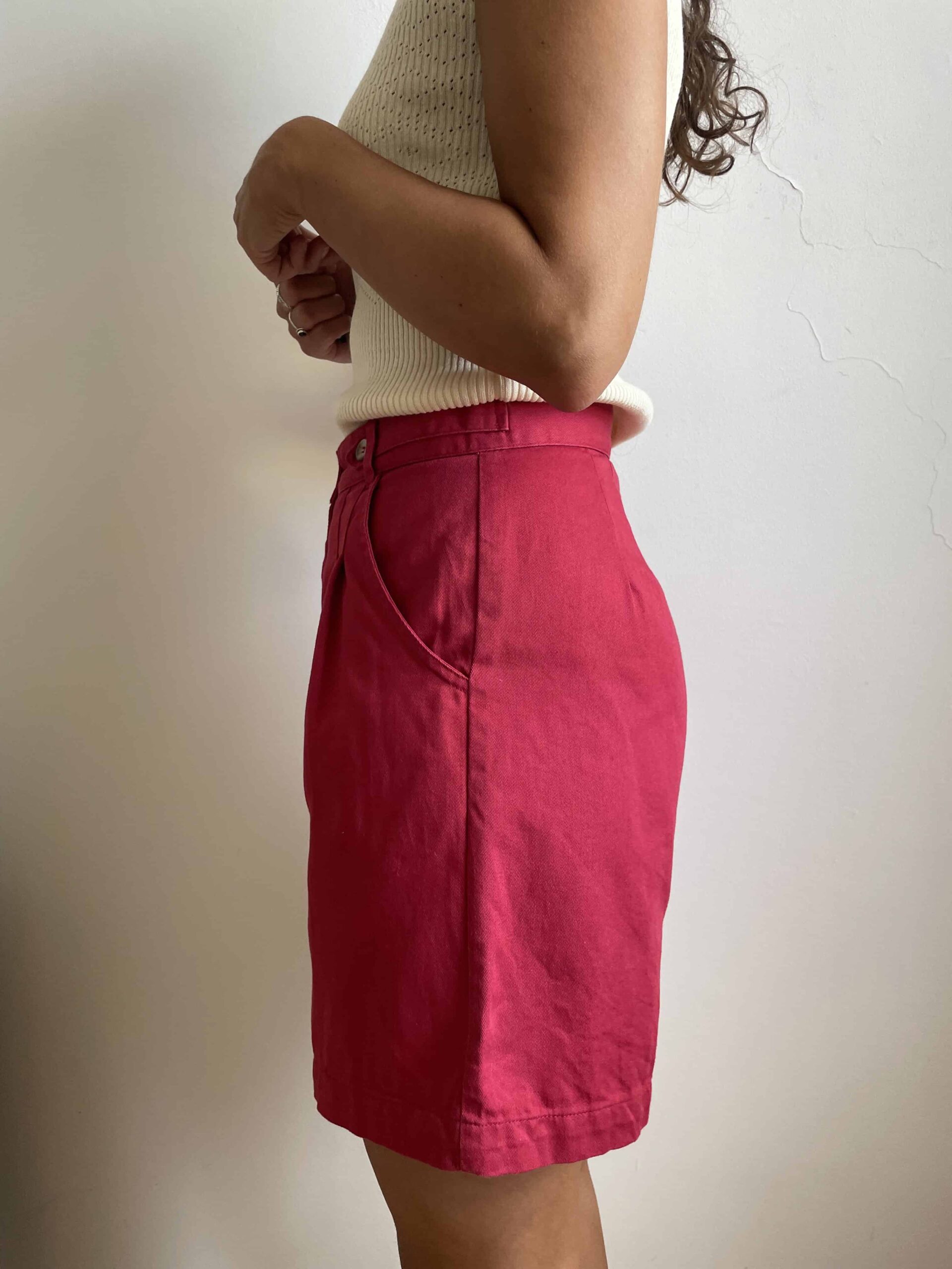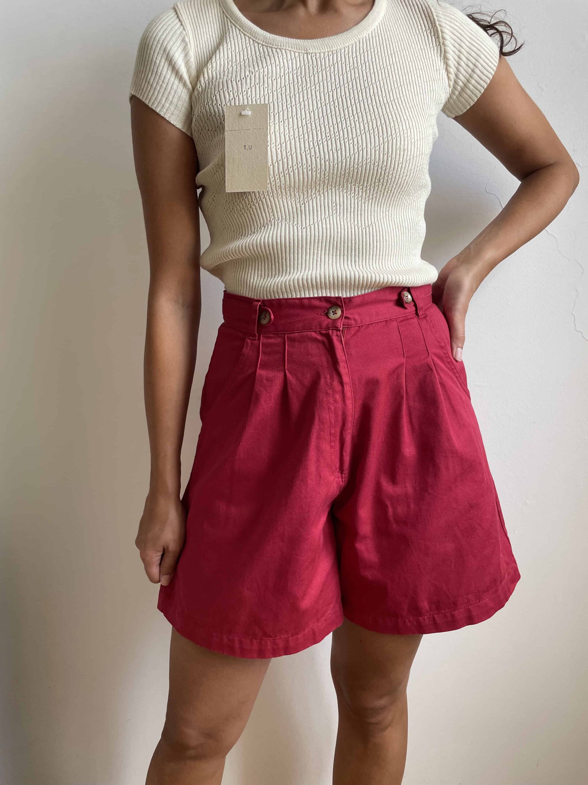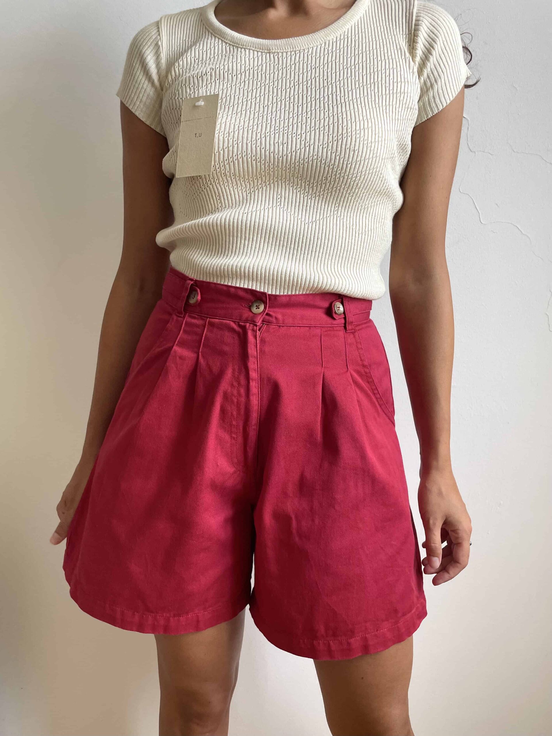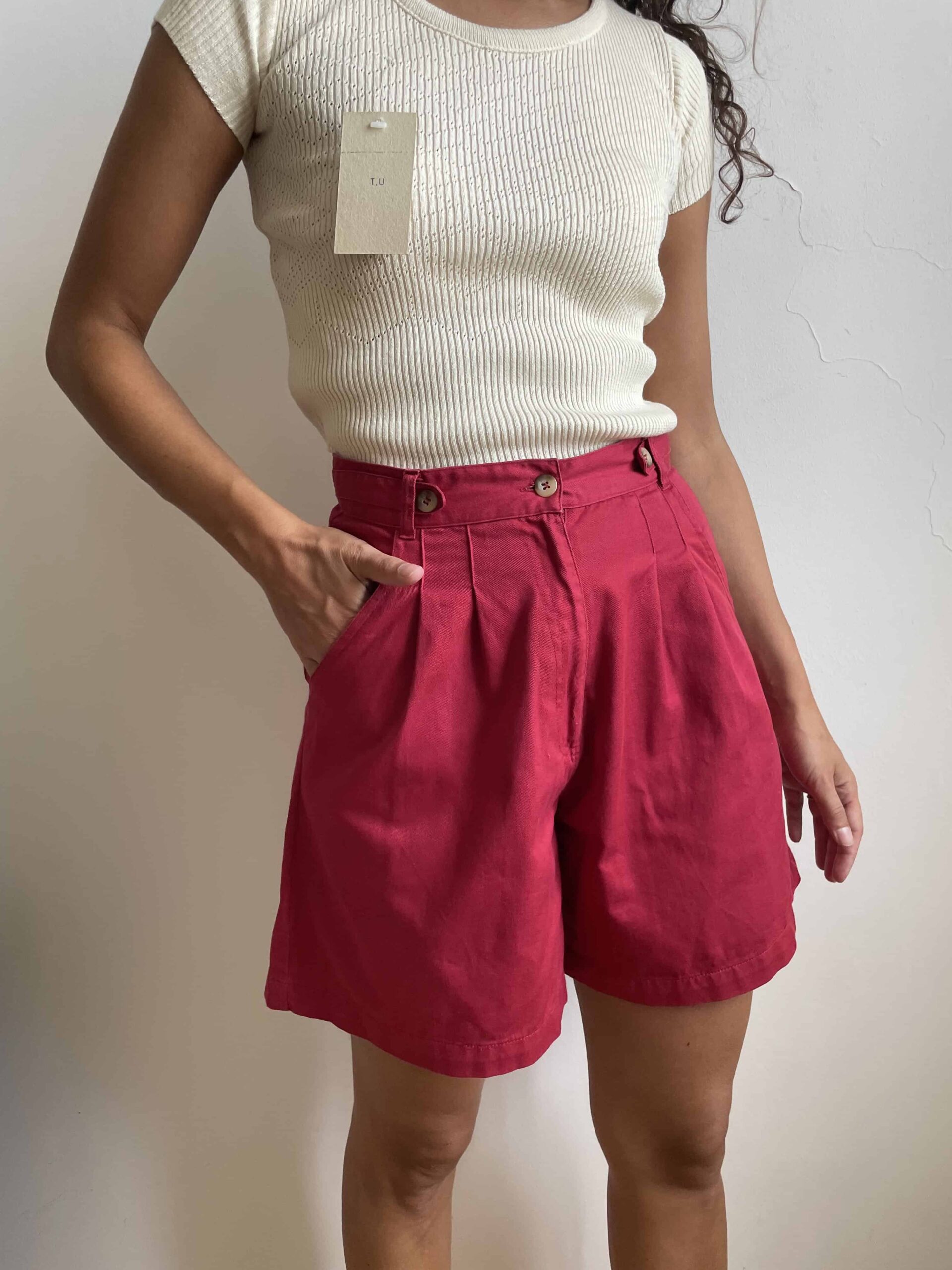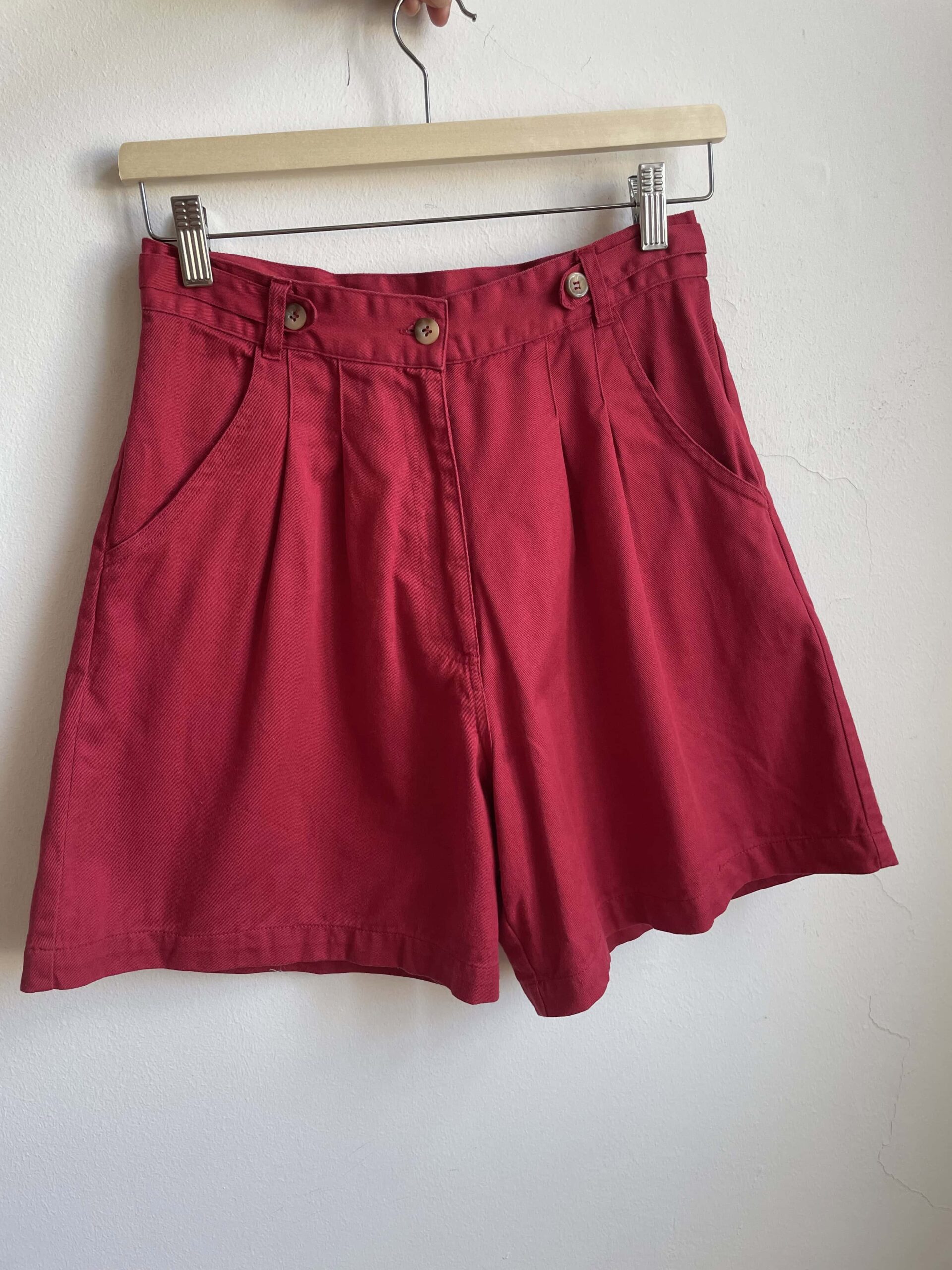 Bermuda vintage di un bellissimo colore rosso lampone. Tessuto di ottima qualità in 100% cotone. Bellissima fattura, i bermuda sono a vita alta con bel dettaglio con bottoni sulla vita, scendono svasati e sembrano quasi una gonna, bellissima vestibilità. Taglia indicativa 40/42. Fate riferimento alle misure confortandole con quelle di un vostro paio di pantaloni: