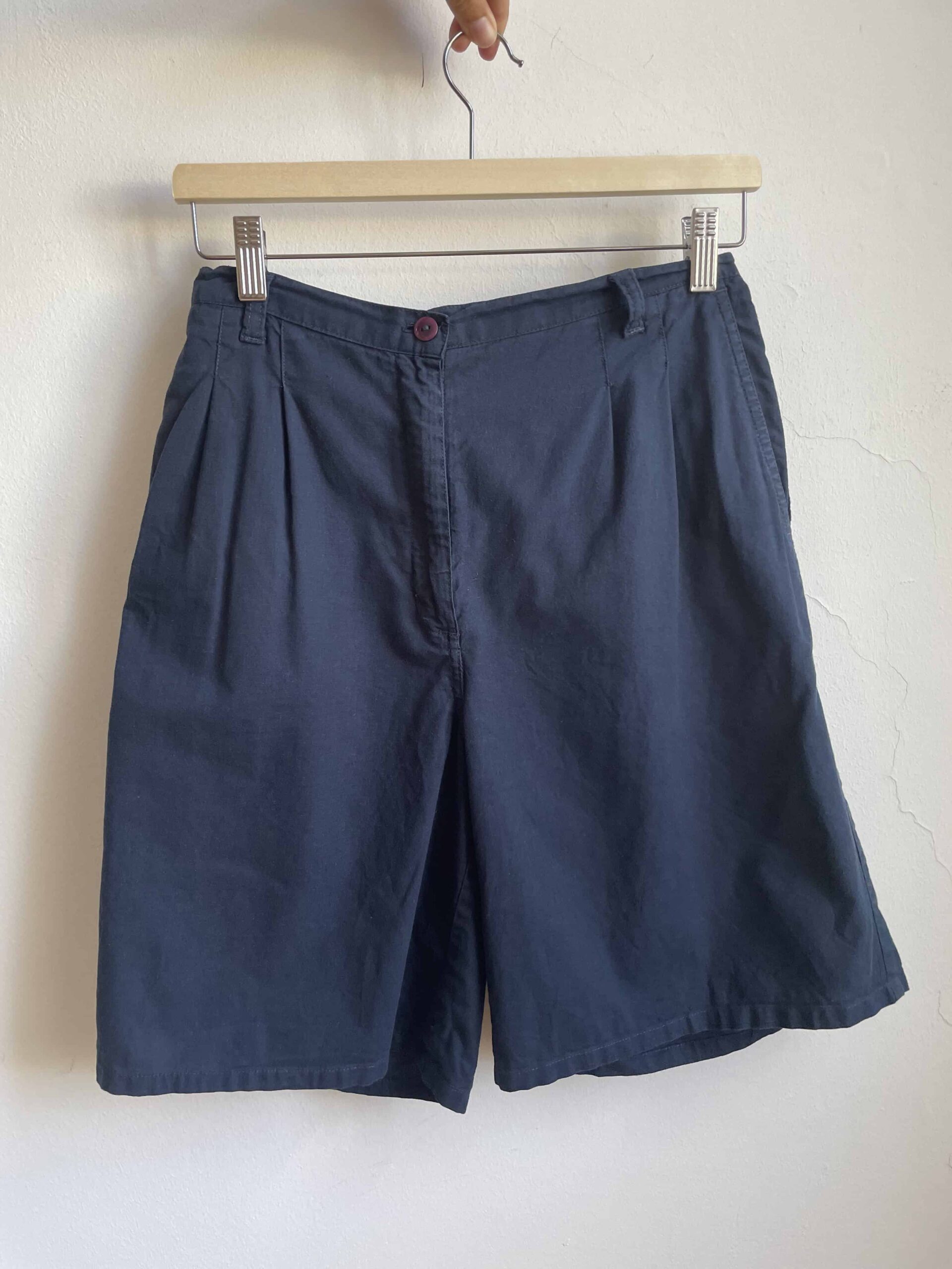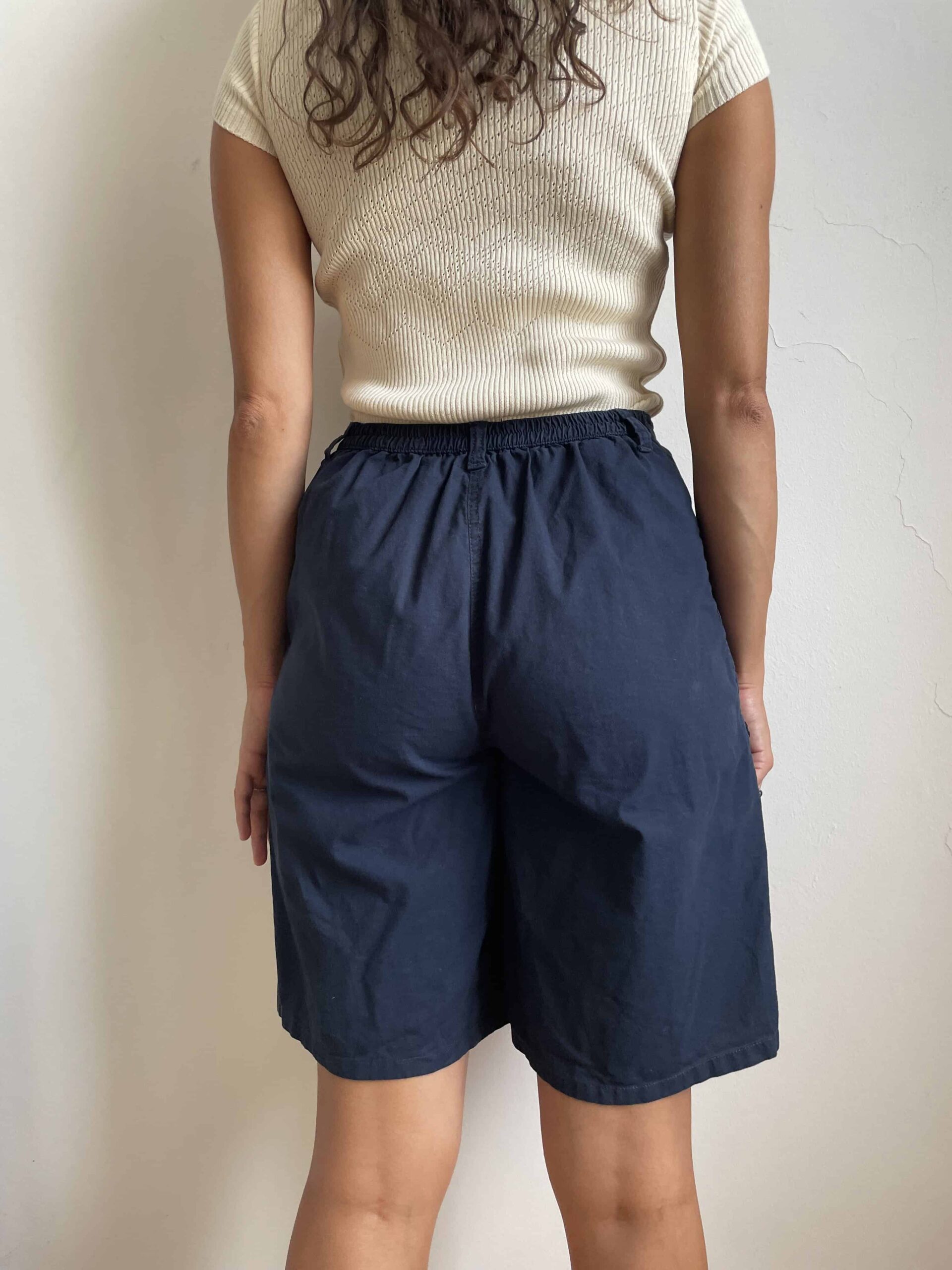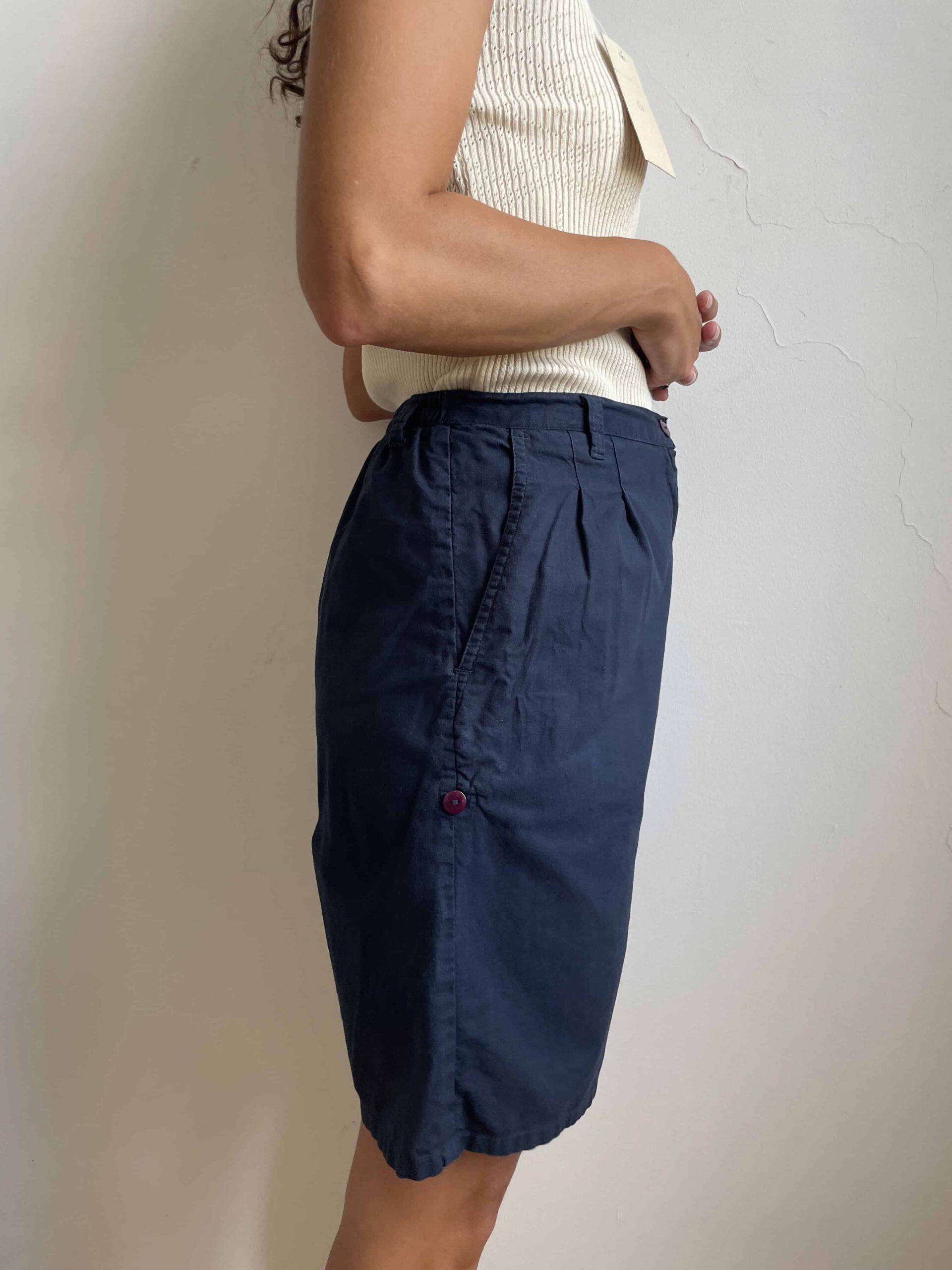 Bermuda vintage colore blu scuro. Tessuto di in 100% cotone sottile. Sul retro della vita hanno un elastico e risultano molto comodi. Su ogni lato hanno un bottoncini per regolare la lunghezza, possono essere dei bermuda oppure degli shorts. Sono elastici e vestono una 42. Fate riferimento alle misure confortandole con quelle di un vostro paio di pantaloni: