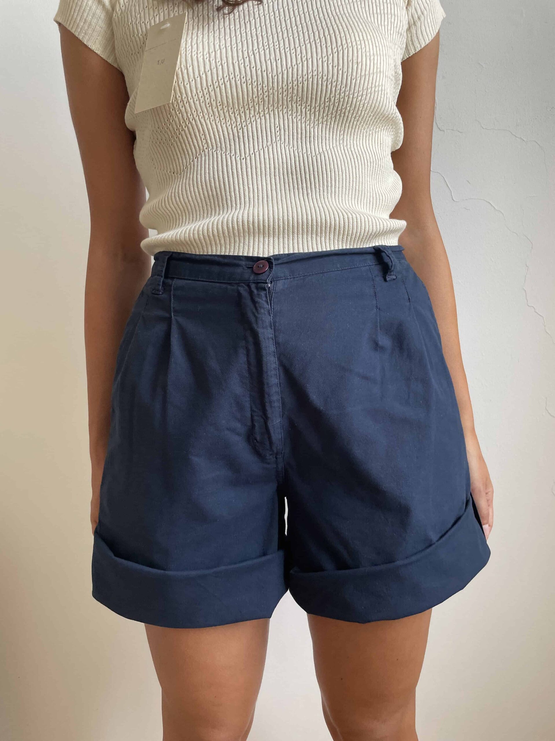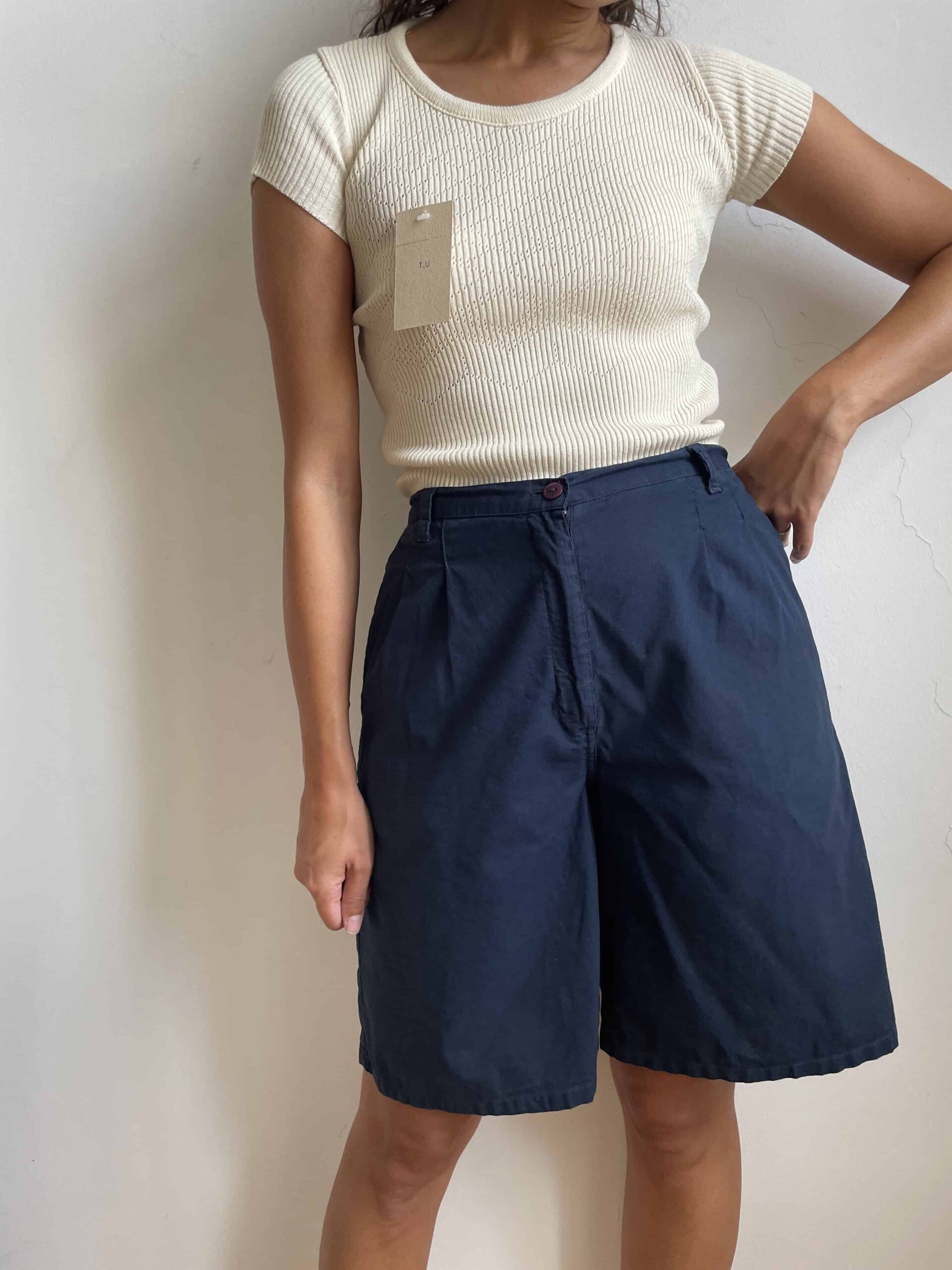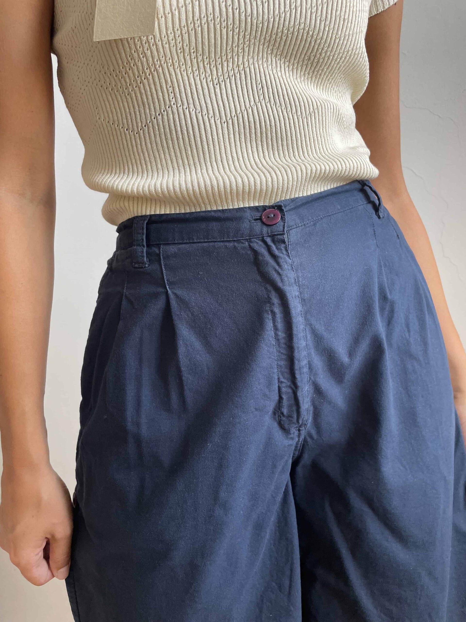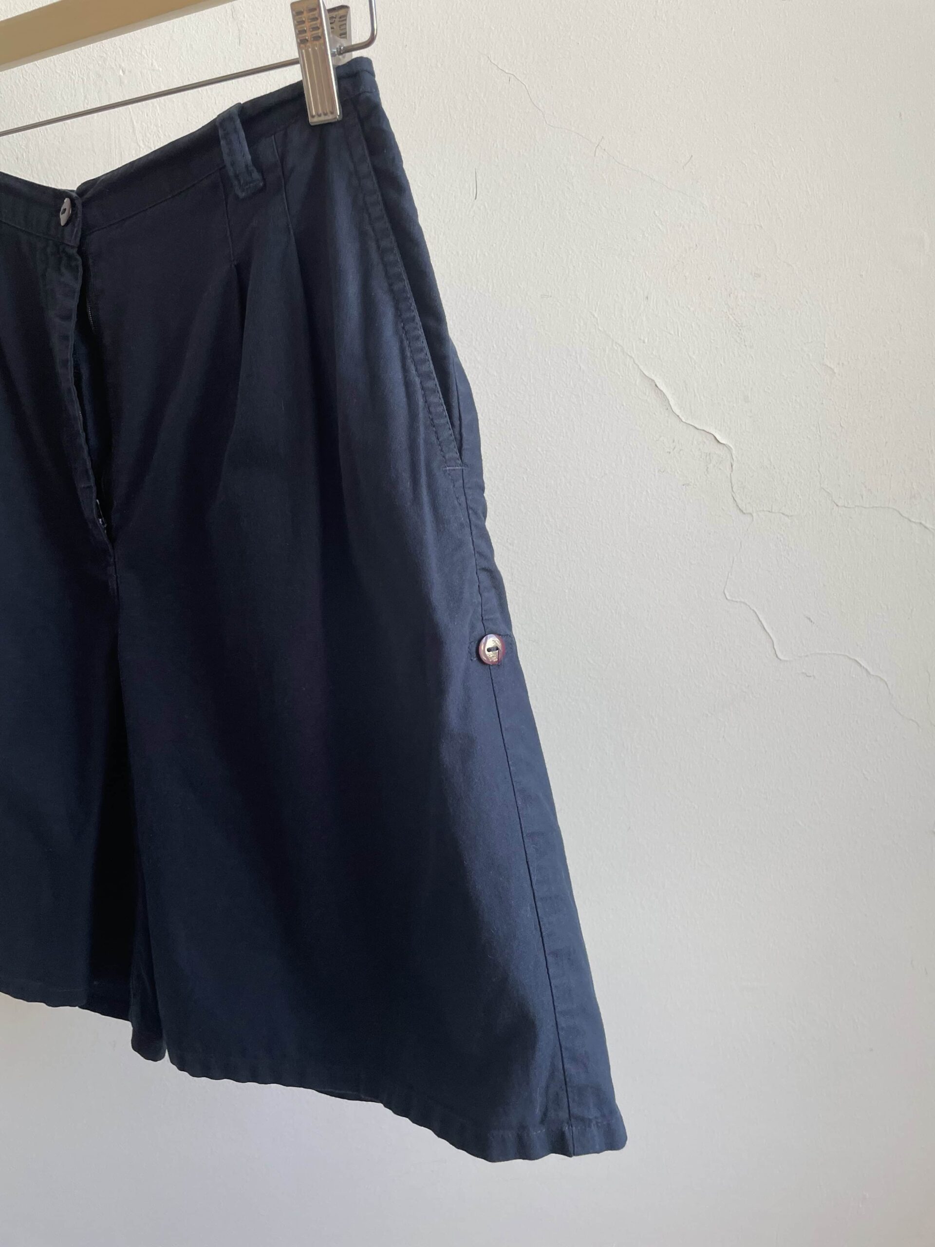 Bermuda vintage colore blu scuro. Tessuto di in 100% cotone sottile. Sul retro della vita hanno un elastico e risultano molto comodi. Su ogni lato hanno un bottoncini per regolare la lunghezza, possono essere dei bermuda oppure degli shorts. Sono elastici e vestono una 42. Fate riferimento alle misure confortandole con quelle di un vostro paio di pantaloni: