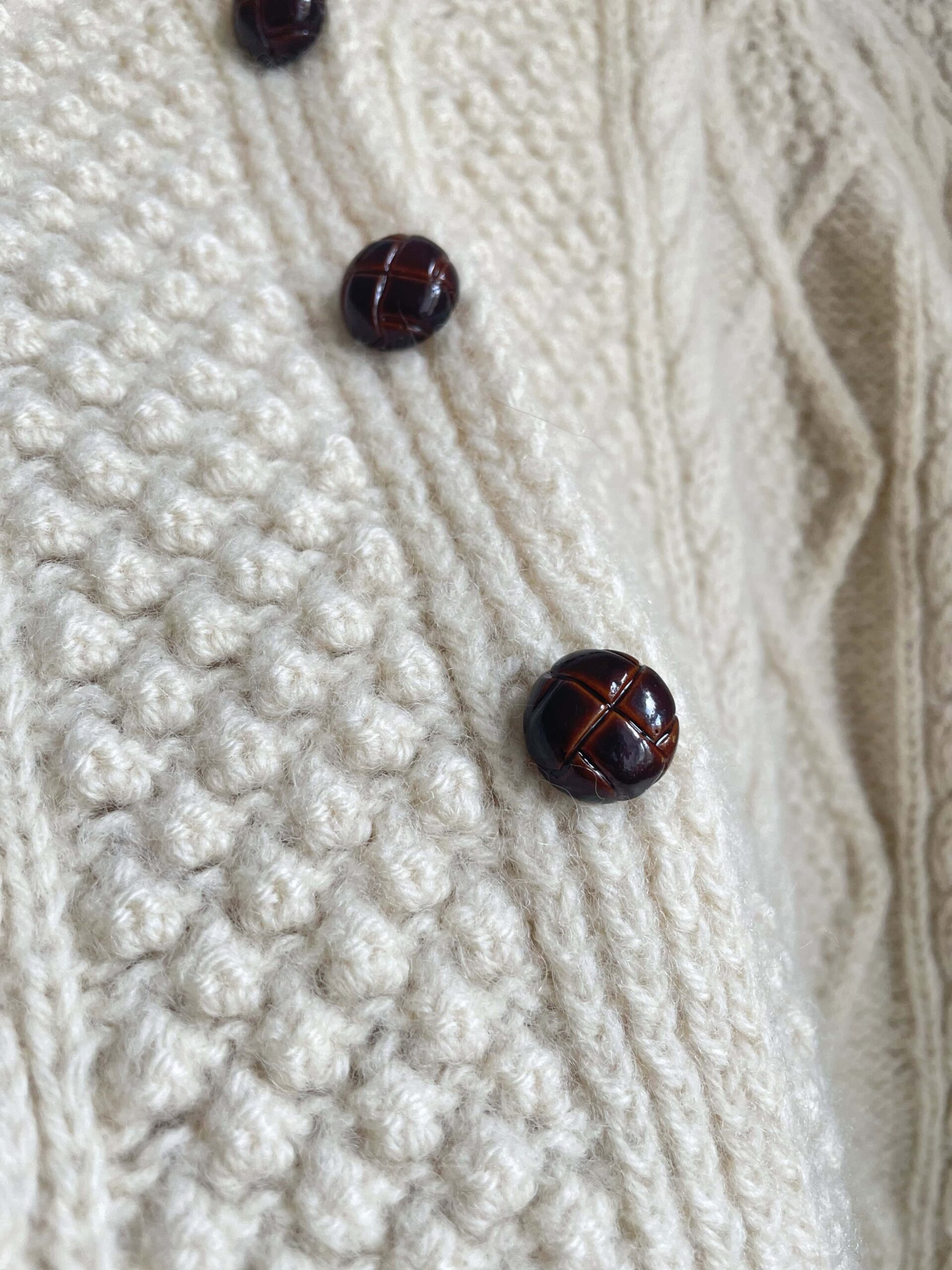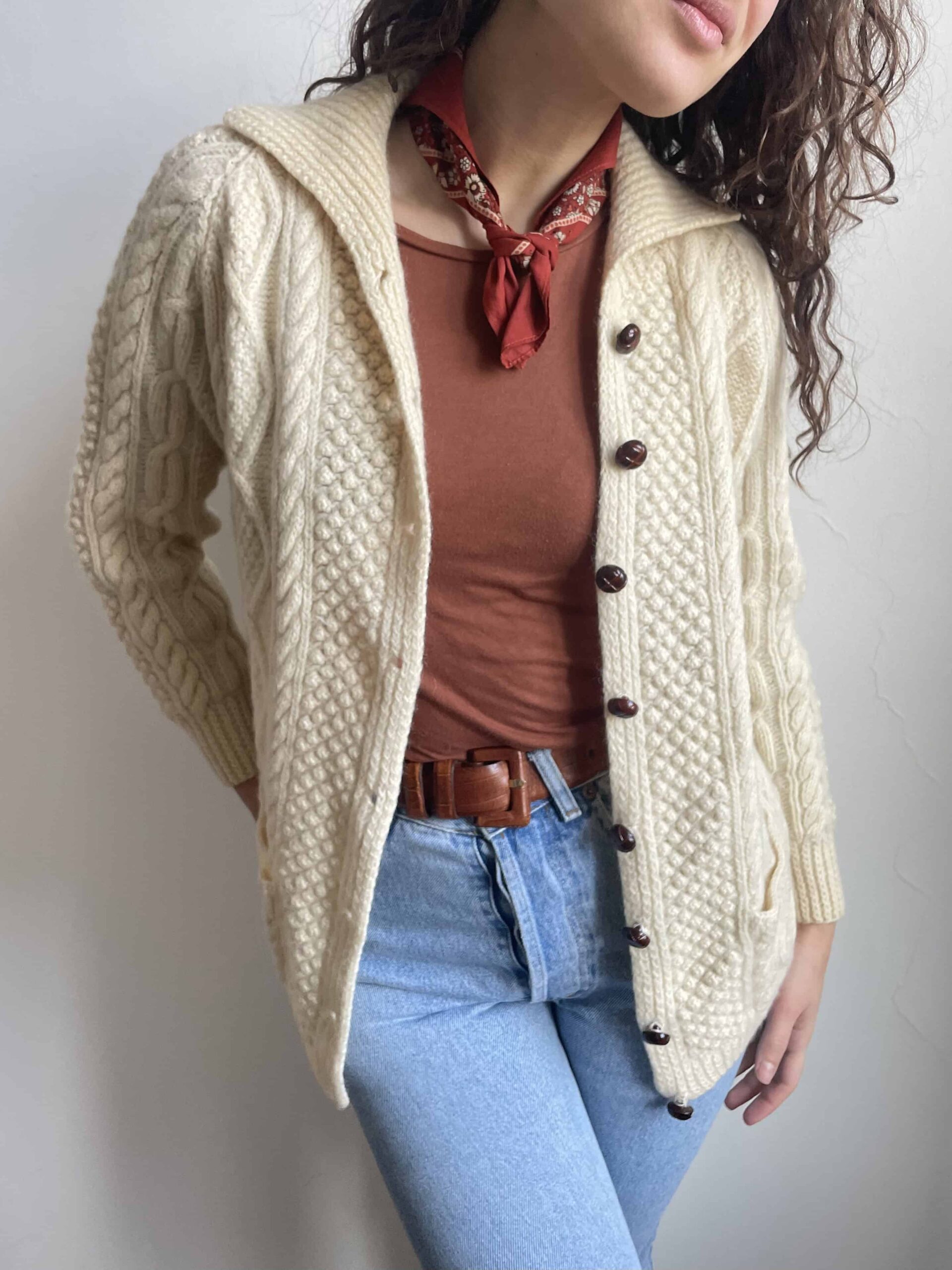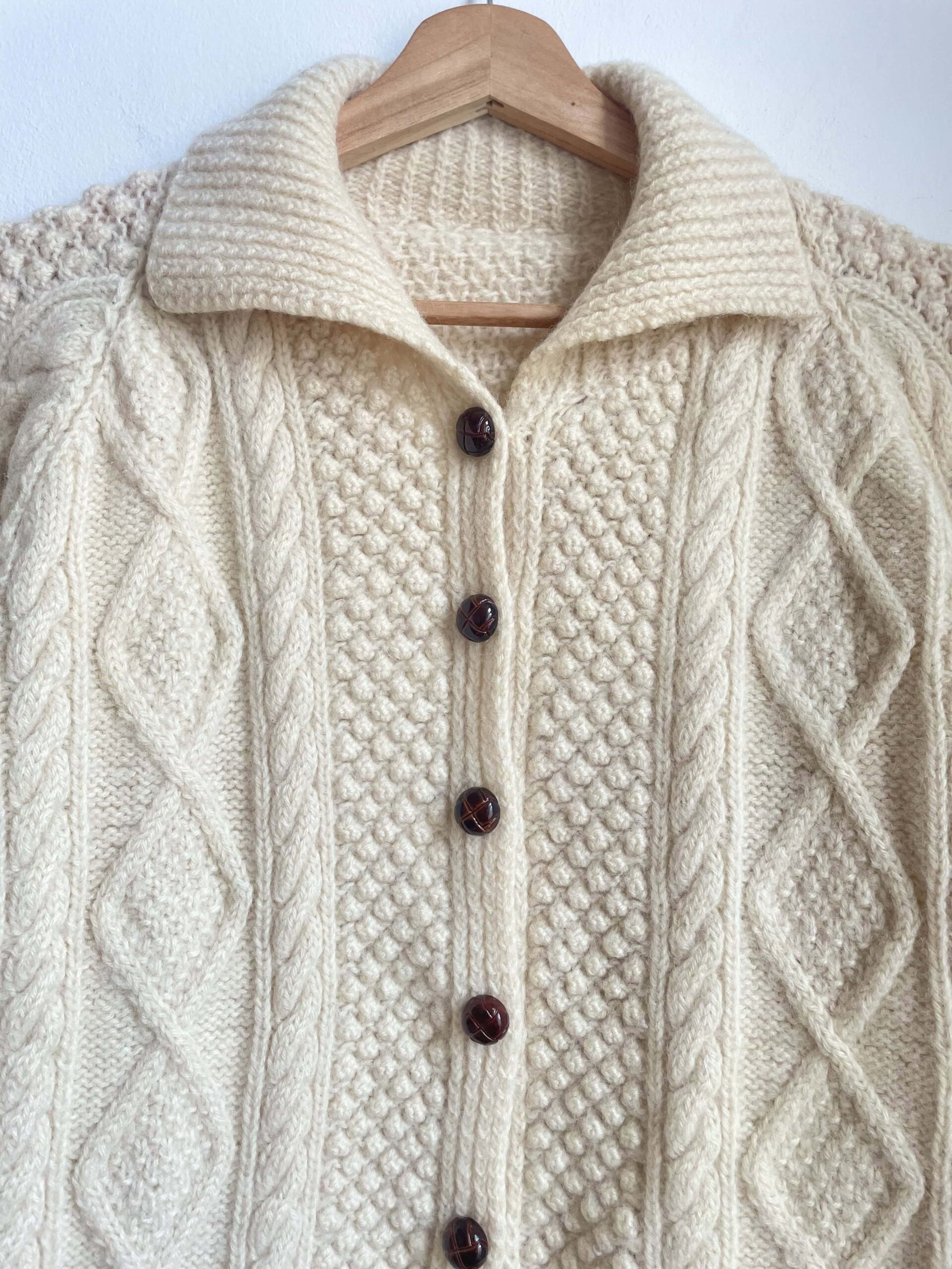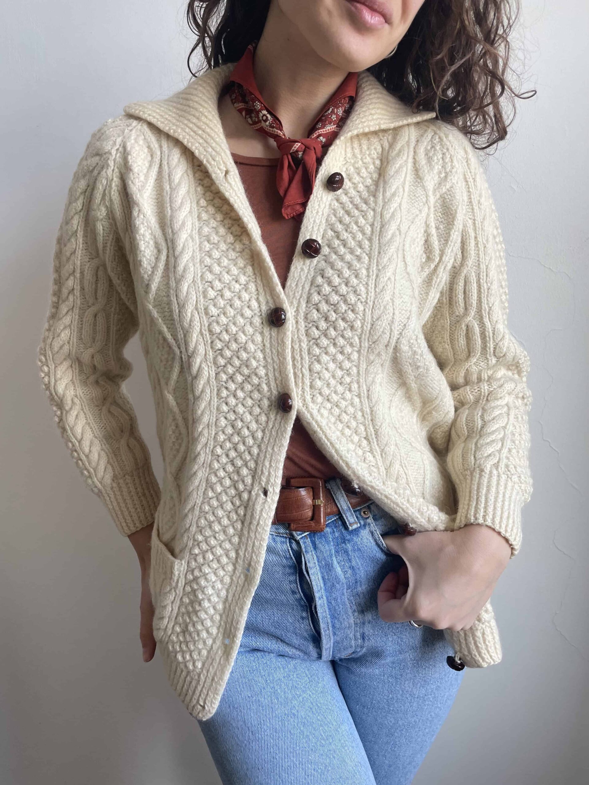 Cardigan vintage da donna in 100% pura lana bianco panna. Bellissima fattura con colletto e lavorazione a trecce. Splendidi bottoni marroni con effetto intrecciato. É molto spesso e caldo, di ottima qualità. Bella vestibilità grazie alle spalle raglan (senza cuciture sulle spalle). Taglia indicativa 42 abbondante. Fate riferimento alle misure confrontandole con quelle di un vostro maglione: