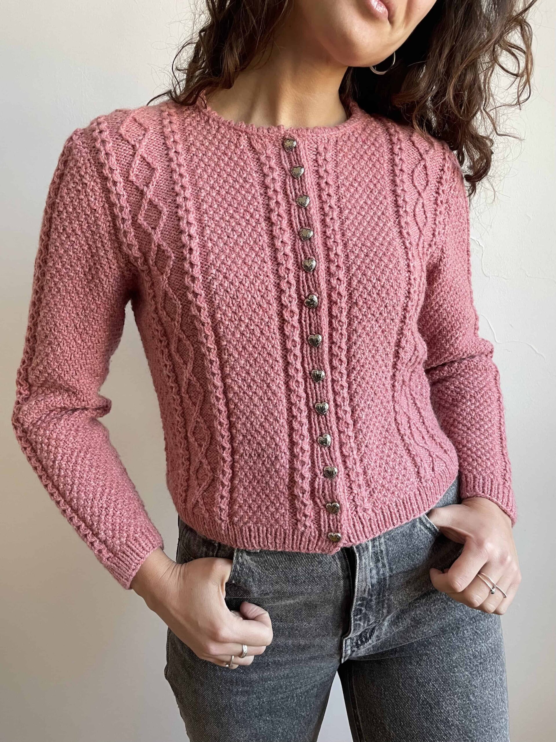 Cardigan vintage realizzato a mano in 100% pura lana rosa. Bellissima lavorazione a trecce e bottoni argentati a forma di cuore. La lana è spessa e morbida e non punge sulla pelle. Veste bene sia una 40 e 42. Fate riferimento alle misure confrontandole con quelle di un vostro maglione: