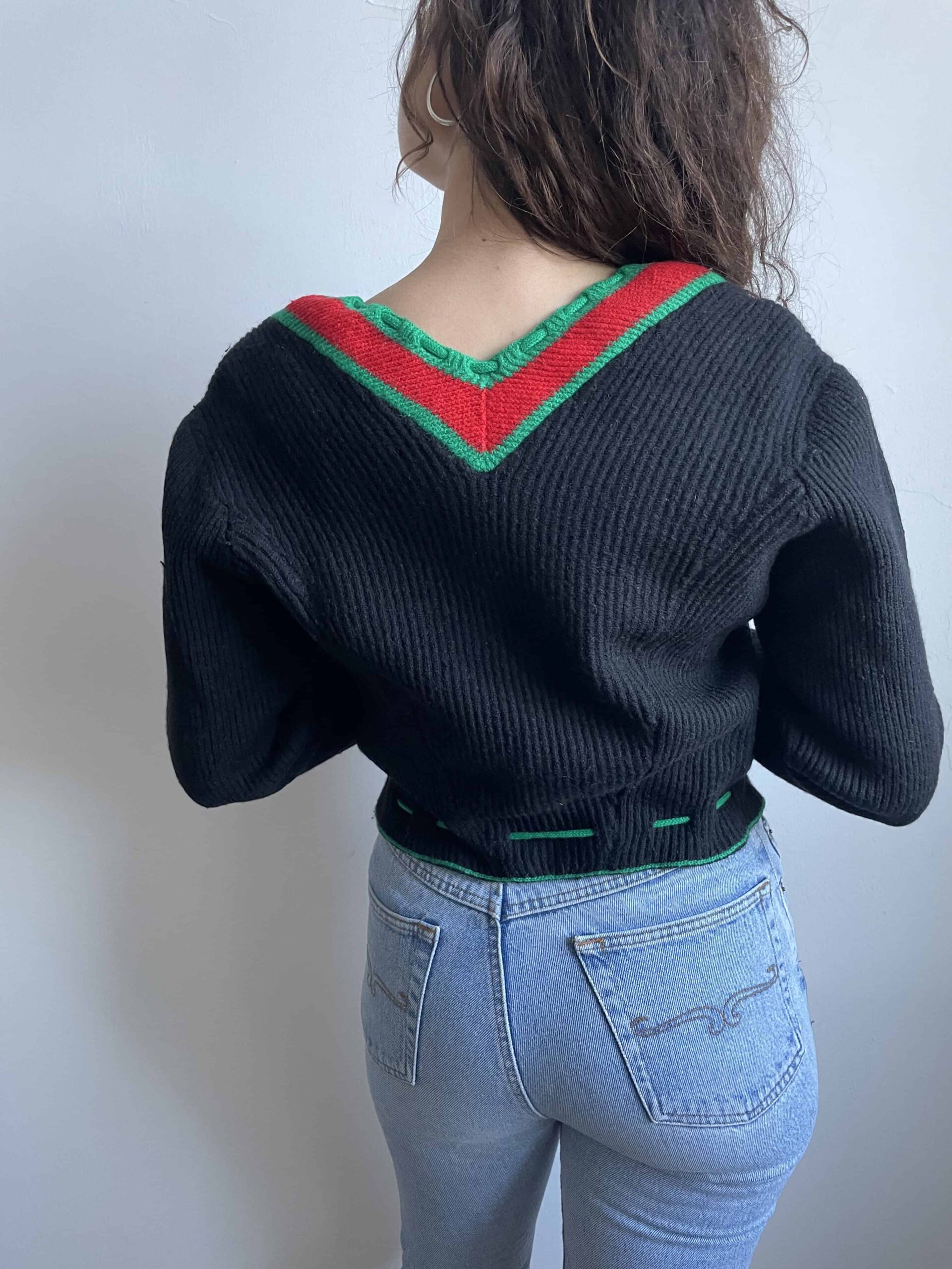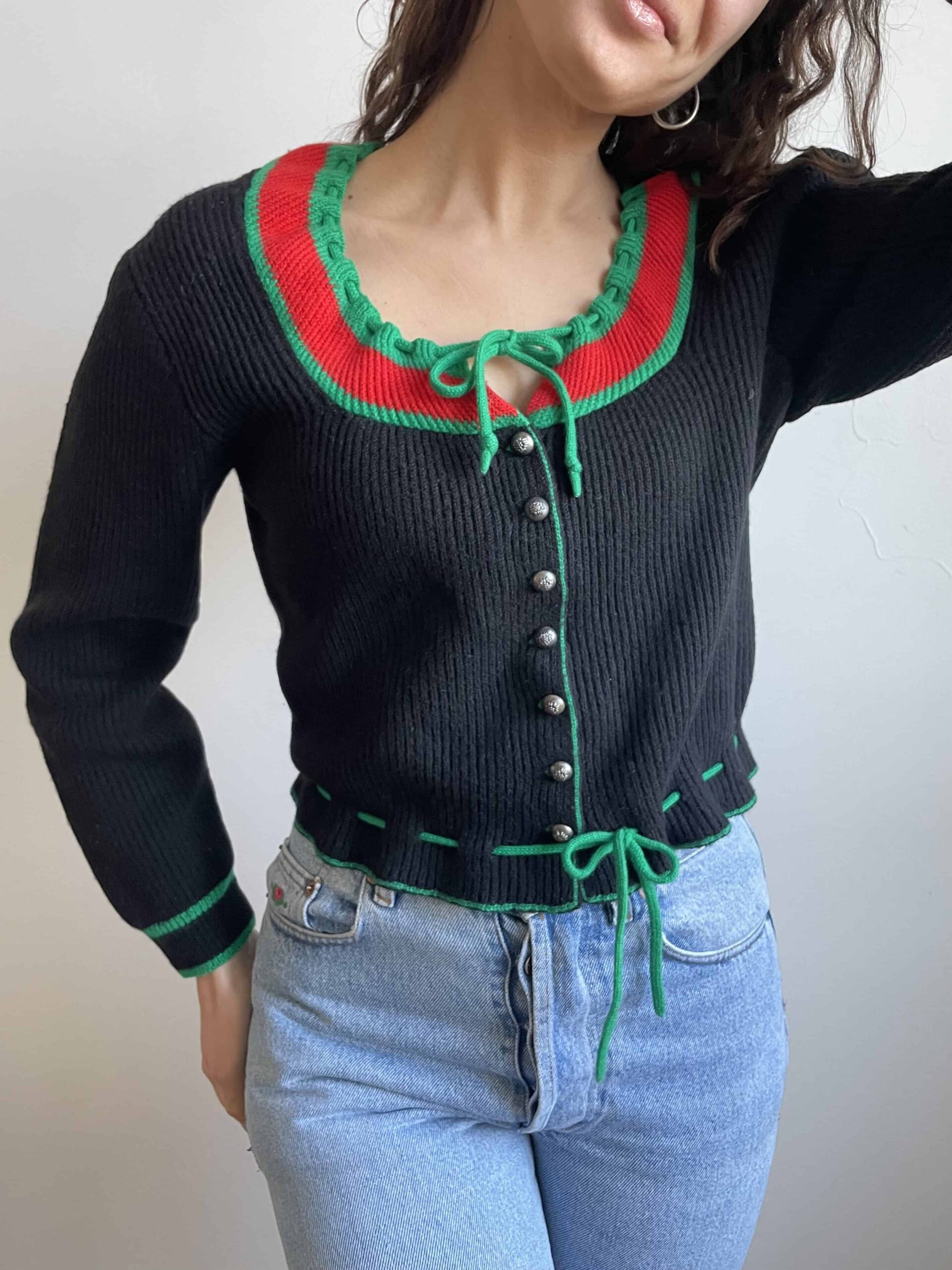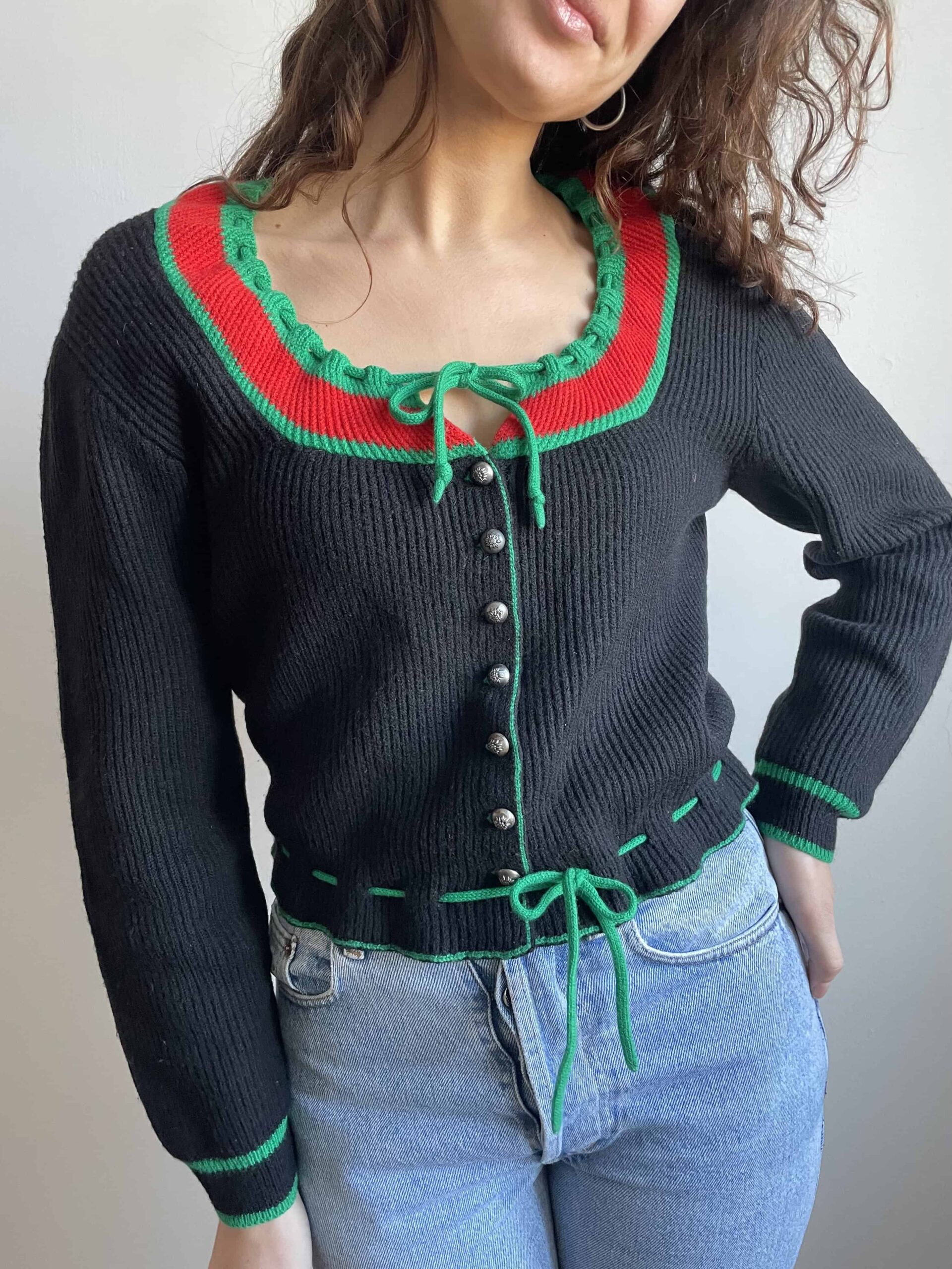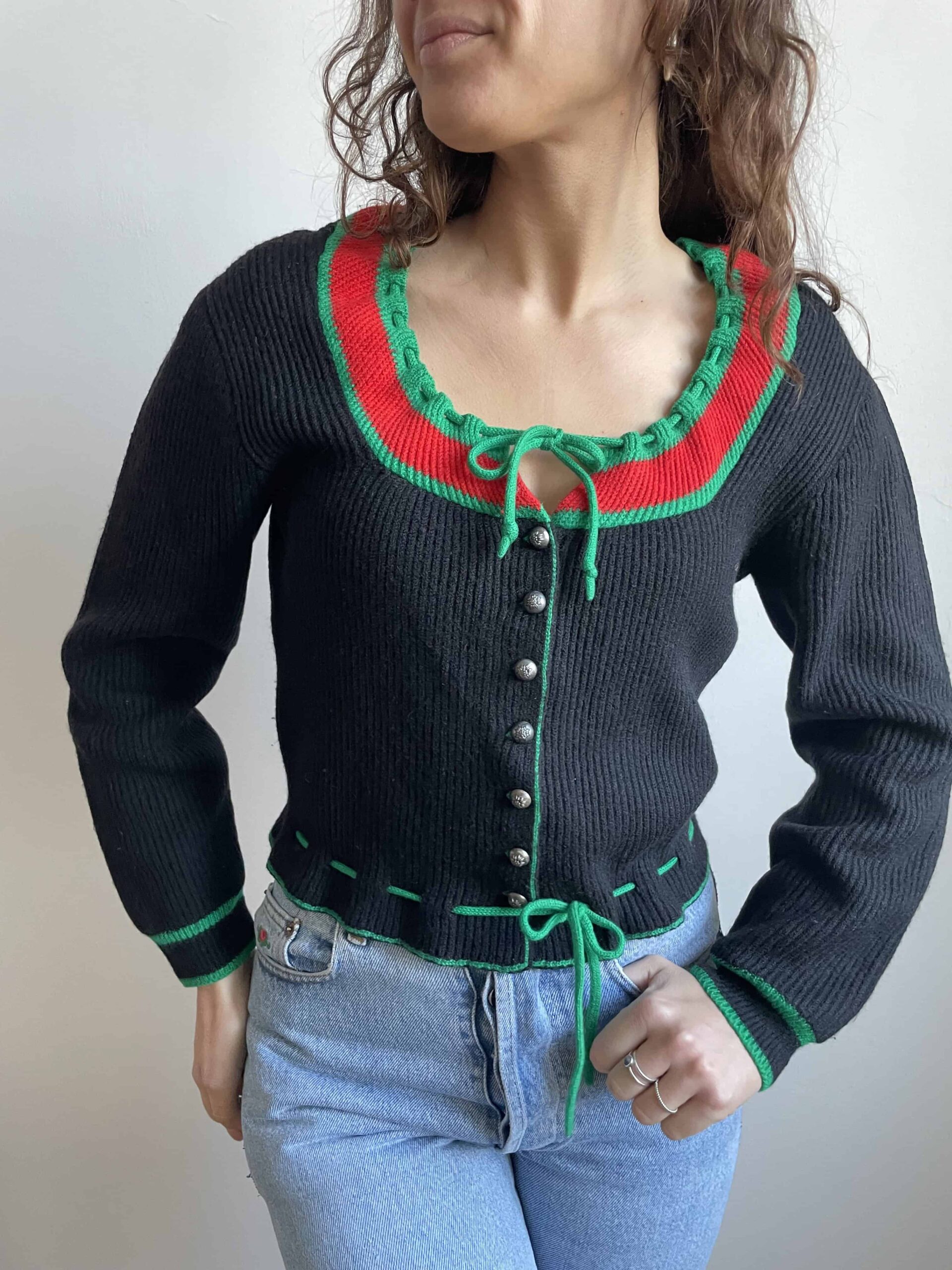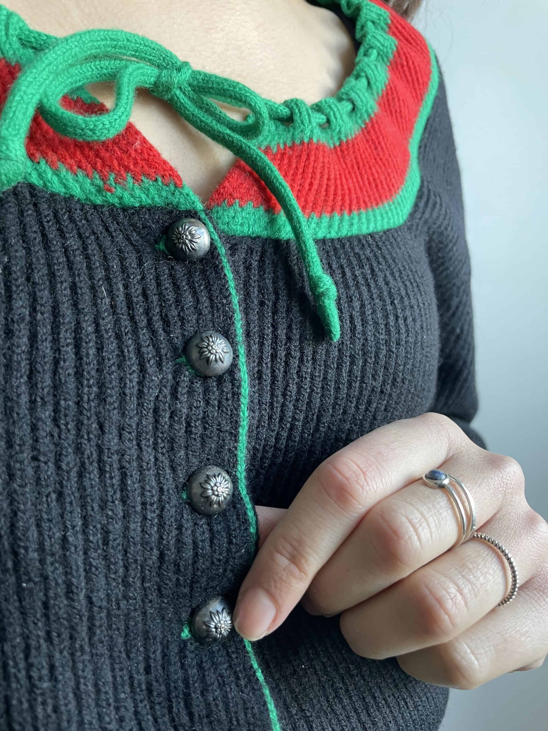 Cardigan vintage tirolese in lana nero con nastri verdi