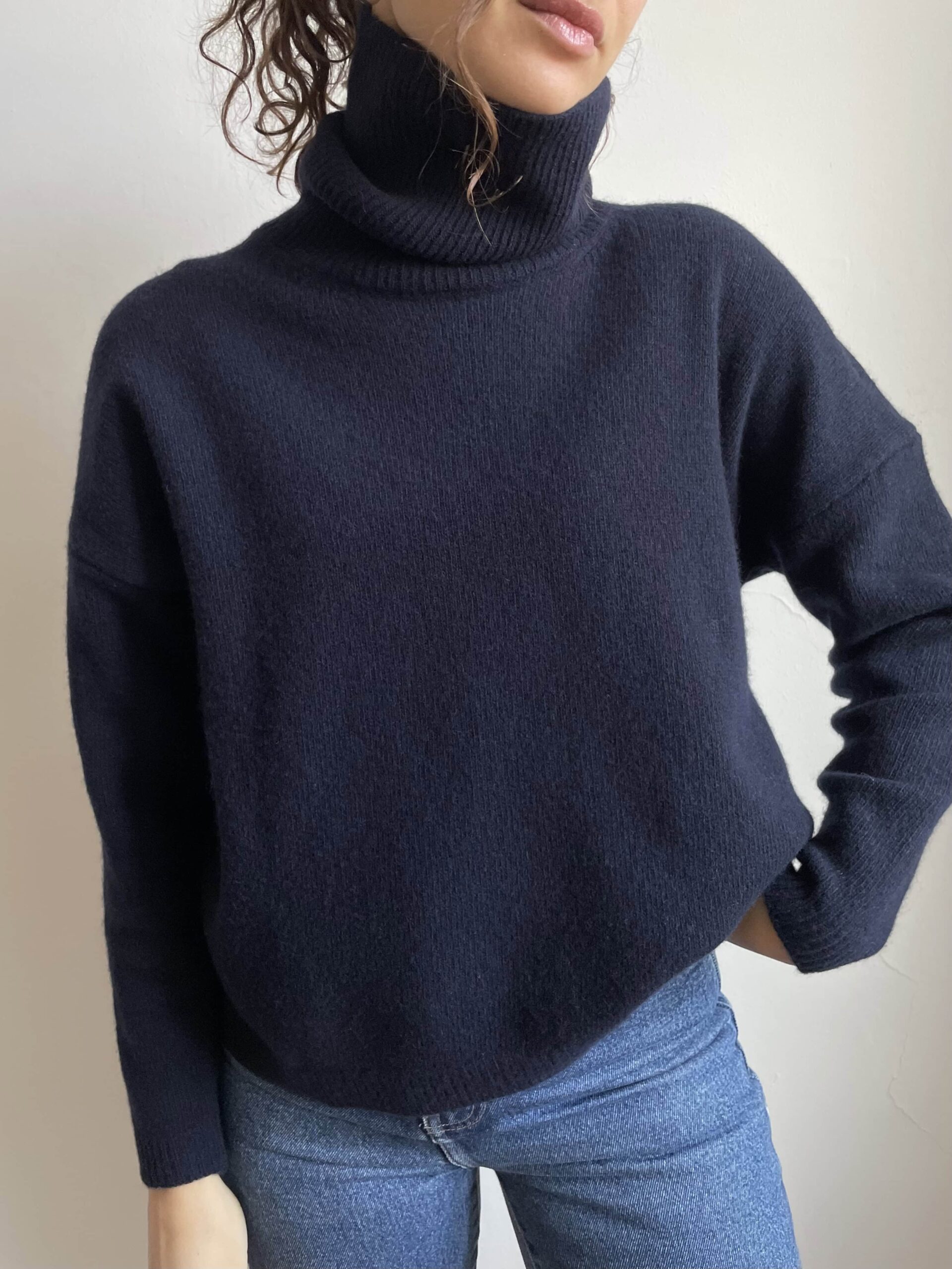 Maglione nuovo, di alta qualità e prodotto in Italia. Pregiata composizione in 100% pura lana merino, medio peso, sofficissima e piacevolissima al tatto, si può tranquillamente indossare a contatto con la pelle. Modello dolcevita, color blu navy. Vestibilità ampia e comoda ma che si adatta bene a più taglie, indicativamente da una 40 ad una 48 (in foto la vedete indossata su di me, una 42 alta 1.70). Fate riferimento alle misure confrontandole con quelle di un vostro maglione:
