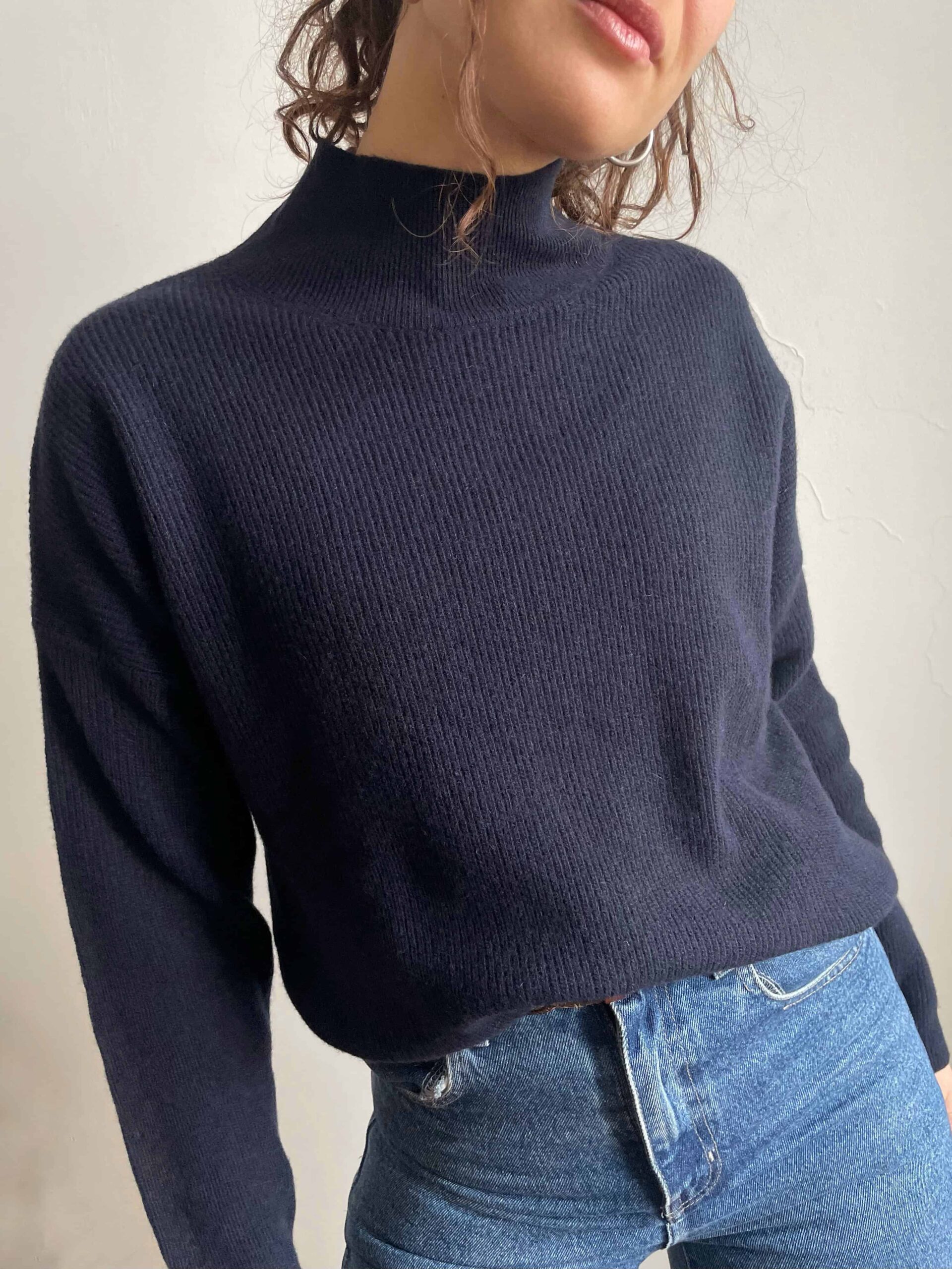 Maglione nuovo, di alta qualità e prodotto in Italia. Pregiata composizione in 100% pura lana merino, peso sottile/medio, morbida e piacevolissima al tatto, si può tranquillamente indossare a contatto con la pelle. Modello con collo a lupetto color blu navy. Vestibilità ampia e comoda ma che si adatta bene a più taglie, indicativamente da una 40 ad una 46/48 (in foto la vedete indossata su di me, una 42 alta 1.70). Fate riferimento alle misure confrontandole con quelle di un vostro maglione: