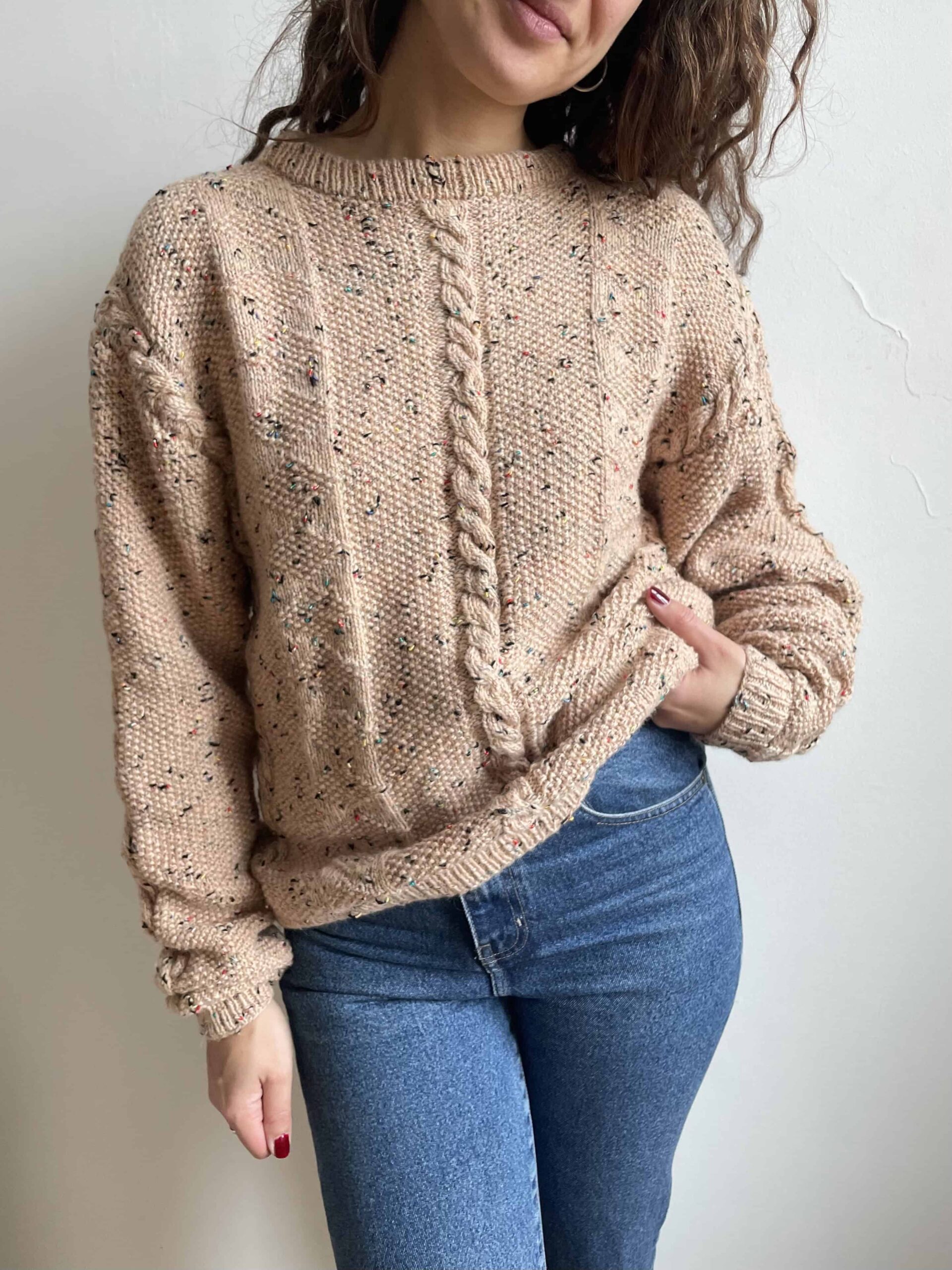 Maglione vintage realizzato interamente a mano. Filato colore beige, con inserti con fili colorati (vedete bene il tessuto in ultima foto). Molto spesso e caldo, sicuramente un misto lana. Bella lavorazione a trecce, anche sul alto della manica. Taglia indicativa 44, ma sta bene anche su taglie più piccole con effetto oversize come in foto. Fate riferimento alle misure confrontandole con quelle di una vostra maglia: