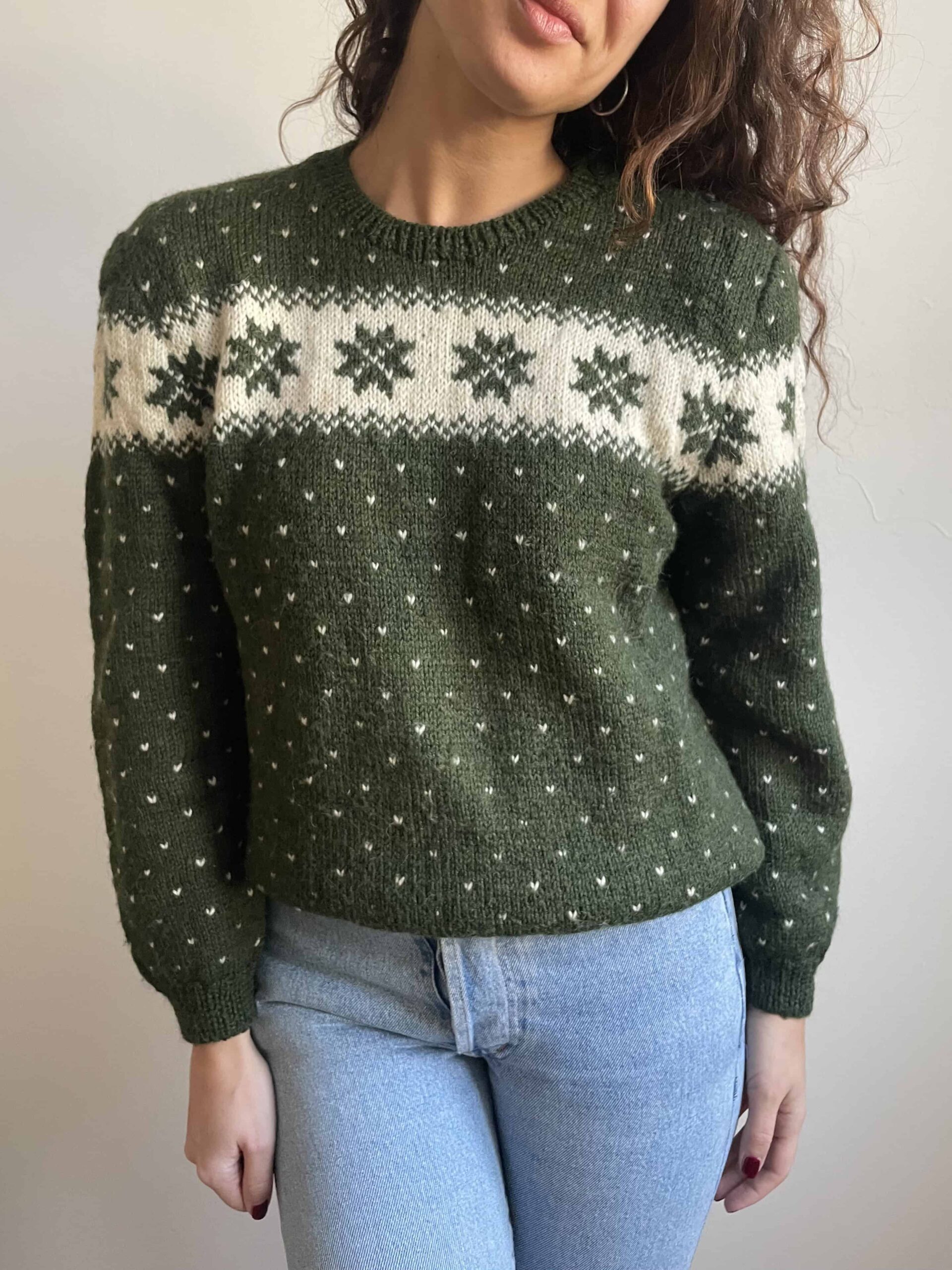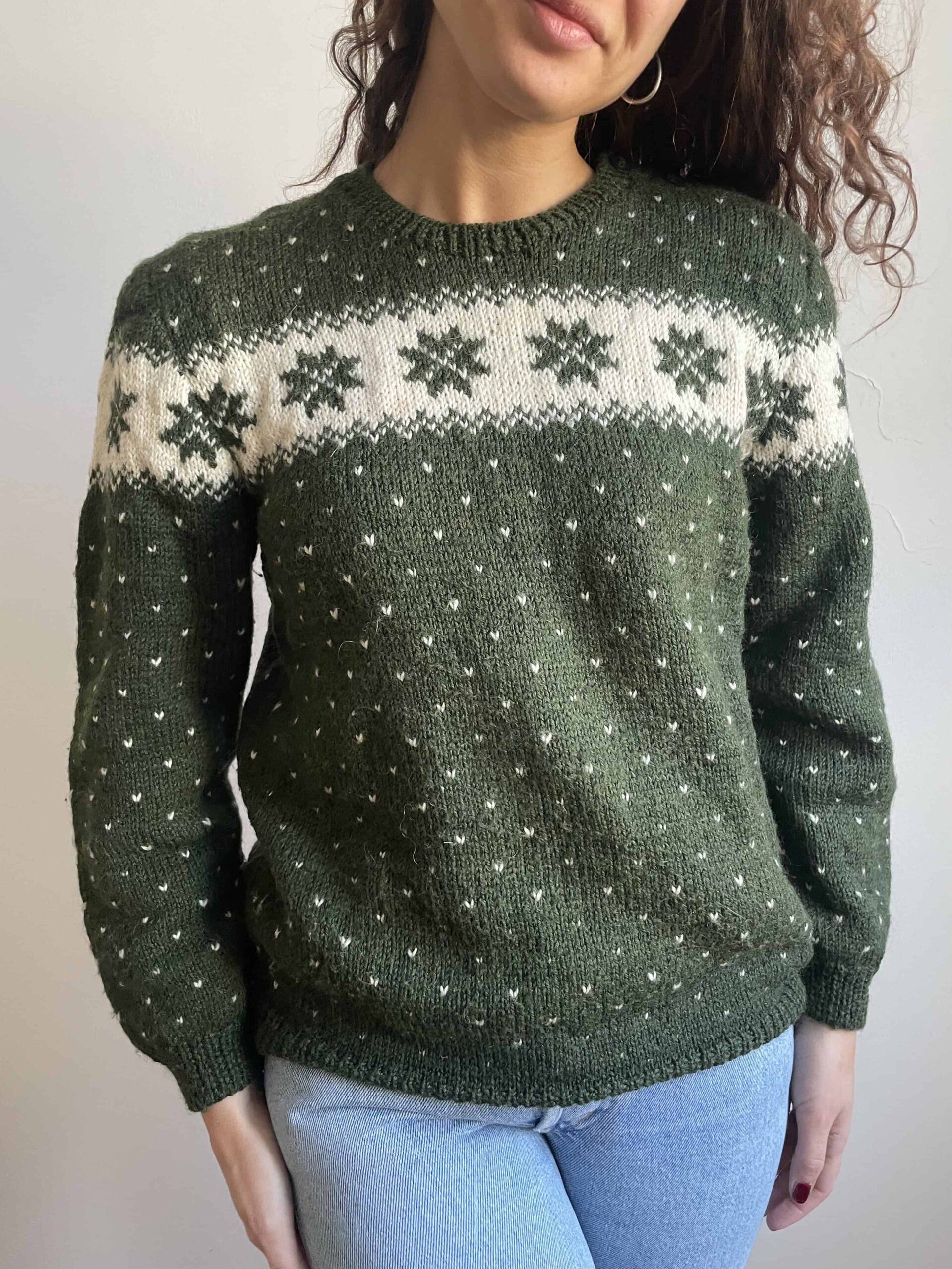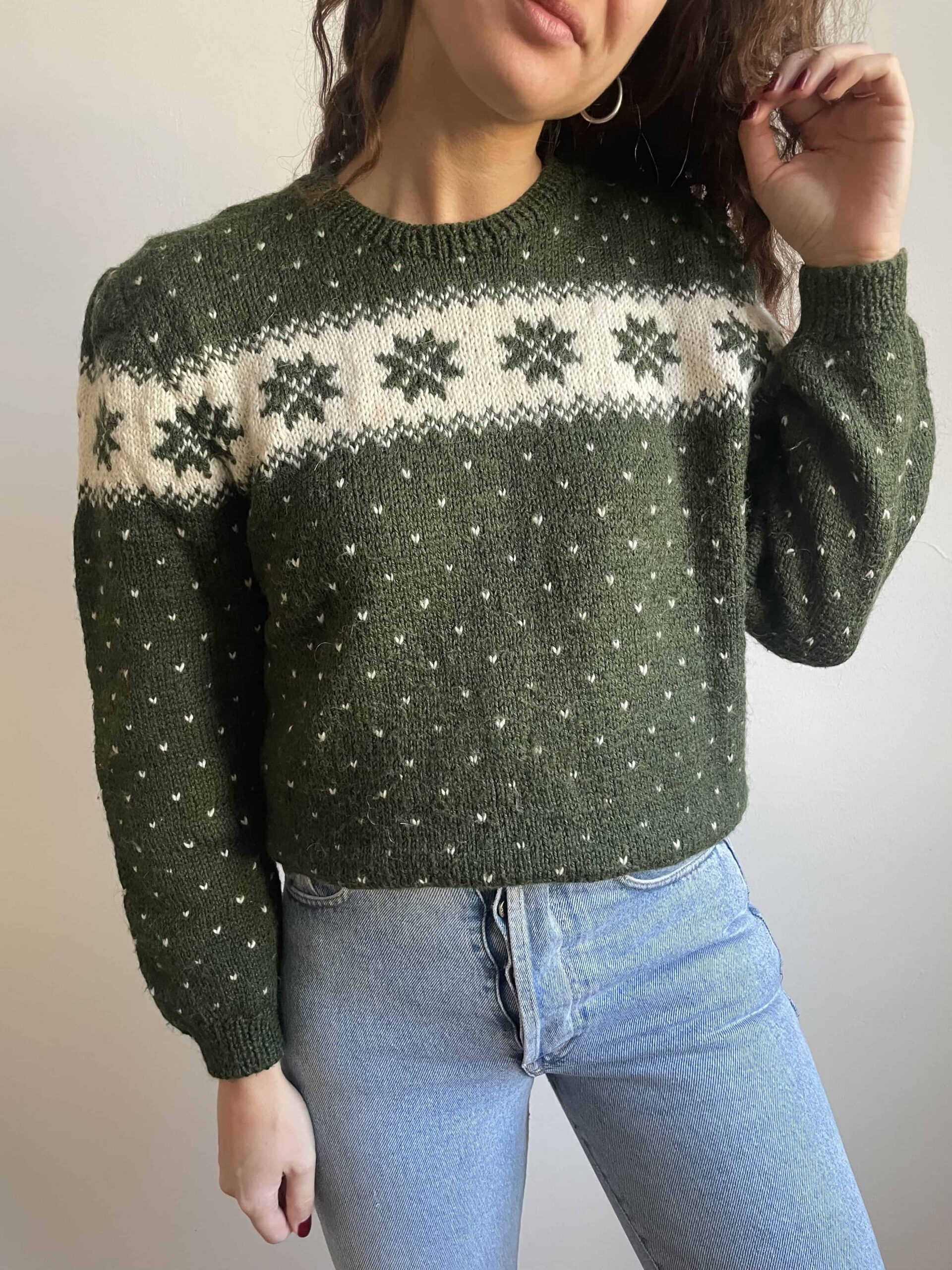 Maglione vintage nordico fatto a mano 100% lana verde e bianco