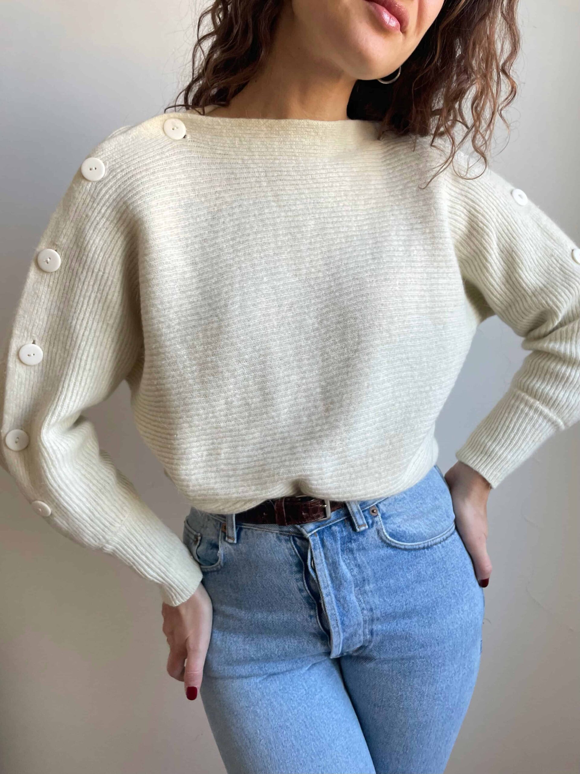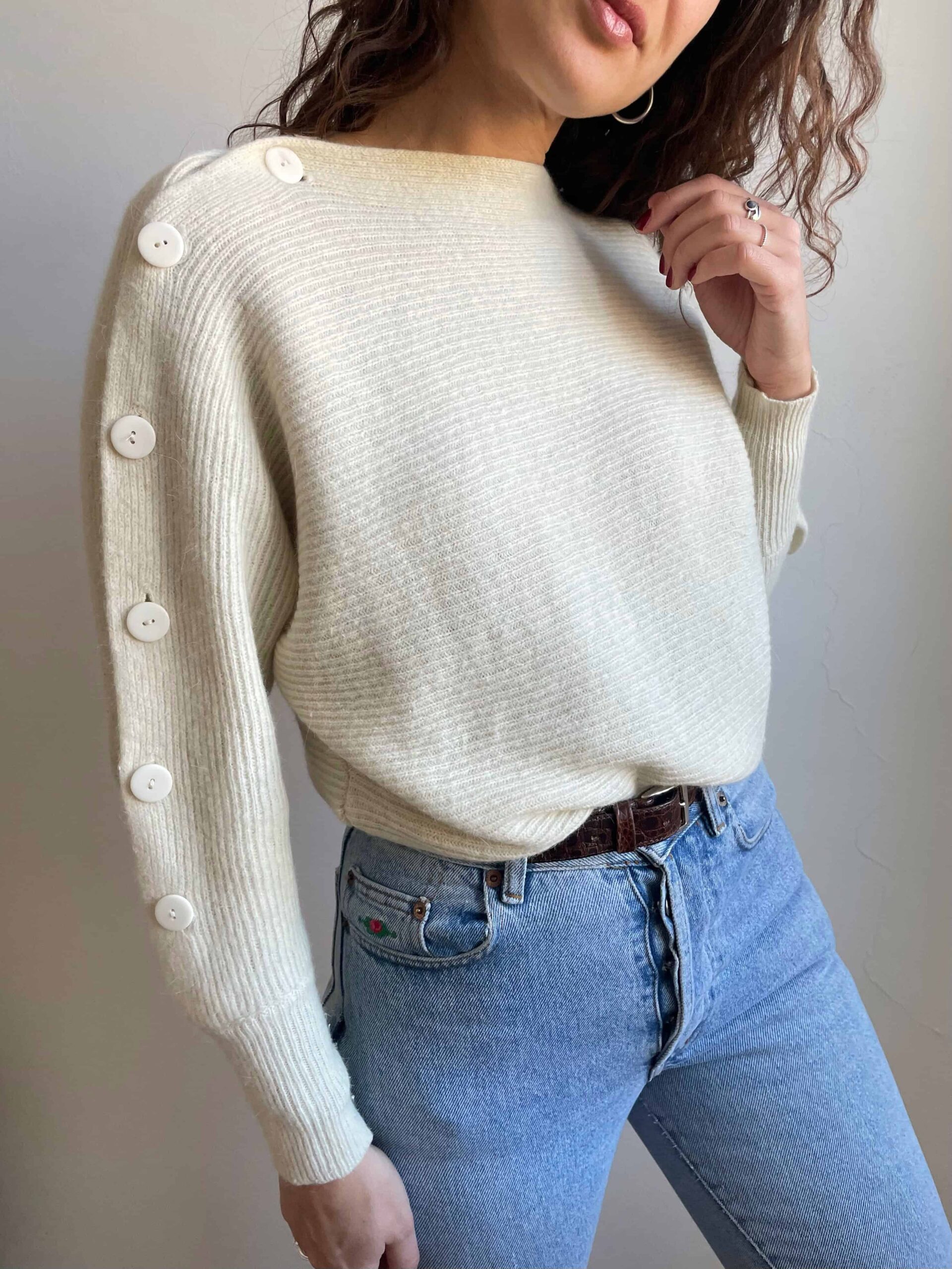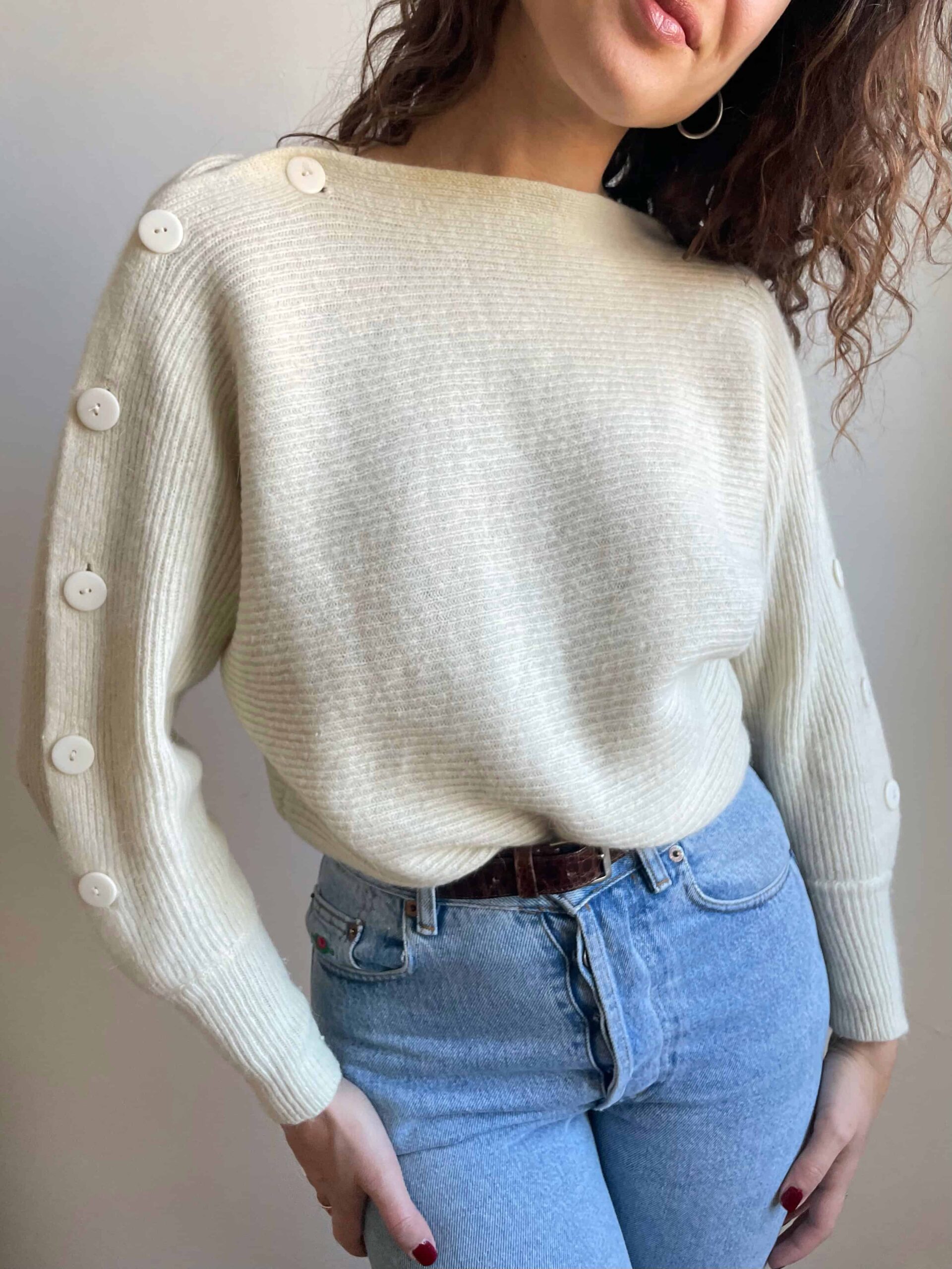 Splendido vintage soffice bianco con bellissima fattura: maniche a pipistrello, senza cuciture sulle spalle, collo a barchetto e bottoni lungo entrambe le maniche. I bottoni hanno delle vere asole quindi risulta davvero molto bello e particolare. Bordo inferiore e polsini a costine e più aderenti. Tessuto di ottima qualità, spesso e soffice in pregiata 20% lana di angora, 70% lana di agnello e 10% poliammide. Lo consiglio ad una taglia 42, ma si adatta anche a taglie più piccole non avendo cuciture sulle spalle.