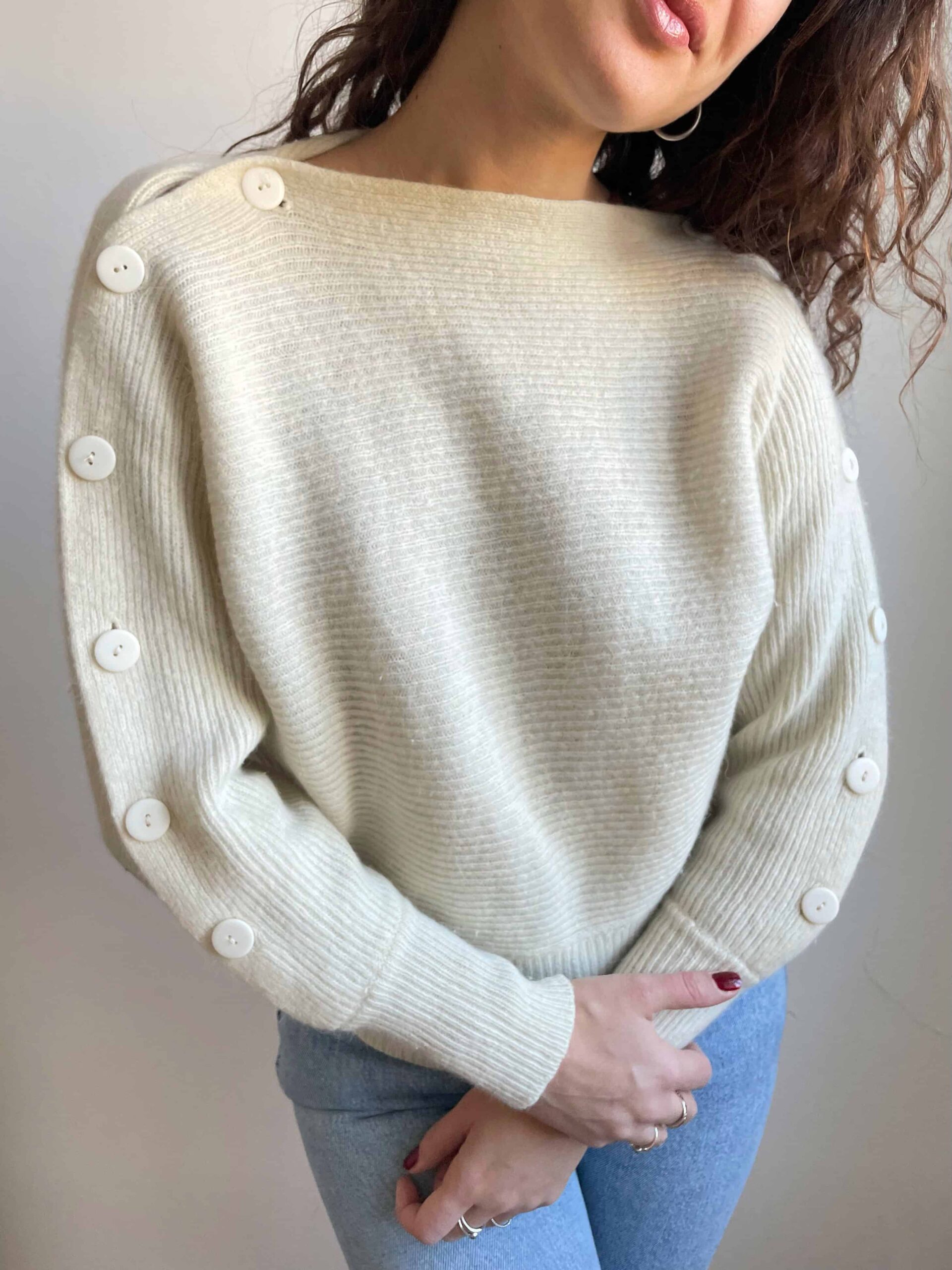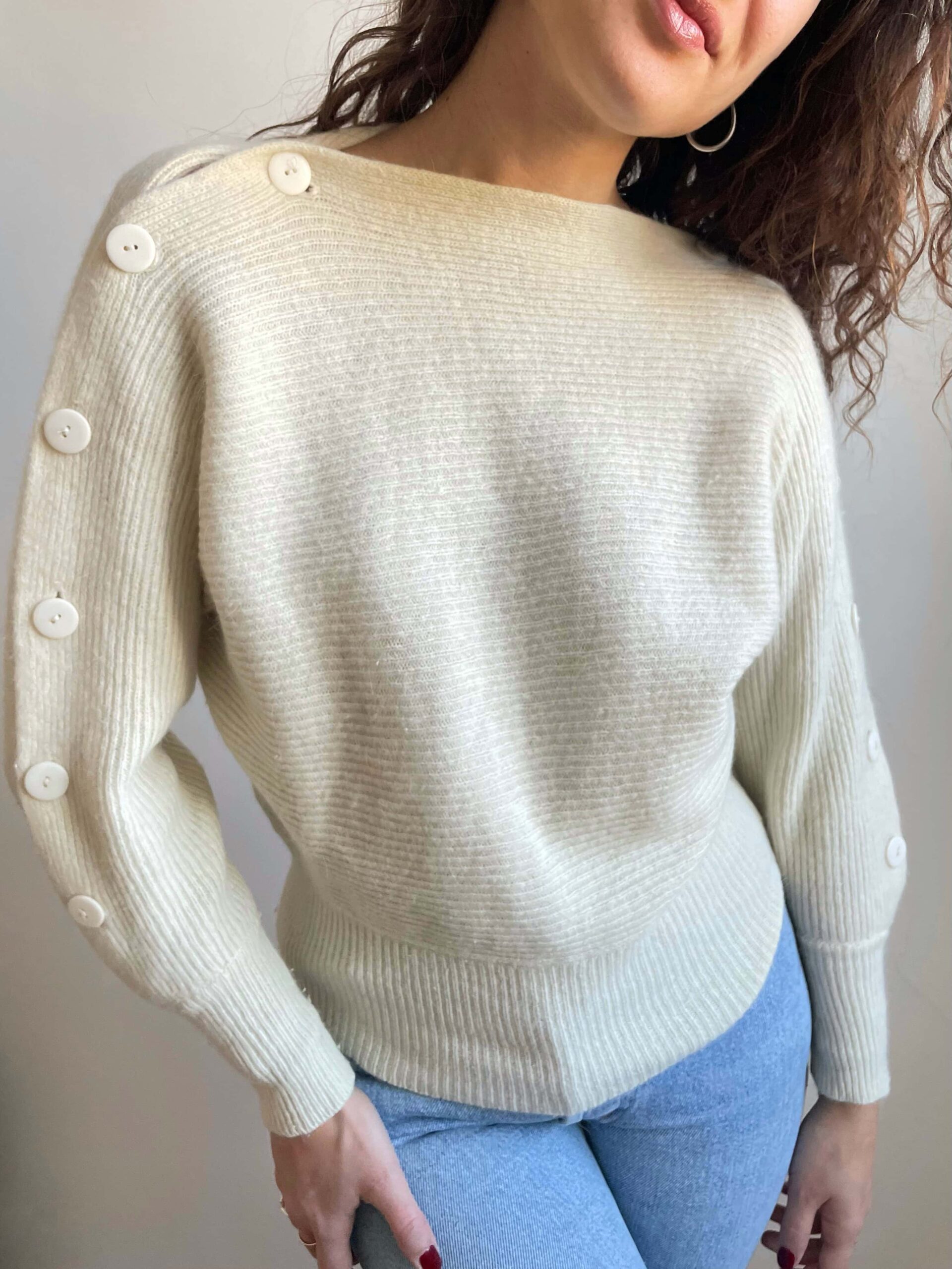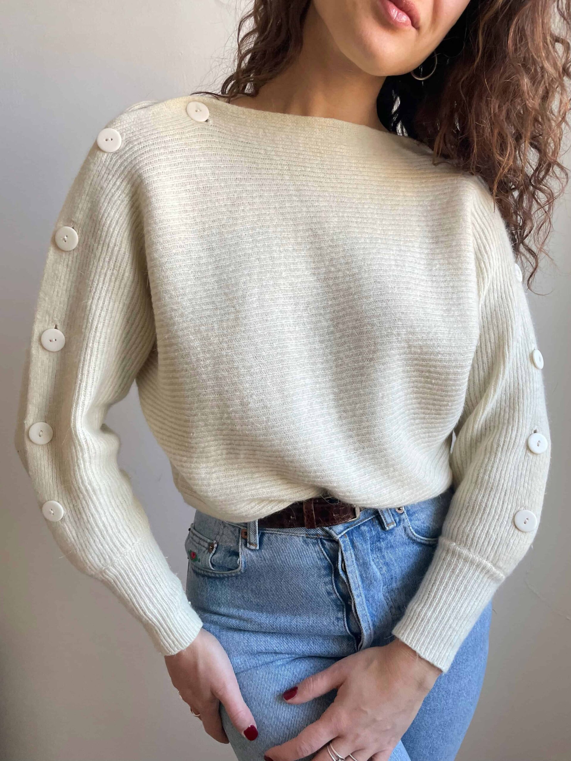 Splendido vintage soffice bianco con bellissima fattura: maniche a pipistrello, senza cuciture sulle spalle, collo a barchetto e bottoni lungo entrambe le maniche. I bottoni hanno delle vere asole quindi risulta davvero molto bello e particolare. Bordo inferiore e polsini a costine e più aderenti. Tessuto di ottima qualità, spesso e soffice in pregiata 20% lana di angora, 70% lana di agnello e 10% poliammide. Lo consiglio ad una taglia 42, ma si adatta anche a taglie più piccole non avendo cuciture sulle spalle.